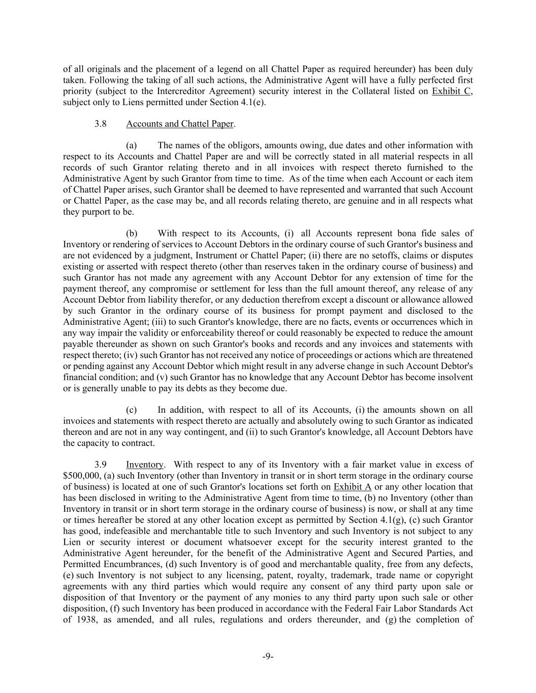 -9- of all originals and the placement of a legend on all Chattel Paper as required hereunder) has been duly taken. Following the taking of all such actions, the Administrative Agent will have a fully perfected first priority (subject to the Intercreditor Agreement) security interest in the Collateral listed on Exhibit C, subject only to Liens permitted under Section 4.1(e). 3.8 Accounts and Chattel Paper. (a) The names of the obligors, amounts owing, due dates and other information with respect to its Accounts and Chattel Paper are and will be correctly stated in all material respects in all records of such Grantor relating thereto and in all invoices with respect thereto furnished to the Administrative Agent by such Grantor from time to time. As of the time when each Account or each item of Chattel Paper arises, such Grantor shall be deemed to have represented and warranted that such Account or Chattel Paper, as the case may be, and all records relating thereto, are genuine and in all respects what they purport to be. (b) With respect to its Accounts, (i) all Accounts represent bona fide sales of Inventory or rendering of services to Account Debtors in the ordinary course of such Grantor's business and are not evidenced by a judgment, Instrument or Chattel Paper; (ii) there are no setoffs, claims or disputes existing or asserted with respect thereto (other than reserves taken in the ordinary course of business) and such Grantor has not made any agreement with any Account Debtor for any extension of time for the payment thereof, any compromise or settlement for less than the full amount thereof, any release of any Account Debtor from liability therefor, or any deduction therefrom except a discount or allowance allowed by such Grantor in the ordinary course of its business for prompt payment and disclosed to the Administrative Agent; (iii) to such Grantor's knowledge, there are no facts, events or occurrences which in any way impair the validity or enforceability thereof or could reasonably be expected to reduce the amount payable thereunder as shown on such Grantor's books and records and any invoices and statements with respect thereto; (iv) such Grantor has not received any notice of proceedings or actions which are threatened or pending against any Account Debtor which might result in any adverse change in such Account Debtor's financial condition; and (v) such Grantor has no knowledge that any Account Debtor has become insolvent or is generally unable to pay its debts as they become due. (c) In addition, with respect to all of its Accounts, (i) the amounts shown on all invoices and statements with respect thereto are actually and absolutely owing to such Grantor as indicated thereon and are not in any way contingent, and (ii) to such Grantor's knowledge, all Account Debtors have the capacity to contract. 3.9 Inventory. With respect to any of its Inventory with a fair market value in excess of $500,000, (a) such Inventory (other than Inventory in transit or in short term storage in the ordinary course of business) is located at one of such Grantor's locations set forth on Exhibit A or any other location that has been disclosed in writing to the Administrative Agent from time to time, (b) no Inventory (other than Inventory in transit or in short term storage in the ordinary course of business) is now, or shall at any time or times hereafter be stored at any other location except as permitted by Section 4.1(g), (c) such Grantor has good, indefeasible and merchantable title to such Inventory and such Inventory is not subject to any Lien or security interest or document whatsoever except for the security interest granted to the Administrative Agent hereunder, for the benefit of the Administrative Agent and Secured Parties, and Permitted Encumbrances, (d) such Inventory is of good and merchantable quality, free from any defects, (e) such Inventory is not subject to any licensing, patent, royalty, trademark, trade name or copyright agreements with any third parties which would require any consent of any third party upon sale or disposition of that Inventory or the payment of any monies to any third party upon such sale or other disposition, (f) such Inventory has been produced in accordance with the Federal Fair Labor Standards Act of 1938, as amended, and all rules, regulations and orders thereunder, and (g) the completion of