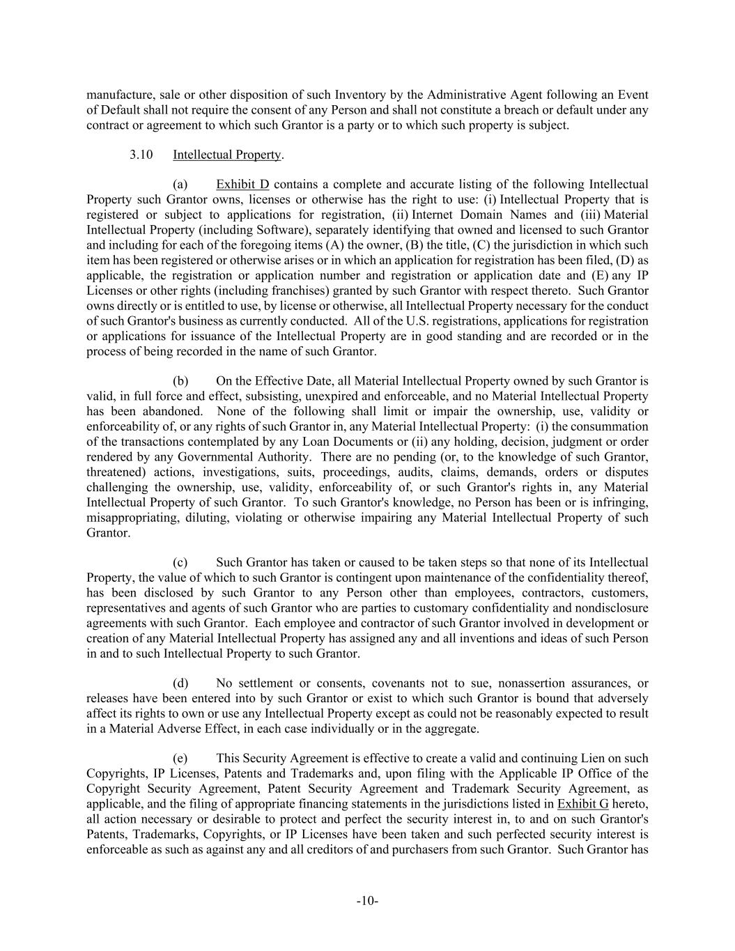 -10- manufacture, sale or other disposition of such Inventory by the Administrative Agent following an Event of Default shall not require the consent of any Person and shall not constitute a breach or default under any contract or agreement to which such Grantor is a party or to which such property is subject. 3.10 Intellectual Property. (a) Exhibit D contains a complete and accurate listing of the following Intellectual Property such Grantor owns, licenses or otherwise has the right to use: (i) Intellectual Property that is registered or subject to applications for registration, (ii) Internet Domain Names and (iii) Material Intellectual Property (including Software), separately identifying that owned and licensed to such Grantor and including for each of the foregoing items (A) the owner, (B) the title, (C) the jurisdiction in which such item has been registered or otherwise arises or in which an application for registration has been filed, (D) as applicable, the registration or application number and registration or application date and (E) any IP Licenses or other rights (including franchises) granted by such Grantor with respect thereto. Such Grantor owns directly or is entitled to use, by license or otherwise, all Intellectual Property necessary for the conduct of such Grantor's business as currently conducted. All of the U.S. registrations, applications for registration or applications for issuance of the Intellectual Property are in good standing and are recorded or in the process of being recorded in the name of such Grantor. (b) On the Effective Date, all Material Intellectual Property owned by such Grantor is valid, in full force and effect, subsisting, unexpired and enforceable, and no Material Intellectual Property has been abandoned. None of the following shall limit or impair the ownership, use, validity or enforceability of, or any rights of such Grantor in, any Material Intellectual Property: (i) the consummation of the transactions contemplated by any Loan Documents or (ii) any holding, decision, judgment or order rendered by any Governmental Authority. There are no pending (or, to the knowledge of such Grantor, threatened) actions, investigations, suits, proceedings, audits, claims, demands, orders or disputes challenging the ownership, use, validity, enforceability of, or such Grantor's rights in, any Material Intellectual Property of such Grantor. To such Grantor's knowledge, no Person has been or is infringing, misappropriating, diluting, violating or otherwise impairing any Material Intellectual Property of such Grantor. (c) Such Grantor has taken or caused to be taken steps so that none of its Intellectual Property, the value of which to such Grantor is contingent upon maintenance of the confidentiality thereof, has been disclosed by such Grantor to any Person other than employees, contractors, customers, representatives and agents of such Grantor who are parties to customary confidentiality and nondisclosure agreements with such Grantor. Each employee and contractor of such Grantor involved in development or creation of any Material Intellectual Property has assigned any and all inventions and ideas of such Person in and to such Intellectual Property to such Grantor. (d) No settlement or consents, covenants not to sue, nonassertion assurances, or releases have been entered into by such Grantor or exist to which such Grantor is bound that adversely affect its rights to own or use any Intellectual Property except as could not be reasonably expected to result in a Material Adverse Effect, in each case individually or in the aggregate. (e) This Security Agreement is effective to create a valid and continuing Lien on such Copyrights, IP Licenses, Patents and Trademarks and, upon filing with the Applicable IP Office of the Copyright Security Agreement, Patent Security Agreement and Trademark Security Agreement, as applicable, and the filing of appropriate financing statements in the jurisdictions listed in Exhibit G hereto, all action necessary or desirable to protect and perfect the security interest in, to and on such Grantor's Patents, Trademarks, Copyrights, or IP Licenses have been taken and such perfected security interest is enforceable as such as against any and all creditors of and purchasers from such Grantor. Such Grantor has