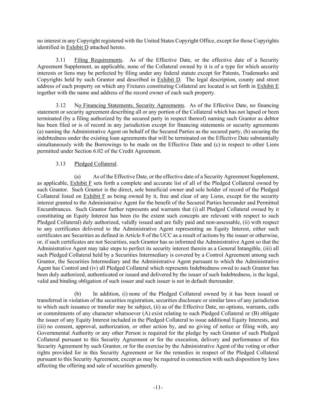 -11- no interest in any Copyright registered with the United States Copyright Office, except for those Copyrights identified in Exhibit D attached hereto. 3.11 Filing Requirements. As of the Effective Date, or the effective date of a Security Agreement Supplement, as applicable, none of the Collateral owned by it is of a type for which security interests or liens may be perfected by filing under any federal statute except for Patents, Trademarks and Copyrights held by such Grantor and described in Exhibit D. The legal description, county and street address of each property on which any Fixtures constituting Collateral are located is set forth in Exhibit E together with the name and address of the record owner of each such property. 3.12 No Financing Statements, Security Agreements. As of the Effective Date, no financing statement or security agreement describing all or any portion of the Collateral which has not lapsed or been terminated (by a filing authorized by the secured party in respect thereof) naming such Grantor as debtor has been filed or is of record in any jurisdiction except for financing statements or security agreements (a) naming the Administrative Agent on behalf of the Secured Parties as the secured party, (b) securing the indebtedness under the existing loan agreements that will be terminated on the Effective Date substantially simultaneously with the Borrowings to be made on the Effective Date and (c) in respect to other Liens permitted under Section 6.02 of the Credit Agreement. 3.13 Pledged Collateral. (a) As of the Effective Date, or the effective date of a Security Agreement Supplement, as applicable, Exhibit F sets forth a complete and accurate list of all of the Pledged Collateral owned by such Grantor. Such Grantor is the direct, sole beneficial owner and sole holder of record of the Pledged Collateral listed on Exhibit F as being owned by it, free and clear of any Liens, except for the security interest granted to the Administrative Agent for the benefit of the Secured Parties hereunder and Permitted Encumbrances. Such Grantor further represents and warrants that (i) all Pledged Collateral owned by it constituting an Equity Interest has been (to the extent such concepts are relevant with respect to such Pledged Collateral) duly authorized, validly issued and are fully paid and non-assessable, (ii) with respect to any certificates delivered to the Administrative Agent representing an Equity Interest, either such certificates are Securities as defined in Article 8 of the UCC as a result of actions by the issuer or otherwise, or, if such certificates are not Securities, such Grantor has so informed the Administrative Agent so that the Administrative Agent may take steps to perfect its security interest therein as a General Intangible, (iii) all such Pledged Collateral held by a Securities Intermediary is covered by a Control Agreement among such Grantor, the Securities Intermediary and the Administrative Agent pursuant to which the Administrative Agent has Control and (iv) all Pledged Collateral which represents Indebtedness owed to such Grantor has been duly authorized, authenticated or issued and delivered by the issuer of such Indebtedness, is the legal, valid and binding obligation of such issuer and such issuer is not in default thereunder. (b) In addition, (i) none of the Pledged Collateral owned by it has been issued or transferred in violation of the securities registration, securities disclosure or similar laws of any jurisdiction to which such issuance or transfer may be subject, (ii) as of the Effective Date, no options, warrants, calls or commitments of any character whatsoever (A) exist relating to such Pledged Collateral or (B) obligate the issuer of any Equity Interest included in the Pledged Collateral to issue additional Equity Interests, and (iii) no consent, approval, authorization, or other action by, and no giving of notice or filing with, any Governmental Authority or any other Person is required for the pledge by such Grantor of such Pledged Collateral pursuant to this Security Agreement or for the execution, delivery and performance of this Security Agreement by such Grantor, or for the exercise by the Administrative Agent of the voting or other rights provided for in this Security Agreement or for the remedies in respect of the Pledged Collateral pursuant to this Security Agreement, except as may be required in connection with such disposition by laws affecting the offering and sale of securities generally.