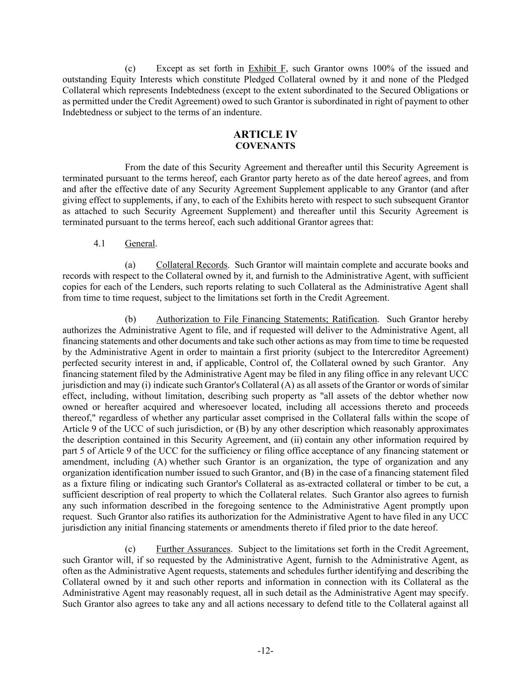 -12- (c) Except as set forth in Exhibit F, such Grantor owns 100% of the issued and outstanding Equity Interests which constitute Pledged Collateral owned by it and none of the Pledged Collateral which represents Indebtedness (except to the extent subordinated to the Secured Obligations or as permitted under the Credit Agreement) owed to such Grantor is subordinated in right of payment to other Indebtedness or subject to the terms of an indenture. ARTICLE IV COVENANTS From the date of this Security Agreement and thereafter until this Security Agreement is terminated pursuant to the terms hereof, each Grantor party hereto as of the date hereof agrees, and from and after the effective date of any Security Agreement Supplement applicable to any Grantor (and after giving effect to supplements, if any, to each of the Exhibits hereto with respect to such subsequent Grantor as attached to such Security Agreement Supplement) and thereafter until this Security Agreement is terminated pursuant to the terms hereof, each such additional Grantor agrees that: 4.1 General. (a) Collateral Records. Such Grantor will maintain complete and accurate books and records with respect to the Collateral owned by it, and furnish to the Administrative Agent, with sufficient copies for each of the Lenders, such reports relating to such Collateral as the Administrative Agent shall from time to time request, subject to the limitations set forth in the Credit Agreement. (b) Authorization to File Financing Statements; Ratification. Such Grantor hereby authorizes the Administrative Agent to file, and if requested will deliver to the Administrative Agent, all financing statements and other documents and take such other actions as may from time to time be requested by the Administrative Agent in order to maintain a first priority (subject to the Intercreditor Agreement) perfected security interest in and, if applicable, Control of, the Collateral owned by such Grantor. Any financing statement filed by the Administrative Agent may be filed in any filing office in any relevant UCC jurisdiction and may (i) indicate such Grantor's Collateral (A) as all assets of the Grantor or words of similar effect, including, without limitation, describing such property as "all assets of the debtor whether now owned or hereafter acquired and wheresoever located, including all accessions thereto and proceeds thereof," regardless of whether any particular asset comprised in the Collateral falls within the scope of Article 9 of the UCC of such jurisdiction, or (B) by any other description which reasonably approximates the description contained in this Security Agreement, and (ii) contain any other information required by part 5 of Article 9 of the UCC for the sufficiency or filing office acceptance of any financing statement or amendment, including (A) whether such Grantor is an organization, the type of organization and any organization identification number issued to such Grantor, and (B) in the case of a financing statement filed as a fixture filing or indicating such Grantor's Collateral as as-extracted collateral or timber to be cut, a sufficient description of real property to which the Collateral relates. Such Grantor also agrees to furnish any such information described in the foregoing sentence to the Administrative Agent promptly upon request. Such Grantor also ratifies its authorization for the Administrative Agent to have filed in any UCC jurisdiction any initial financing statements or amendments thereto if filed prior to the date hereof. (c) Further Assurances. Subject to the limitations set forth in the Credit Agreement, such Grantor will, if so requested by the Administrative Agent, furnish to the Administrative Agent, as often as the Administrative Agent requests, statements and schedules further identifying and describing the Collateral owned by it and such other reports and information in connection with its Collateral as the Administrative Agent may reasonably request, all in such detail as the Administrative Agent may specify. Such Grantor also agrees to take any and all actions necessary to defend title to the Collateral against all