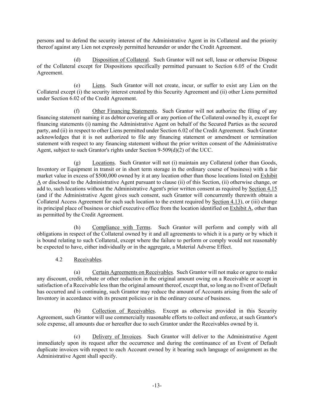 -13- persons and to defend the security interest of the Administrative Agent in its Collateral and the priority thereof against any Lien not expressly permitted hereunder or under the Credit Agreement. (d) Disposition of Collateral. Such Grantor will not sell, lease or otherwise Dispose of the Collateral except for Dispositions specifically permitted pursuant to Section 6.05 of the Credit Agreement. (e) Liens. Such Grantor will not create, incur, or suffer to exist any Lien on the Collateral except (i) the security interest created by this Security Agreement and (ii) other Liens permitted under Section 6.02 of the Credit Agreement. (f) Other Financing Statements. Such Grantor will not authorize the filing of any financing statement naming it as debtor covering all or any portion of the Collateral owned by it, except for financing statements (i) naming the Administrative Agent on behalf of the Secured Parties as the secured party, and (ii) in respect to other Liens permitted under Section 6.02 of the Credit Agreement. Such Grantor acknowledges that it is not authorized to file any financing statement or amendment or termination statement with respect to any financing statement without the prior written consent of the Administrative Agent, subject to such Grantor's rights under Section 9-509(d)(2) of the UCC. (g) Locations. Such Grantor will not (i) maintain any Collateral (other than Goods, Inventory or Equipment in transit or in short term storage in the ordinary course of business) with a fair market value in excess of $500,000 owned by it at any location other than those locations listed on Exhibit A or disclosed to the Administrative Agent pursuant to clause (ii) of this Section, (ii) otherwise change, or add to, such locations without the Administrative Agent's prior written consent as required by Section 4.15 (and if the Administrative Agent gives such consent, such Grantor will concurrently therewith obtain a Collateral Access Agreement for each such location to the extent required by Section 4.13), or (iii) change its principal place of business or chief executive office from the location identified on Exhibit A, other than as permitted by the Credit Agreement. (h) Compliance with Terms. Such Grantor will perform and comply with all obligations in respect of the Collateral owned by it and all agreements to which it is a party or by which it is bound relating to such Collateral, except where the failure to perform or comply would not reasonably be expected to have, either individually or in the aggregate, a Material Adverse Effect. 4.2 Receivables. (a) Certain Agreements on Receivables. Such Grantor will not make or agree to make any discount, credit, rebate or other reduction in the original amount owing on a Receivable or accept in satisfaction of a Receivable less than the original amount thereof, except that, so long as no Event of Default has occurred and is continuing, such Grantor may reduce the amount of Accounts arising from the sale of Inventory in accordance with its present policies or in the ordinary course of business. (b) Collection of Receivables. Except as otherwise provided in this Security Agreement, such Grantor will use commercially reasonable efforts to collect and enforce, at such Grantor's sole expense, all amounts due or hereafter due to such Grantor under the Receivables owned by it. (c) Delivery of Invoices. Such Grantor will deliver to the Administrative Agent immediately upon its request after the occurrence and during the continuance of an Event of Default duplicate invoices with respect to each Account owned by it bearing such language of assignment as the Administrative Agent shall specify.
