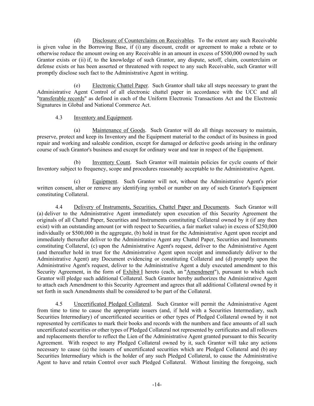 -14- (d) Disclosure of Counterclaims on Receivables. To the extent any such Receivable is given value in the Borrowing Base, if (i) any discount, credit or agreement to make a rebate or to otherwise reduce the amount owing on any Receivable in an amount in excess of $500,000 owned by such Grantor exists or (ii) if, to the knowledge of such Grantor, any dispute, setoff, claim, counterclaim or defense exists or has been asserted or threatened with respect to any such Receivable, such Grantor will promptly disclose such fact to the Administrative Agent in writing. (e) Electronic Chattel Paper. Such Grantor shall take all steps necessary to grant the Administrative Agent Control of all electronic chattel paper in accordance with the UCC and all "transferable records" as defined in each of the Uniform Electronic Transactions Act and the Electronic Signatures in Global and National Commerce Act. 4.3 Inventory and Equipment. (a) Maintenance of Goods. Such Grantor will do all things necessary to maintain, preserve, protect and keep its Inventory and the Equipment material to the conduct of its business in good repair and working and saleable condition, except for damaged or defective goods arising in the ordinary course of such Grantor's business and except for ordinary wear and tear in respect of the Equipment. (b) Inventory Count. Such Grantor will maintain policies for cycle counts of their Inventory subject to frequency, scope and procedures reasonably acceptable to the Administrative Agent. (c) Equipment. Such Grantor will not, without the Administrative Agent's prior written consent, alter or remove any identifying symbol or number on any of such Grantor's Equipment constituting Collateral. 4.4 Delivery of Instruments, Securities, Chattel Paper and Documents. Such Grantor will (a) deliver to the Administrative Agent immediately upon execution of this Security Agreement the originals of all Chattel Paper, Securities and Instruments constituting Collateral owned by it (if any then exist) with an outstanding amount (or with respect to Securities, a fair market value) in excess of $250,000 individually or $500,000 in the aggregate, (b) hold in trust for the Administrative Agent upon receipt and immediately thereafter deliver to the Administrative Agent any Chattel Paper, Securities and Instruments constituting Collateral, (c) upon the Administrative Agent's request, deliver to the Administrative Agent (and thereafter hold in trust for the Administrative Agent upon receipt and immediately deliver to the Administrative Agent) any Document evidencing or constituting Collateral and (d) promptly upon the Administrative Agent's request, deliver to the Administrative Agent a duly executed amendment to this Security Agreement, in the form of Exhibit I hereto (each, an "Amendment"), pursuant to which such Grantor will pledge such additional Collateral. Such Grantor hereby authorizes the Administrative Agent to attach each Amendment to this Security Agreement and agrees that all additional Collateral owned by it set forth in such Amendments shall be considered to be part of the Collateral. 4.5 Uncertificated Pledged Collateral. Such Grantor will permit the Administrative Agent from time to time to cause the appropriate issuers (and, if held with a Securities Intermediary, such Securities Intermediary) of uncertificated securities or other types of Pledged Collateral owned by it not represented by certificates to mark their books and records with the numbers and face amounts of all such uncertificated securities or other types of Pledged Collateral not represented by certificates and all rollovers and replacements therefor to reflect the Lien of the Administrative Agent granted pursuant to this Security Agreement. With respect to any Pledged Collateral owned by it, such Grantor will take any actions necessary to cause (a) the issuers of uncertificated securities which are Pledged Collateral and (b) any Securities Intermediary which is the holder of any such Pledged Collateral, to cause the Administrative Agent to have and retain Control over such Pledged Collateral. Without limiting the foregoing, such