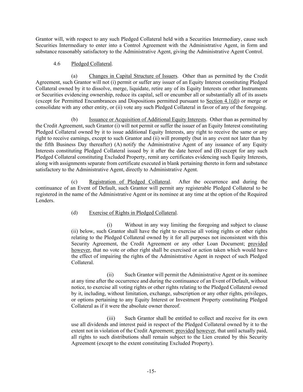-15- Grantor will, with respect to any such Pledged Collateral held with a Securities Intermediary, cause such Securities Intermediary to enter into a Control Agreement with the Administrative Agent, in form and substance reasonably satisfactory to the Administrative Agent, giving the Administrative Agent Control. 4.6 Pledged Collateral. (a) Changes in Capital Structure of Issuers. Other than as permitted by the Credit Agreement, such Grantor will not (i) permit or suffer any issuer of an Equity Interest constituting Pledged Collateral owned by it to dissolve, merge, liquidate, retire any of its Equity Interests or other Instruments or Securities evidencing ownership, reduce its capital, sell or encumber all or substantially all of its assets (except for Permitted Encumbrances and Dispositions permitted pursuant to Section 4.1(d)) or merge or consolidate with any other entity, or (ii) vote any such Pledged Collateral in favor of any of the foregoing. (b) Issuance or Acquisition of Additional Equity Interests. Other than as permitted by the Credit Agreement, such Grantor (i) will not permit or suffer the issuer of an Equity Interest constituting Pledged Collateral owned by it to issue additional Equity Interests, any right to receive the same or any right to receive earnings, except to such Grantor and (ii) will promptly (but in any event not later than by the fifth Business Day thereafter) (A) notify the Administrative Agent of any issuance of any Equity Interests constituting Pledged Collateral issued by it after the date hereof and (B) except for any such Pledged Collateral constituting Excluded Property, remit any certificates evidencing such Equity Interests, along with assignments separate from certificate executed in blank pertaining thereto in form and substance satisfactory to the Administrative Agent, directly to Administrative Agent. (c) Registration of Pledged Collateral. After the occurrence and during the continuance of an Event of Default, such Grantor will permit any registerable Pledged Collateral to be registered in the name of the Administrative Agent or its nominee at any time at the option of the Required Lenders. (d) Exercise of Rights in Pledged Collateral. (i) Without in any way limiting the foregoing and subject to clause (ii) below, such Grantor shall have the right to exercise all voting rights or other rights relating to the Pledged Collateral owned by it for all purposes not inconsistent with this Security Agreement, the Credit Agreement or any other Loan Document; provided however, that no vote or other right shall be exercised or action taken which would have the effect of impairing the rights of the Administrative Agent in respect of such Pledged Collateral. (ii) Such Grantor will permit the Administrative Agent or its nominee at any time after the occurrence and during the continuance of an Event of Default, without notice, to exercise all voting rights or other rights relating to the Pledged Collateral owned by it, including, without limitation, exchange, subscription or any other rights, privileges, or options pertaining to any Equity Interest or Investment Property constituting Pledged Collateral as if it were the absolute owner thereof. (iii) Such Grantor shall be entitled to collect and receive for its own use all dividends and interest paid in respect of the Pledged Collateral owned by it to the extent not in violation of the Credit Agreement; provided however, that until actually paid, all rights to such distributions shall remain subject to the Lien created by this Security Agreement (except to the extent constituting Excluded Property).