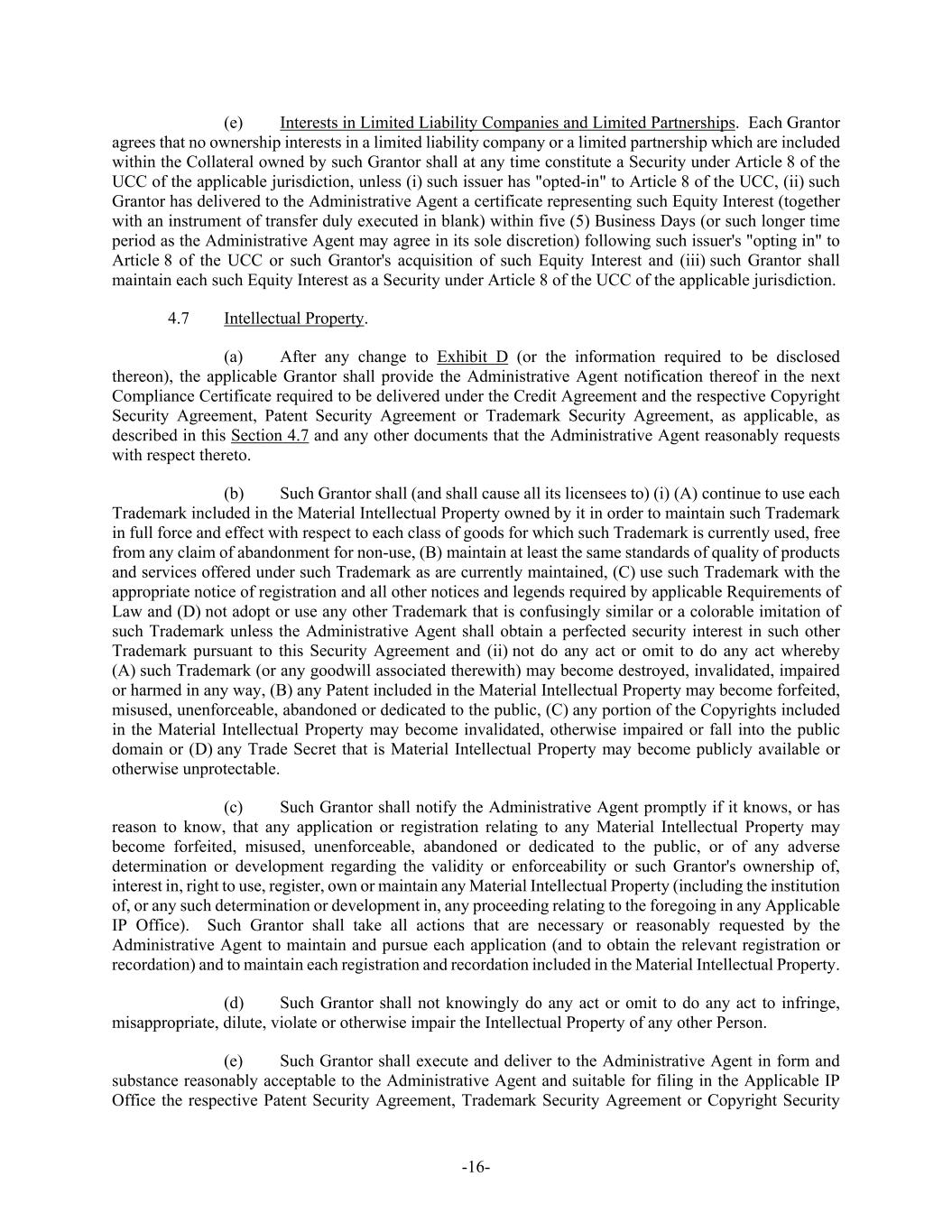 -16- (e) Interests in Limited Liability Companies and Limited Partnerships. Each Grantor agrees that no ownership interests in a limited liability company or a limited partnership which are included within the Collateral owned by such Grantor shall at any time constitute a Security under Article 8 of the UCC of the applicable jurisdiction, unless (i) such issuer has "opted-in" to Article 8 of the UCC, (ii) such Grantor has delivered to the Administrative Agent a certificate representing such Equity Interest (together with an instrument of transfer duly executed in blank) within five (5) Business Days (or such longer time period as the Administrative Agent may agree in its sole discretion) following such issuer's "opting in" to Article 8 of the UCC or such Grantor's acquisition of such Equity Interest and (iii) such Grantor shall maintain each such Equity Interest as a Security under Article 8 of the UCC of the applicable jurisdiction. 4.7 Intellectual Property. (a) After any change to Exhibit D (or the information required to be disclosed thereon), the applicable Grantor shall provide the Administrative Agent notification thereof in the next Compliance Certificate required to be delivered under the Credit Agreement and the respective Copyright Security Agreement, Patent Security Agreement or Trademark Security Agreement, as applicable, as described in this Section 4.7 and any other documents that the Administrative Agent reasonably requests with respect thereto. (b) Such Grantor shall (and shall cause all its licensees to) (i) (A) continue to use each Trademark included in the Material Intellectual Property owned by it in order to maintain such Trademark in full force and effect with respect to each class of goods for which such Trademark is currently used, free from any claim of abandonment for non-use, (B) maintain at least the same standards of quality of products and services offered under such Trademark as are currently maintained, (C) use such Trademark with the appropriate notice of registration and all other notices and legends required by applicable Requirements of Law and (D) not adopt or use any other Trademark that is confusingly similar or a colorable imitation of such Trademark unless the Administrative Agent shall obtain a perfected security interest in such other Trademark pursuant to this Security Agreement and (ii) not do any act or omit to do any act whereby (A) such Trademark (or any goodwill associated therewith) may become destroyed, invalidated, impaired or harmed in any way, (B) any Patent included in the Material Intellectual Property may become forfeited, misused, unenforceable, abandoned or dedicated to the public, (C) any portion of the Copyrights included in the Material Intellectual Property may become invalidated, otherwise impaired or fall into the public domain or (D) any Trade Secret that is Material Intellectual Property may become publicly available or otherwise unprotectable. (c) Such Grantor shall notify the Administrative Agent promptly if it knows, or has reason to know, that any application or registration relating to any Material Intellectual Property may become forfeited, misused, unenforceable, abandoned or dedicated to the public, or of any adverse determination or development regarding the validity or enforceability or such Grantor's ownership of, interest in, right to use, register, own or maintain any Material Intellectual Property (including the institution of, or any such determination or development in, any proceeding relating to the foregoing in any Applicable IP Office). Such Grantor shall take all actions that are necessary or reasonably requested by the Administrative Agent to maintain and pursue each application (and to obtain the relevant registration or recordation) and to maintain each registration and recordation included in the Material Intellectual Property. (d) Such Grantor shall not knowingly do any act or omit to do any act to infringe, misappropriate, dilute, violate or otherwise impair the Intellectual Property of any other Person. (e) Such Grantor shall execute and deliver to the Administrative Agent in form and substance reasonably acceptable to the Administrative Agent and suitable for filing in the Applicable IP Office the respective Patent Security Agreement, Trademark Security Agreement or Copyright Security