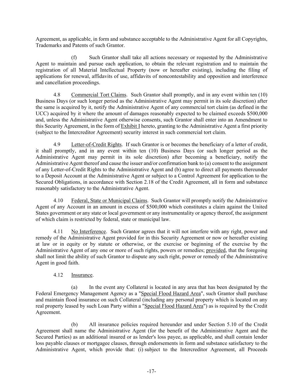 -17- Agreement, as applicable, in form and substance acceptable to the Administrative Agent for all Copyrights, Trademarks and Patents of such Grantor. (f) Such Grantor shall take all actions necessary or requested by the Administrative Agent to maintain and pursue each application, to obtain the relevant registration and to maintain the registration of all Material Intellectual Property (now or hereafter existing), including the filing of applications for renewal, affidavits of use, affidavits of noncontestability and opposition and interference and cancellation proceedings. 4.8 Commercial Tort Claims. Such Grantor shall promptly, and in any event within ten (10) Business Days (or such longer period as the Administrative Agent may permit in its sole discretion) after the same is acquired by it, notify the Administrative Agent of any commercial tort claim (as defined in the UCC) acquired by it where the amount of damages reasonably expected to be claimed exceeds $500,000 and, unless the Administrative Agent otherwise consents, such Grantor shall enter into an Amendment to this Security Agreement, in the form of Exhibit I hereto, granting to the Administrative Agent a first priority (subject to the Intercreditor Agreement) security interest in such commercial tort claim. 4.9 Letter-of-Credit Rights. If such Grantor is or becomes the beneficiary of a letter of credit, it shall promptly, and in any event within ten (10) Business Days (or such longer period as the Administrative Agent may permit in its sole discretion) after becoming a beneficiary, notify the Administrative Agent thereof and cause the issuer and/or confirmation bank to (a) consent to the assignment of any Letter-of-Credit Rights to the Administrative Agent and (b) agree to direct all payments thereunder to a Deposit Account at the Administrative Agent or subject to a Control Agreement for application to the Secured Obligations, in accordance with Section 2.18 of the Credit Agreement, all in form and substance reasonably satisfactory to the Administrative Agent. 4.10 Federal, State or Municipal Claims. Such Grantor will promptly notify the Administrative Agent of any Account in an amount in excess of $500,000 which constitutes a claim against the United States government or any state or local government or any instrumentality or agency thereof, the assignment of which claim is restricted by federal, state or municipal law. 4.11 No Interference. Such Grantor agrees that it will not interfere with any right, power and remedy of the Administrative Agent provided for in this Security Agreement or now or hereafter existing at law or in equity or by statute or otherwise, or the exercise or beginning of the exercise by the Administrative Agent of any one or more of such rights, powers or remedies; provided, that the foregoing shall not limit the ability of such Grantor to dispute any such right, power or remedy of the Administrative Agent in good faith. 4.12 Insurance. (a) In the event any Collateral is located in any area that has been designated by the Federal Emergency Management Agency as a "Special Flood Hazard Area", such Grantor shall purchase and maintain flood insurance on such Collateral (including any personal property which is located on any real property leased by such Loan Party within a "Special Flood Hazard Area") as is required by the Credit Agreement. (b) All insurance policies required hereunder and under Section 5.10 of the Credit Agreement shall name the Administrative Agent (for the benefit of the Administrative Agent and the Secured Parties) as an additional insured or as lender's loss payee, as applicable, and shall contain lender loss payable clauses or mortgagee clauses, through endorsements in form and substance satisfactory to the Administrative Agent, which provide that: (i) subject to the Intercreditor Agreement, all Proceeds