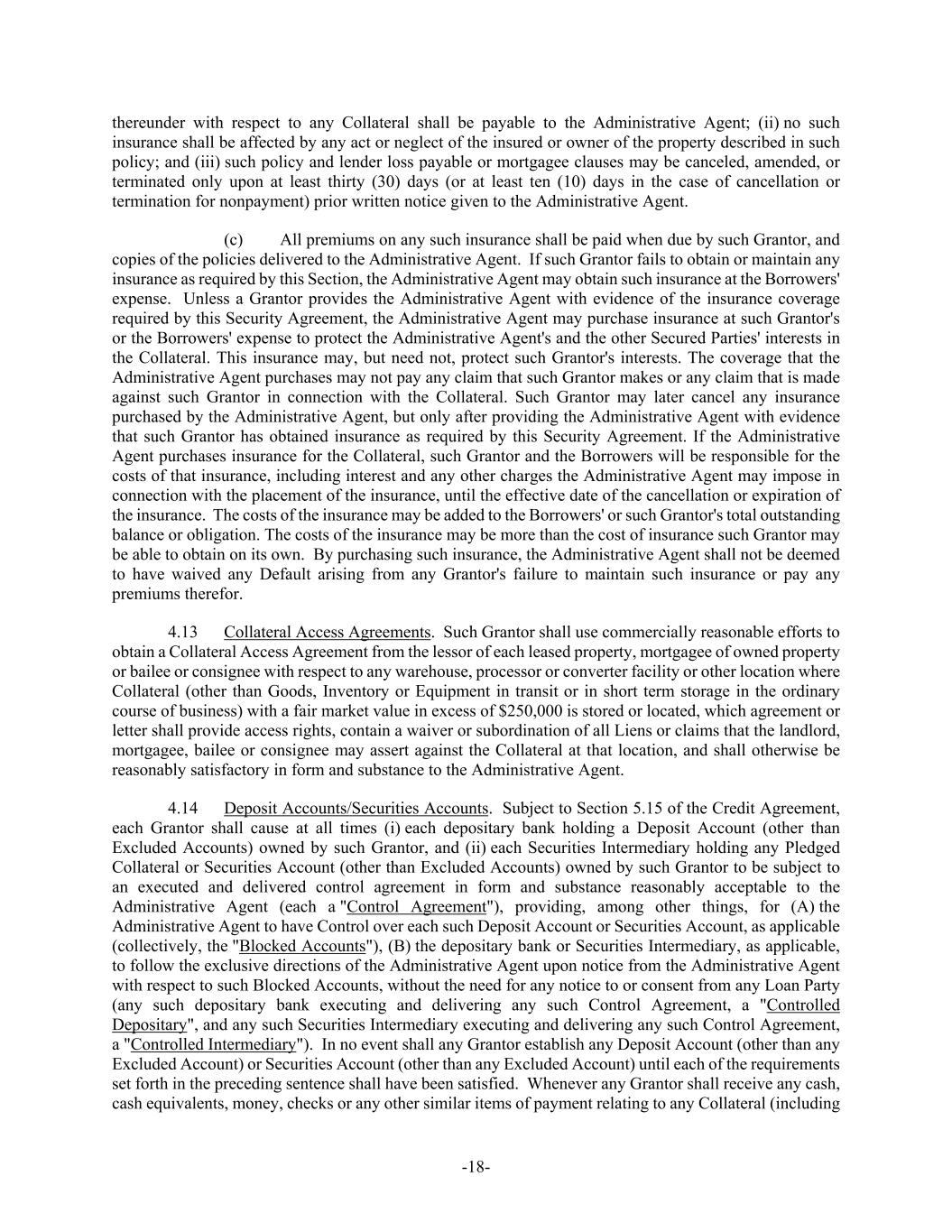 -18- thereunder with respect to any Collateral shall be payable to the Administrative Agent; (ii) no such insurance shall be affected by any act or neglect of the insured or owner of the property described in such policy; and (iii) such policy and lender loss payable or mortgagee clauses may be canceled, amended, or terminated only upon at least thirty (30) days (or at least ten (10) days in the case of cancellation or termination for nonpayment) prior written notice given to the Administrative Agent. (c) All premiums on any such insurance shall be paid when due by such Grantor, and copies of the policies delivered to the Administrative Agent. If such Grantor fails to obtain or maintain any insurance as required by this Section, the Administrative Agent may obtain such insurance at the Borrowers' expense. Unless a Grantor provides the Administrative Agent with evidence of the insurance coverage required by this Security Agreement, the Administrative Agent may purchase insurance at such Grantor's or the Borrowers' expense to protect the Administrative Agent's and the other Secured Parties' interests in the Collateral. This insurance may, but need not, protect such Grantor's interests. The coverage that the Administrative Agent purchases may not pay any claim that such Grantor makes or any claim that is made against such Grantor in connection with the Collateral. Such Grantor may later cancel any insurance purchased by the Administrative Agent, but only after providing the Administrative Agent with evidence that such Grantor has obtained insurance as required by this Security Agreement. If the Administrative Agent purchases insurance for the Collateral, such Grantor and the Borrowers will be responsible for the costs of that insurance, including interest and any other charges the Administrative Agent may impose in connection with the placement of the insurance, until the effective date of the cancellation or expiration of the insurance. The costs of the insurance may be added to the Borrowers' or such Grantor's total outstanding balance or obligation. The costs of the insurance may be more than the cost of insurance such Grantor may be able to obtain on its own. By purchasing such insurance, the Administrative Agent shall not be deemed to have waived any Default arising from any Grantor's failure to maintain such insurance or pay any premiums therefor. 4.13 Collateral Access Agreements. Such Grantor shall use commercially reasonable efforts to obtain a Collateral Access Agreement from the lessor of each leased property, mortgagee of owned property or bailee or consignee with respect to any warehouse, processor or converter facility or other location where Collateral (other than Goods, Inventory or Equipment in transit or in short term storage in the ordinary course of business) with a fair market value in excess of $250,000 is stored or located, which agreement or letter shall provide access rights, contain a waiver or subordination of all Liens or claims that the landlord, mortgagee, bailee or consignee may assert against the Collateral at that location, and shall otherwise be reasonably satisfactory in form and substance to the Administrative Agent. 4.14 Deposit Accounts/Securities Accounts. Subject to Section 5.15 of the Credit Agreement, each Grantor shall cause at all times (i) each depositary bank holding a Deposit Account (other than Excluded Accounts) owned by such Grantor, and (ii) each Securities Intermediary holding any Pledged Collateral or Securities Account (other than Excluded Accounts) owned by such Grantor to be subject to an executed and delivered control agreement in form and substance reasonably acceptable to the Administrative Agent (each a "Control Agreement"), providing, among other things, for (A) the Administrative Agent to have Control over each such Deposit Account or Securities Account, as applicable (collectively, the "Blocked Accounts"), (B) the depositary bank or Securities Intermediary, as applicable, to follow the exclusive directions of the Administrative Agent upon notice from the Administrative Agent with respect to such Blocked Accounts, without the need for any notice to or consent from any Loan Party (any such depositary bank executing and delivering any such Control Agreement, a "Controlled Depositary", and any such Securities Intermediary executing and delivering any such Control Agreement, a "Controlled Intermediary"). In no event shall any Grantor establish any Deposit Account (other than any Excluded Account) or Securities Account (other than any Excluded Account) until each of the requirements set forth in the preceding sentence shall have been satisfied. Whenever any Grantor shall receive any cash, cash equivalents, money, checks or any other similar items of payment relating to any Collateral (including