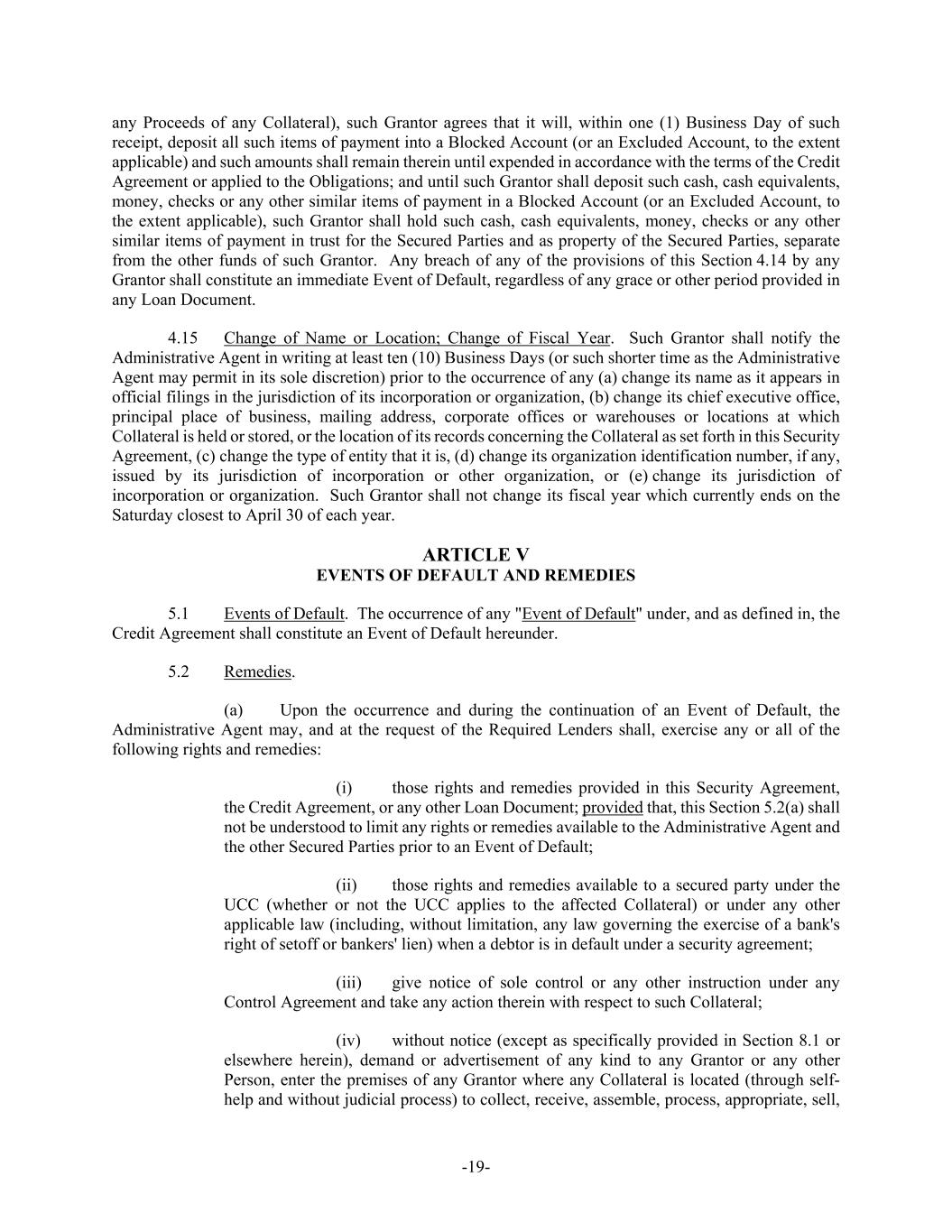 -19- any Proceeds of any Collateral), such Grantor agrees that it will, within one (1) Business Day of such receipt, deposit all such items of payment into a Blocked Account (or an Excluded Account, to the extent applicable) and such amounts shall remain therein until expended in accordance with the terms of the Credit Agreement or applied to the Obligations; and until such Grantor shall deposit such cash, cash equivalents, money, checks or any other similar items of payment in a Blocked Account (or an Excluded Account, to the extent applicable), such Grantor shall hold such cash, cash equivalents, money, checks or any other similar items of payment in trust for the Secured Parties and as property of the Secured Parties, separate from the other funds of such Grantor. Any breach of any of the provisions of this Section 4.14 by any Grantor shall constitute an immediate Event of Default, regardless of any grace or other period provided in any Loan Document. 4.15 Change of Name or Location; Change of Fiscal Year. Such Grantor shall notify the Administrative Agent in writing at least ten (10) Business Days (or such shorter time as the Administrative Agent may permit in its sole discretion) prior to the occurrence of any (a) change its name as it appears in official filings in the jurisdiction of its incorporation or organization, (b) change its chief executive office, principal place of business, mailing address, corporate offices or warehouses or locations at which Collateral is held or stored, or the location of its records concerning the Collateral as set forth in this Security Agreement, (c) change the type of entity that it is, (d) change its organization identification number, if any, issued by its jurisdiction of incorporation or other organization, or (e) change its jurisdiction of incorporation or organization. Such Grantor shall not change its fiscal year which currently ends on the Saturday closest to April 30 of each year. ARTICLE V EVENTS OF DEFAULT AND REMEDIES 5.1 Events of Default. The occurrence of any "Event of Default" under, and as defined in, the Credit Agreement shall constitute an Event of Default hereunder. 5.2 Remedies. (a) Upon the occurrence and during the continuation of an Event of Default, the Administrative Agent may, and at the request of the Required Lenders shall, exercise any or all of the following rights and remedies: (i) those rights and remedies provided in this Security Agreement, the Credit Agreement, or any other Loan Document; provided that, this Section 5.2(a) shall not be understood to limit any rights or remedies available to the Administrative Agent and the other Secured Parties prior to an Event of Default; (ii) those rights and remedies available to a secured party under the UCC (whether or not the UCC applies to the affected Collateral) or under any other applicable law (including, without limitation, any law governing the exercise of a bank's right of setoff or bankers' lien) when a debtor is in default under a security agreement; (iii) give notice of sole control or any other instruction under any Control Agreement and take any action therein with respect to such Collateral; (iv) without notice (except as specifically provided in Section 8.1 or elsewhere herein), demand or advertisement of any kind to any Grantor or any other Person, enter the premises of any Grantor where any Collateral is located (through self- help and without judicial process) to collect, receive, assemble, process, appropriate, sell,