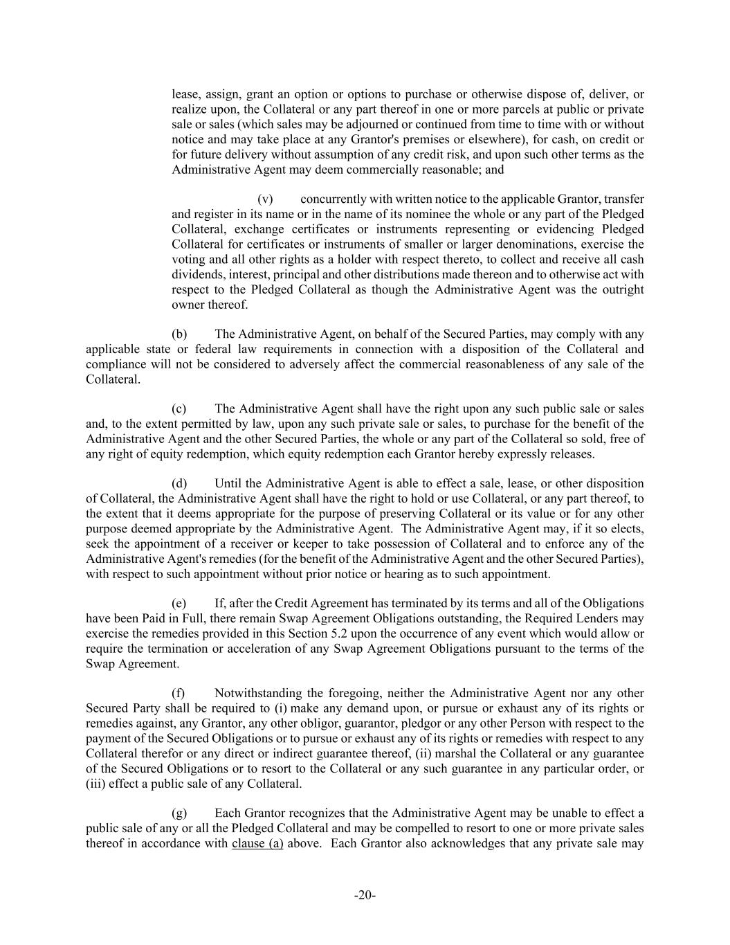 -20- lease, assign, grant an option or options to purchase or otherwise dispose of, deliver, or realize upon, the Collateral or any part thereof in one or more parcels at public or private sale or sales (which sales may be adjourned or continued from time to time with or without notice and may take place at any Grantor's premises or elsewhere), for cash, on credit or for future delivery without assumption of any credit risk, and upon such other terms as the Administrative Agent may deem commercially reasonable; and (v) concurrently with written notice to the applicable Grantor, transfer and register in its name or in the name of its nominee the whole or any part of the Pledged Collateral, exchange certificates or instruments representing or evidencing Pledged Collateral for certificates or instruments of smaller or larger denominations, exercise the voting and all other rights as a holder with respect thereto, to collect and receive all cash dividends, interest, principal and other distributions made thereon and to otherwise act with respect to the Pledged Collateral as though the Administrative Agent was the outright owner thereof. (b) The Administrative Agent, on behalf of the Secured Parties, may comply with any applicable state or federal law requirements in connection with a disposition of the Collateral and compliance will not be considered to adversely affect the commercial reasonableness of any sale of the Collateral. (c) The Administrative Agent shall have the right upon any such public sale or sales and, to the extent permitted by law, upon any such private sale or sales, to purchase for the benefit of the Administrative Agent and the other Secured Parties, the whole or any part of the Collateral so sold, free of any right of equity redemption, which equity redemption each Grantor hereby expressly releases. (d) Until the Administrative Agent is able to effect a sale, lease, or other disposition of Collateral, the Administrative Agent shall have the right to hold or use Collateral, or any part thereof, to the extent that it deems appropriate for the purpose of preserving Collateral or its value or for any other purpose deemed appropriate by the Administrative Agent. The Administrative Agent may, if it so elects, seek the appointment of a receiver or keeper to take possession of Collateral and to enforce any of the Administrative Agent's remedies (for the benefit of the Administrative Agent and the other Secured Parties), with respect to such appointment without prior notice or hearing as to such appointment. (e) If, after the Credit Agreement has terminated by its terms and all of the Obligations have been Paid in Full, there remain Swap Agreement Obligations outstanding, the Required Lenders may exercise the remedies provided in this Section 5.2 upon the occurrence of any event which would allow or require the termination or acceleration of any Swap Agreement Obligations pursuant to the terms of the Swap Agreement. (f) Notwithstanding the foregoing, neither the Administrative Agent nor any other Secured Party shall be required to (i) make any demand upon, or pursue or exhaust any of its rights or remedies against, any Grantor, any other obligor, guarantor, pledgor or any other Person with respect to the payment of the Secured Obligations or to pursue or exhaust any of its rights or remedies with respect to any Collateral therefor or any direct or indirect guarantee thereof, (ii) marshal the Collateral or any guarantee of the Secured Obligations or to resort to the Collateral or any such guarantee in any particular order, or (iii) effect a public sale of any Collateral. (g) Each Grantor recognizes that the Administrative Agent may be unable to effect a public sale of any or all the Pledged Collateral and may be compelled to resort to one or more private sales thereof in accordance with clause (a) above. Each Grantor also acknowledges that any private sale may