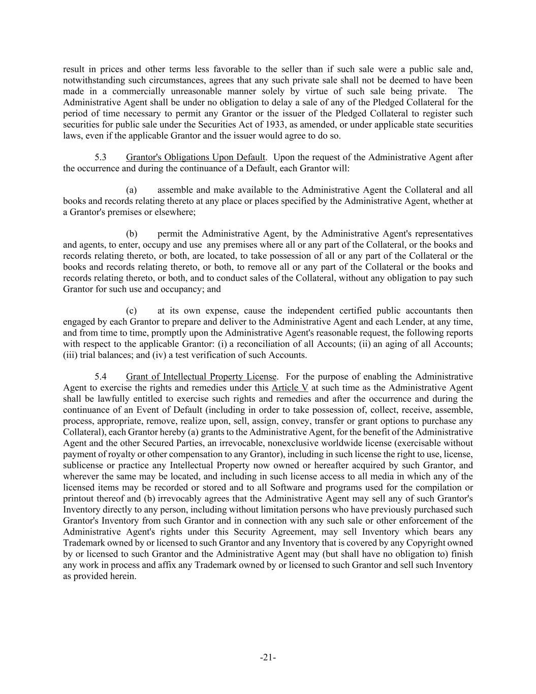 -21- result in prices and other terms less favorable to the seller than if such sale were a public sale and, notwithstanding such circumstances, agrees that any such private sale shall not be deemed to have been made in a commercially unreasonable manner solely by virtue of such sale being private. The Administrative Agent shall be under no obligation to delay a sale of any of the Pledged Collateral for the period of time necessary to permit any Grantor or the issuer of the Pledged Collateral to register such securities for public sale under the Securities Act of 1933, as amended, or under applicable state securities laws, even if the applicable Grantor and the issuer would agree to do so. 5.3 Grantor's Obligations Upon Default. Upon the request of the Administrative Agent after the occurrence and during the continuance of a Default, each Grantor will: (a) assemble and make available to the Administrative Agent the Collateral and all books and records relating thereto at any place or places specified by the Administrative Agent, whether at a Grantor's premises or elsewhere; (b) permit the Administrative Agent, by the Administrative Agent's representatives and agents, to enter, occupy and use any premises where all or any part of the Collateral, or the books and records relating thereto, or both, are located, to take possession of all or any part of the Collateral or the books and records relating thereto, or both, to remove all or any part of the Collateral or the books and records relating thereto, or both, and to conduct sales of the Collateral, without any obligation to pay such Grantor for such use and occupancy; and (c) at its own expense, cause the independent certified public accountants then engaged by each Grantor to prepare and deliver to the Administrative Agent and each Lender, at any time, and from time to time, promptly upon the Administrative Agent's reasonable request, the following reports with respect to the applicable Grantor: (i) a reconciliation of all Accounts; (ii) an aging of all Accounts; (iii) trial balances; and (iv) a test verification of such Accounts. 5.4 Grant of Intellectual Property License. For the purpose of enabling the Administrative Agent to exercise the rights and remedies under this Article V at such time as the Administrative Agent shall be lawfully entitled to exercise such rights and remedies and after the occurrence and during the continuance of an Event of Default (including in order to take possession of, collect, receive, assemble, process, appropriate, remove, realize upon, sell, assign, convey, transfer or grant options to purchase any Collateral), each Grantor hereby (a) grants to the Administrative Agent, for the benefit of the Administrative Agent and the other Secured Parties, an irrevocable, nonexclusive worldwide license (exercisable without payment of royalty or other compensation to any Grantor), including in such license the right to use, license, sublicense or practice any Intellectual Property now owned or hereafter acquired by such Grantor, and wherever the same may be located, and including in such license access to all media in which any of the licensed items may be recorded or stored and to all Software and programs used for the compilation or printout thereof and (b) irrevocably agrees that the Administrative Agent may sell any of such Grantor's Inventory directly to any person, including without limitation persons who have previously purchased such Grantor's Inventory from such Grantor and in connection with any such sale or other enforcement of the Administrative Agent's rights under this Security Agreement, may sell Inventory which bears any Trademark owned by or licensed to such Grantor and any Inventory that is covered by any Copyright owned by or licensed to such Grantor and the Administrative Agent may (but shall have no obligation to) finish any work in process and affix any Trademark owned by or licensed to such Grantor and sell such Inventory as provided herein.