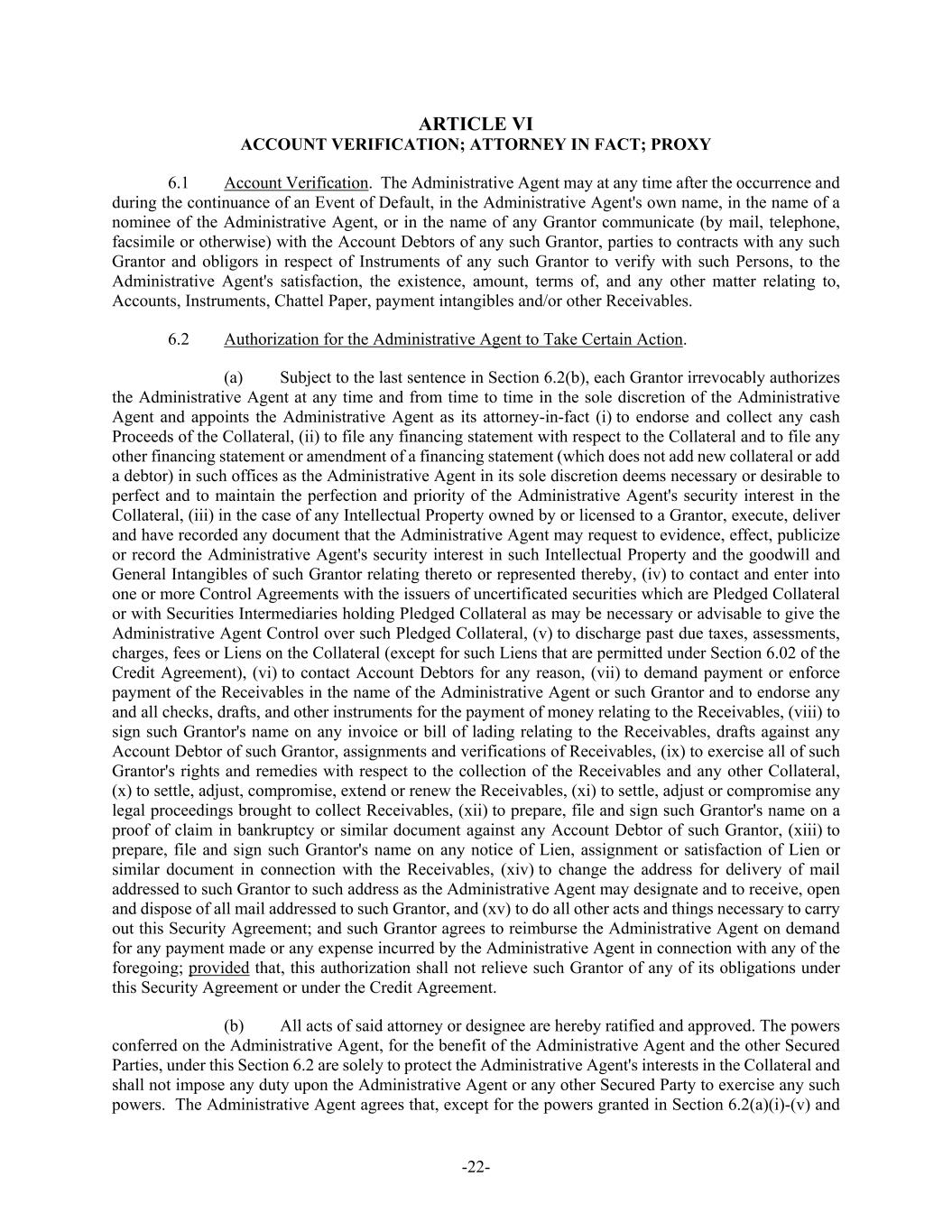 -22- ARTICLE VI ACCOUNT VERIFICATION; ATTORNEY IN FACT; PROXY 6.1 Account Verification. The Administrative Agent may at any time after the occurrence and during the continuance of an Event of Default, in the Administrative Agent's own name, in the name of a nominee of the Administrative Agent, or in the name of any Grantor communicate (by mail, telephone, facsimile or otherwise) with the Account Debtors of any such Grantor, parties to contracts with any such Grantor and obligors in respect of Instruments of any such Grantor to verify with such Persons, to the Administrative Agent's satisfaction, the existence, amount, terms of, and any other matter relating to, Accounts, Instruments, Chattel Paper, payment intangibles and/or other Receivables. 6.2 Authorization for the Administrative Agent to Take Certain Action. (a) Subject to the last sentence in Section 6.2(b), each Grantor irrevocably authorizes the Administrative Agent at any time and from time to time in the sole discretion of the Administrative Agent and appoints the Administrative Agent as its attorney-in-fact (i) to endorse and collect any cash Proceeds of the Collateral, (ii) to file any financing statement with respect to the Collateral and to file any other financing statement or amendment of a financing statement (which does not add new collateral or add a debtor) in such offices as the Administrative Agent in its sole discretion deems necessary or desirable to perfect and to maintain the perfection and priority of the Administrative Agent's security interest in the Collateral, (iii) in the case of any Intellectual Property owned by or licensed to a Grantor, execute, deliver and have recorded any document that the Administrative Agent may request to evidence, effect, publicize or record the Administrative Agent's security interest in such Intellectual Property and the goodwill and General Intangibles of such Grantor relating thereto or represented thereby, (iv) to contact and enter into one or more Control Agreements with the issuers of uncertificated securities which are Pledged Collateral or with Securities Intermediaries holding Pledged Collateral as may be necessary or advisable to give the Administrative Agent Control over such Pledged Collateral, (v) to discharge past due taxes, assessments, charges, fees or Liens on the Collateral (except for such Liens that are permitted under Section 6.02 of the Credit Agreement), (vi) to contact Account Debtors for any reason, (vii) to demand payment or enforce payment of the Receivables in the name of the Administrative Agent or such Grantor and to endorse any and all checks, drafts, and other instruments for the payment of money relating to the Receivables, (viii) to sign such Grantor's name on any invoice or bill of lading relating to the Receivables, drafts against any Account Debtor of such Grantor, assignments and verifications of Receivables, (ix) to exercise all of such Grantor's rights and remedies with respect to the collection of the Receivables and any other Collateral, (x) to settle, adjust, compromise, extend or renew the Receivables, (xi) to settle, adjust or compromise any legal proceedings brought to collect Receivables, (xii) to prepare, file and sign such Grantor's name on a proof of claim in bankruptcy or similar document against any Account Debtor of such Grantor, (xiii) to prepare, file and sign such Grantor's name on any notice of Lien, assignment or satisfaction of Lien or similar document in connection with the Receivables, (xiv) to change the address for delivery of mail addressed to such Grantor to such address as the Administrative Agent may designate and to receive, open and dispose of all mail addressed to such Grantor, and (xv) to do all other acts and things necessary to carry out this Security Agreement; and such Grantor agrees to reimburse the Administrative Agent on demand for any payment made or any expense incurred by the Administrative Agent in connection with any of the foregoing; provided that, this authorization shall not relieve such Grantor of any of its obligations under this Security Agreement or under the Credit Agreement. (b) All acts of said attorney or designee are hereby ratified and approved. The powers conferred on the Administrative Agent, for the benefit of the Administrative Agent and the other Secured Parties, under this Section 6.2 are solely to protect the Administrative Agent's interests in the Collateral and shall not impose any duty upon the Administrative Agent or any other Secured Party to exercise any such powers. The Administrative Agent agrees that, except for the powers granted in Section 6.2(a)(i)-(v) and