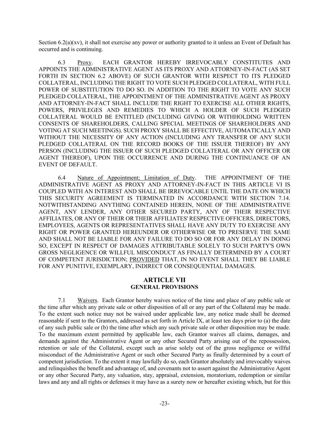 -23- Section 6.2(a)(xv), it shall not exercise any power or authority granted to it unless an Event of Default has occurred and is continuing. 6.3 Proxy. EACH GRANTOR HEREBY IRREVOCABLY CONSTITUTES AND APPOINTS THE ADMINISTRATIVE AGENT AS ITS PROXY AND ATTORNEY-IN-FACT (AS SET FORTH IN SECTION 6.2 ABOVE) OF SUCH GRANTOR WITH RESPECT TO ITS PLEDGED COLLATERAL, INCLUDING THE RIGHT TO VOTE SUCH PLEDGED COLLATERAL, WITH FULL POWER OF SUBSTITUTION TO DO SO. IN ADDITION TO THE RIGHT TO VOTE ANY SUCH PLEDGED COLLATERAL, THE APPOINTMENT OF THE ADMINISTRATIVE AGENT AS PROXY AND ATTORNEY-IN-FACT SHALL INCLUDE THE RIGHT TO EXERCISE ALL OTHER RIGHTS, POWERS, PRIVILEGES AND REMEDIES TO WHICH A HOLDER OF SUCH PLEDGED COLLATERAL WOULD BE ENTITLED (INCLUDING GIVING OR WITHHOLDING WRITTEN CONSENTS OF SHAREHOLDERS, CALLING SPECIAL MEETINGS OF SHAREHOLDERS AND VOTING AT SUCH MEETINGS). SUCH PROXY SHALL BE EFFECTIVE, AUTOMATICALLY AND WITHOUT THE NECESSITY OF ANY ACTION (INCLUDING ANY TRANSFER OF ANY SUCH PLEDGED COLLATERAL ON THE RECORD BOOKS OF THE ISSUER THEREOF) BY ANY PERSON (INCLUDING THE ISSUER OF SUCH PLEDGED COLLATERAL OR ANY OFFICER OR AGENT THEREOF), UPON THE OCCURRENCE AND DURING THE CONTINUANCE OF AN EVENT OF DEFAULT. 6.4 Nature of Appointment; Limitation of Duty. THE APPOINTMENT OF THE ADMINISTRATIVE AGENT AS PROXY AND ATTORNEY-IN-FACT IN THIS ARTICLE VI IS COUPLED WITH AN INTEREST AND SHALL BE IRREVOCABLE UNTIL THE DATE ON WHICH THIS SECURITY AGREEMENT IS TERMINATED IN ACCORDANCE WITH SECTION 7.14. NOTWITHSTANDING ANYTHING CONTAINED HEREIN, NONE OF THE ADMINISTRATIVE AGENT, ANY LENDER, ANY OTHER SECURED PARTY, ANY OF THEIR RESPECTIVE AFFILIATES, OR ANY OF THEIR OR THEIR AFFILIATES' RESPECTIVE OFFICERS, DIRECTORS, EMPLOYEES, AGENTS OR REPRESENTATIVES SHALL HAVE ANY DUTY TO EXERCISE ANY RIGHT OR POWER GRANTED HEREUNDER OR OTHERWISE OR TO PRESERVE THE SAME AND SHALL NOT BE LIABLE FOR ANY FAILURE TO DO SO OR FOR ANY DELAY IN DOING SO, EXCEPT IN RESPECT OF DAMAGES ATTRIBUTABLE SOLELY TO SUCH PARTY'S OWN GROSS NEGLIGENCE OR WILLFUL MISCONDUCT AS FINALLY DETERMINED BY A COURT OF COMPETENT JURISDICTION; PROVIDED THAT, IN NO EVENT SHALL THEY BE LIABLE FOR ANY PUNITIVE, EXEMPLARY, INDIRECT OR CONSEQUENTIAL DAMAGES. ARTICLE VII GENERAL PROVISIONS 7.1 Waivers. Each Grantor hereby waives notice of the time and place of any public sale or the time after which any private sale or other disposition of all or any part of the Collateral may be made. To the extent such notice may not be waived under applicable law, any notice made shall be deemed reasonable if sent to the Grantors, addressed as set forth in Article IX, at least ten days prior to (a) the date of any such public sale or (b) the time after which any such private sale or other disposition may be made. To the maximum extent permitted by applicable law, each Grantor waives all claims, damages, and demands against the Administrative Agent or any other Secured Party arising out of the repossession, retention or sale of the Collateral, except such as arise solely out of the gross negligence or willful misconduct of the Administrative Agent or such other Secured Party as finally determined by a court of competent jurisdiction. To the extent it may lawfully do so, each Grantor absolutely and irrevocably waives and relinquishes the benefit and advantage of, and covenants not to assert against the Administrative Agent or any other Secured Party, any valuation, stay, appraisal, extension, moratorium, redemption or similar laws and any and all rights or defenses it may have as a surety now or hereafter existing which, but for this
