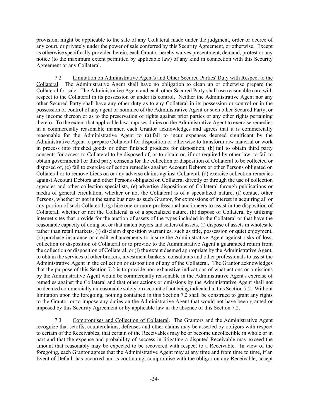 -24- provision, might be applicable to the sale of any Collateral made under the judgment, order or decree of any court, or privately under the power of sale conferred by this Security Agreement, or otherwise. Except as otherwise specifically provided herein, each Grantor hereby waives presentment, demand, protest or any notice (to the maximum extent permitted by applicable law) of any kind in connection with this Security Agreement or any Collateral. 7.2 Limitation on Administrative Agent's and Other Secured Parties' Duty with Respect to the Collateral. The Administrative Agent shall have no obligation to clean up or otherwise prepare the Collateral for sale. The Administrative Agent and each other Secured Party shall use reasonable care with respect to the Collateral in its possession or under its control. Neither the Administrative Agent nor any other Secured Party shall have any other duty as to any Collateral in its possession or control or in the possession or control of any agent or nominee of the Administrative Agent or such other Secured Party, or any income thereon or as to the preservation of rights against prior parties or any other rights pertaining thereto. To the extent that applicable law imposes duties on the Administrative Agent to exercise remedies in a commercially reasonable manner, each Grantor acknowledges and agrees that it is commercially reasonable for the Administrative Agent to (a) fail to incur expenses deemed significant by the Administrative Agent to prepare Collateral for disposition or otherwise to transform raw material or work in process into finished goods or other finished products for disposition, (b) fail to obtain third party consents for access to Collateral to be disposed of, or to obtain or, if not required by other law, to fail to obtain governmental or third party consents for the collection or disposition of Collateral to be collected or disposed of, (c) fail to exercise collection remedies against Account Debtors or other Persons obligated on Collateral or to remove Liens on or any adverse claims against Collateral, (d) exercise collection remedies against Account Debtors and other Persons obligated on Collateral directly or through the use of collection agencies and other collection specialists, (e) advertise dispositions of Collateral through publications or media of general circulation, whether or not the Collateral is of a specialized nature, (f) contact other Persons, whether or not in the same business as such Grantor, for expressions of interest in acquiring all or any portion of such Collateral, (g) hire one or more professional auctioneers to assist in the disposition of Collateral, whether or not the Collateral is of a specialized nature, (h) dispose of Collateral by utilizing internet sites that provide for the auction of assets of the types included in the Collateral or that have the reasonable capacity of doing so, or that match buyers and sellers of assets, (i) dispose of assets in wholesale rather than retail markets, (j) disclaim disposition warranties, such as title, possession or quiet enjoyment, (k) purchase insurance or credit enhancements to insure the Administrative Agent against risks of loss, collection or disposition of Collateral or to provide to the Administrative Agent a guaranteed return from the collection or disposition of Collateral, or (l) the extent deemed appropriate by the Administrative Agent, to obtain the services of other brokers, investment bankers, consultants and other professionals to assist the Administrative Agent in the collection or disposition of any of the Collateral. The Grantor acknowledges that the purpose of this Section 7.2 is to provide non-exhaustive indications of what actions or omissions by the Administrative Agent would be commercially reasonable in the Administrative Agent's exercise of remedies against the Collateral and that other actions or omissions by the Administrative Agent shall not be deemed commercially unreasonable solely on account of not being indicated in this Section 7.2. Without limitation upon the foregoing, nothing contained in this Section 7.2 shall be construed to grant any rights to the Grantor or to impose any duties on the Administrative Agent that would not have been granted or imposed by this Security Agreement or by applicable law in the absence of this Section 7.2. 7.3 Compromises and Collection of Collateral. The Grantors and the Administrative Agent recognize that setoffs, counterclaims, defenses and other claims may be asserted by obligors with respect to certain of the Receivables, that certain of the Receivables may be or become uncollectible in whole or in part and that the expense and probability of success in litigating a disputed Receivable may exceed the amount that reasonably may be expected to be recovered with respect to a Receivable. In view of the foregoing, each Grantor agrees that the Administrative Agent may at any time and from time to time, if an Event of Default has occurred and is continuing, compromise with the obligor on any Receivable, accept
