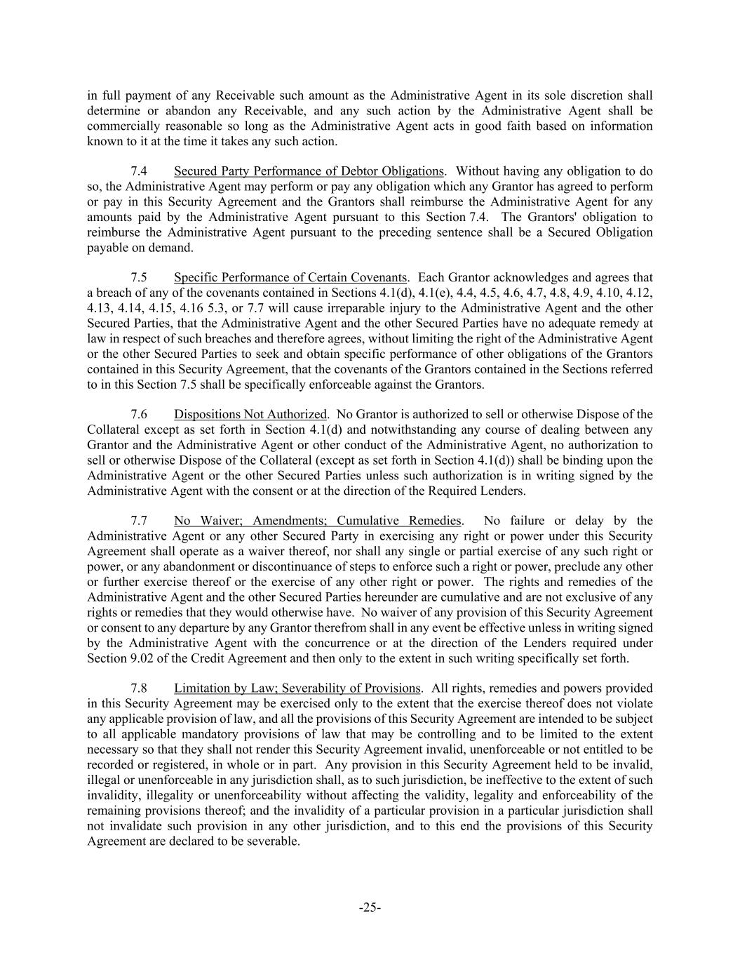 -25- in full payment of any Receivable such amount as the Administrative Agent in its sole discretion shall determine or abandon any Receivable, and any such action by the Administrative Agent shall be commercially reasonable so long as the Administrative Agent acts in good faith based on information known to it at the time it takes any such action. 7.4 Secured Party Performance of Debtor Obligations. Without having any obligation to do so, the Administrative Agent may perform or pay any obligation which any Grantor has agreed to perform or pay in this Security Agreement and the Grantors shall reimburse the Administrative Agent for any amounts paid by the Administrative Agent pursuant to this Section 7.4. The Grantors' obligation to reimburse the Administrative Agent pursuant to the preceding sentence shall be a Secured Obligation payable on demand. 7.5 Specific Performance of Certain Covenants. Each Grantor acknowledges and agrees that a breach of any of the covenants contained in Sections 4.1(d), 4.1(e), 4.4, 4.5, 4.6, 4.7, 4.8, 4.9, 4.10, 4.12, 4.13, 4.14, 4.15, 4.16 5.3, or 7.7 will cause irreparable injury to the Administrative Agent and the other Secured Parties, that the Administrative Agent and the other Secured Parties have no adequate remedy at law in respect of such breaches and therefore agrees, without limiting the right of the Administrative Agent or the other Secured Parties to seek and obtain specific performance of other obligations of the Grantors contained in this Security Agreement, that the covenants of the Grantors contained in the Sections referred to in this Section 7.5 shall be specifically enforceable against the Grantors. 7.6 Dispositions Not Authorized. No Grantor is authorized to sell or otherwise Dispose of the Collateral except as set forth in Section 4.1(d) and notwithstanding any course of dealing between any Grantor and the Administrative Agent or other conduct of the Administrative Agent, no authorization to sell or otherwise Dispose of the Collateral (except as set forth in Section 4.1(d)) shall be binding upon the Administrative Agent or the other Secured Parties unless such authorization is in writing signed by the Administrative Agent with the consent or at the direction of the Required Lenders. 7.7 No Waiver; Amendments; Cumulative Remedies. No failure or delay by the Administrative Agent or any other Secured Party in exercising any right or power under this Security Agreement shall operate as a waiver thereof, nor shall any single or partial exercise of any such right or power, or any abandonment or discontinuance of steps to enforce such a right or power, preclude any other or further exercise thereof or the exercise of any other right or power. The rights and remedies of the Administrative Agent and the other Secured Parties hereunder are cumulative and are not exclusive of any rights or remedies that they would otherwise have. No waiver of any provision of this Security Agreement or consent to any departure by any Grantor therefrom shall in any event be effective unless in writing signed by the Administrative Agent with the concurrence or at the direction of the Lenders required under Section 9.02 of the Credit Agreement and then only to the extent in such writing specifically set forth. 7.8 Limitation by Law; Severability of Provisions. All rights, remedies and powers provided in this Security Agreement may be exercised only to the extent that the exercise thereof does not violate any applicable provision of law, and all the provisions of this Security Agreement are intended to be subject to all applicable mandatory provisions of law that may be controlling and to be limited to the extent necessary so that they shall not render this Security Agreement invalid, unenforceable or not entitled to be recorded or registered, in whole or in part. Any provision in this Security Agreement held to be invalid, illegal or unenforceable in any jurisdiction shall, as to such jurisdiction, be ineffective to the extent of such invalidity, illegality or unenforceability without affecting the validity, legality and enforceability of the remaining provisions thereof; and the invalidity of a particular provision in a particular jurisdiction shall not invalidate such provision in any other jurisdiction, and to this end the provisions of this Security Agreement are declared to be severable.
