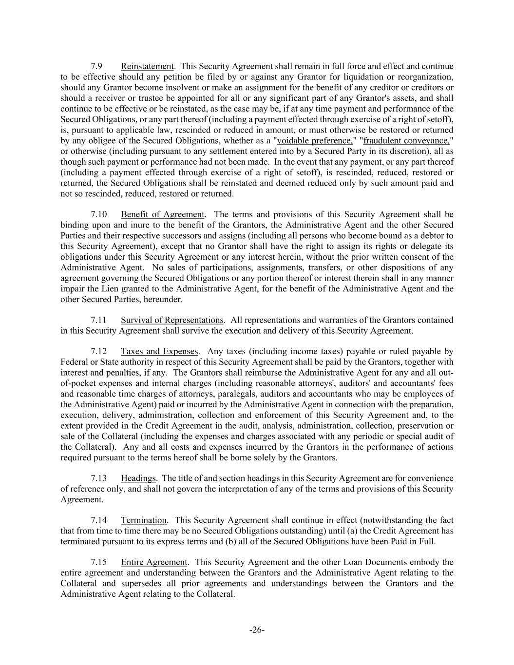 -26- 7.9 Reinstatement. This Security Agreement shall remain in full force and effect and continue to be effective should any petition be filed by or against any Grantor for liquidation or reorganization, should any Grantor become insolvent or make an assignment for the benefit of any creditor or creditors or should a receiver or trustee be appointed for all or any significant part of any Grantor's assets, and shall continue to be effective or be reinstated, as the case may be, if at any time payment and performance of the Secured Obligations, or any part thereof (including a payment effected through exercise of a right of setoff), is, pursuant to applicable law, rescinded or reduced in amount, or must otherwise be restored or returned by any obligee of the Secured Obligations, whether as a "voidable preference," "fraudulent conveyance," or otherwise (including pursuant to any settlement entered into by a Secured Party in its discretion), all as though such payment or performance had not been made. In the event that any payment, or any part thereof (including a payment effected through exercise of a right of setoff), is rescinded, reduced, restored or returned, the Secured Obligations shall be reinstated and deemed reduced only by such amount paid and not so rescinded, reduced, restored or returned. 7.10 Benefit of Agreement. The terms and provisions of this Security Agreement shall be binding upon and inure to the benefit of the Grantors, the Administrative Agent and the other Secured Parties and their respective successors and assigns (including all persons who become bound as a debtor to this Security Agreement), except that no Grantor shall have the right to assign its rights or delegate its obligations under this Security Agreement or any interest herein, without the prior written consent of the Administrative Agent. No sales of participations, assignments, transfers, or other dispositions of any agreement governing the Secured Obligations or any portion thereof or interest therein shall in any manner impair the Lien granted to the Administrative Agent, for the benefit of the Administrative Agent and the other Secured Parties, hereunder. 7.11 Survival of Representations. All representations and warranties of the Grantors contained in this Security Agreement shall survive the execution and delivery of this Security Agreement. 7.12 Taxes and Expenses. Any taxes (including income taxes) payable or ruled payable by Federal or State authority in respect of this Security Agreement shall be paid by the Grantors, together with interest and penalties, if any. The Grantors shall reimburse the Administrative Agent for any and all out- of-pocket expenses and internal charges (including reasonable attorneys', auditors' and accountants' fees and reasonable time charges of attorneys, paralegals, auditors and accountants who may be employees of the Administrative Agent) paid or incurred by the Administrative Agent in connection with the preparation, execution, delivery, administration, collection and enforcement of this Security Agreement and, to the extent provided in the Credit Agreement in the audit, analysis, administration, collection, preservation or sale of the Collateral (including the expenses and charges associated with any periodic or special audit of the Collateral). Any and all costs and expenses incurred by the Grantors in the performance of actions required pursuant to the terms hereof shall be borne solely by the Grantors. 7.13 Headings. The title of and section headings in this Security Agreement are for convenience of reference only, and shall not govern the interpretation of any of the terms and provisions of this Security Agreement. 7.14 Termination. This Security Agreement shall continue in effect (notwithstanding the fact that from time to time there may be no Secured Obligations outstanding) until (a) the Credit Agreement has terminated pursuant to its express terms and (b) all of the Secured Obligations have been Paid in Full. 7.15 Entire Agreement. This Security Agreement and the other Loan Documents embody the entire agreement and understanding between the Grantors and the Administrative Agent relating to the Collateral and supersedes all prior agreements and understandings between the Grantors and the Administrative Agent relating to the Collateral.