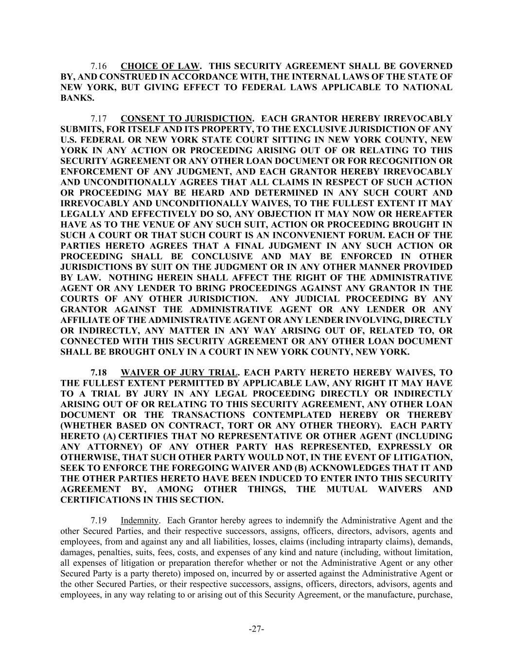 -27- 7.16 CHOICE OF LAW. THIS SECURITY AGREEMENT SHALL BE GOVERNED BY, AND CONSTRUED IN ACCORDANCE WITH, THE INTERNAL LAWS OF THE STATE OF NEW YORK, BUT GIVING EFFECT TO FEDERAL LAWS APPLICABLE TO NATIONAL BANKS. 7.17 CONSENT TO JURISDICTION. EACH GRANTOR HEREBY IRREVOCABLY SUBMITS, FOR ITSELF AND ITS PROPERTY, TO THE EXCLUSIVE JURISDICTION OF ANY U.S. FEDERAL OR NEW YORK STATE COURT SITTING IN NEW YORK COUNTY, NEW YORK IN ANY ACTION OR PROCEEDING ARISING OUT OF OR RELATING TO THIS SECURITY AGREEMENT OR ANY OTHER LOAN DOCUMENT OR FOR RECOGNITION OR ENFORCEMENT OF ANY JUDGMENT, AND EACH GRANTOR HEREBY IRREVOCABLY AND UNCONDITIONALLY AGREES THAT ALL CLAIMS IN RESPECT OF SUCH ACTION OR PROCEEDING MAY BE HEARD AND DETERMINED IN ANY SUCH COURT AND IRREVOCABLY AND UNCONDITIONALLY WAIVES, TO THE FULLEST EXTENT IT MAY LEGALLY AND EFFECTIVELY DO SO, ANY OBJECTION IT MAY NOW OR HEREAFTER HAVE AS TO THE VENUE OF ANY SUCH SUIT, ACTION OR PROCEEDING BROUGHT IN SUCH A COURT OR THAT SUCH COURT IS AN INCONVENIENT FORUM. EACH OF THE PARTIES HERETO AGREES THAT A FINAL JUDGMENT IN ANY SUCH ACTION OR PROCEEDING SHALL BE CONCLUSIVE AND MAY BE ENFORCED IN OTHER JURISDICTIONS BY SUIT ON THE JUDGMENT OR IN ANY OTHER MANNER PROVIDED BY LAW. NOTHING HEREIN SHALL AFFECT THE RIGHT OF THE ADMINISTRATIVE AGENT OR ANY LENDER TO BRING PROCEEDINGS AGAINST ANY GRANTOR IN THE COURTS OF ANY OTHER JURISDICTION. ANY JUDICIAL PROCEEDING BY ANY GRANTOR AGAINST THE ADMINISTRATIVE AGENT OR ANY LENDER OR ANY AFFILIATE OF THE ADMINISTRATIVE AGENT OR ANY LENDER INVOLVING, DIRECTLY OR INDIRECTLY, ANY MATTER IN ANY WAY ARISING OUT OF, RELATED TO, OR CONNECTED WITH THIS SECURITY AGREEMENT OR ANY OTHER LOAN DOCUMENT SHALL BE BROUGHT ONLY IN A COURT IN NEW YORK COUNTY, NEW YORK. 7.18 WAIVER OF JURY TRIAL. EACH PARTY HERETO HEREBY WAIVES, TO THE FULLEST EXTENT PERMITTED BY APPLICABLE LAW, ANY RIGHT IT MAY HAVE TO A TRIAL BY JURY IN ANY LEGAL PROCEEDING DIRECTLY OR INDIRECTLY ARISING OUT OF OR RELATING TO THIS SECURITY AGREEMENT, ANY OTHER LOAN DOCUMENT OR THE TRANSACTIONS CONTEMPLATED HEREBY OR THEREBY (WHETHER BASED ON CONTRACT, TORT OR ANY OTHER THEORY). EACH PARTY HERETO (A) CERTIFIES THAT NO REPRESENTATIVE OR OTHER AGENT (INCLUDING ANY ATTORNEY) OF ANY OTHER PARTY HAS REPRESENTED, EXPRESSLY OR OTHERWISE, THAT SUCH OTHER PARTY WOULD NOT, IN THE EVENT OF LITIGATION, SEEK TO ENFORCE THE FOREGOING WAIVER AND (B) ACKNOWLEDGES THAT IT AND THE OTHER PARTIES HERETO HAVE BEEN INDUCED TO ENTER INTO THIS SECURITY AGREEMENT BY, AMONG OTHER THINGS, THE MUTUAL WAIVERS AND CERTIFICATIONS IN THIS SECTION. 7.19 Indemnity. Each Grantor hereby agrees to indemnify the Administrative Agent and the other Secured Parties, and their respective successors, assigns, officers, directors, advisors, agents and employees, from and against any and all liabilities, losses, claims (including intraparty claims), demands, damages, penalties, suits, fees, costs, and expenses of any kind and nature (including, without limitation, all expenses of litigation or preparation therefor whether or not the Administrative Agent or any other Secured Party is a party thereto) imposed on, incurred by or asserted against the Administrative Agent or the other Secured Parties, or their respective successors, assigns, officers, directors, advisors, agents and employees, in any way relating to or arising out of this Security Agreement, or the manufacture, purchase,