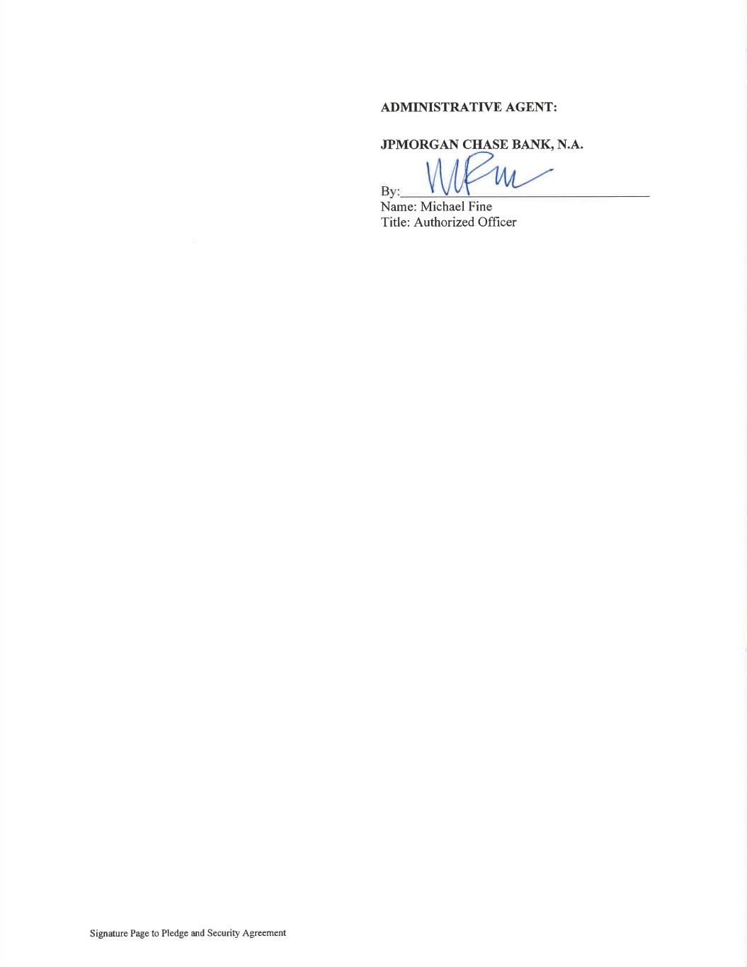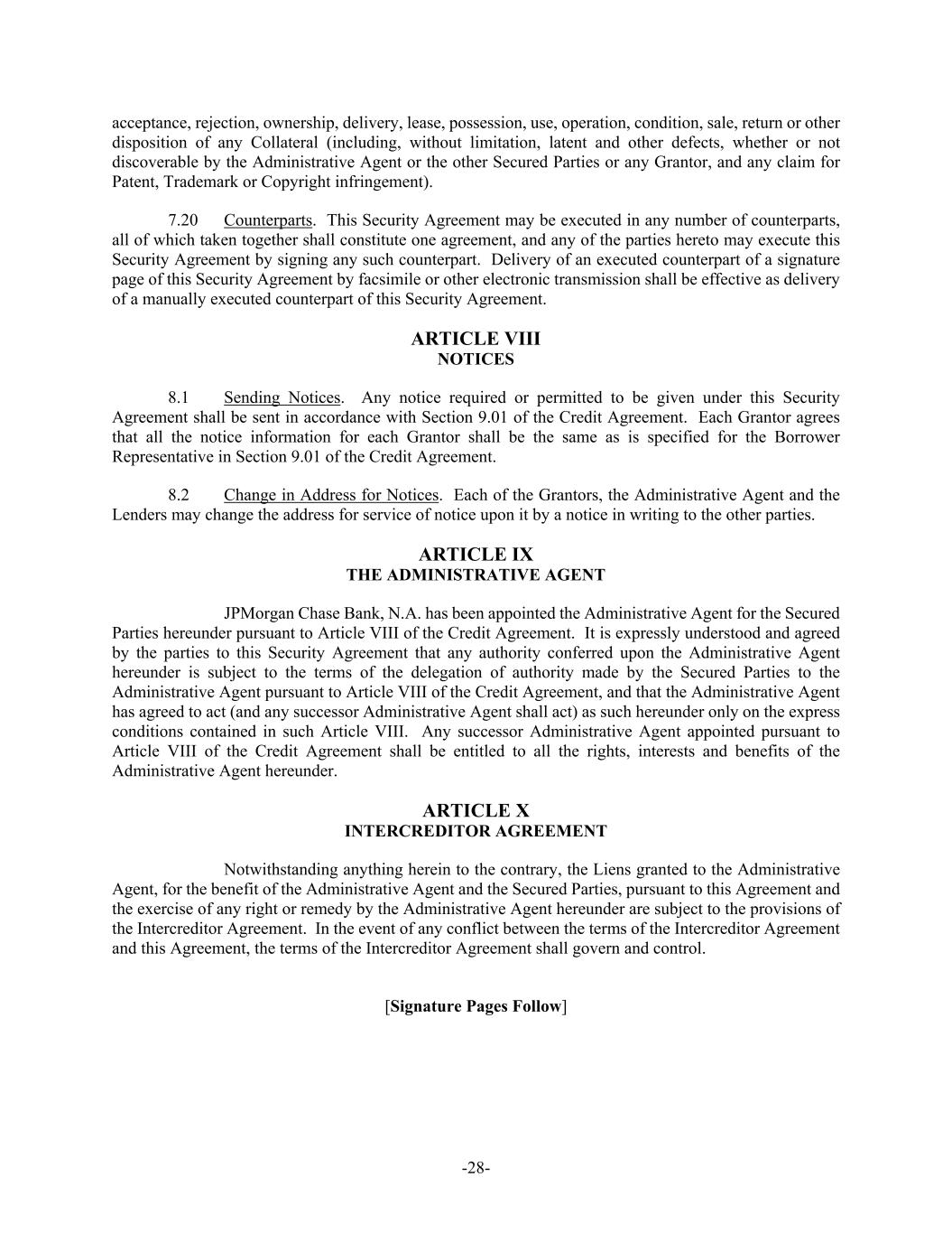 -28- acceptance, rejection, ownership, delivery, lease, possession, use, operation, condition, sale, return or other disposition of any Collateral (including, without limitation, latent and other defects, whether or not discoverable by the Administrative Agent or the other Secured Parties or any Grantor, and any claim for Patent, Trademark or Copyright infringement). 7.20 Counterparts. This Security Agreement may be executed in any number of counterparts, all of which taken together shall constitute one agreement, and any of the parties hereto may execute this Security Agreement by signing any such counterpart. Delivery of an executed counterpart of a signature page of this Security Agreement by facsimile or other electronic transmission shall be effective as delivery of a manually executed counterpart of this Security Agreement. ARTICLE VIII NOTICES 8.1 Sending Notices. Any notice required or permitted to be given under this Security Agreement shall be sent in accordance with Section 9.01 of the Credit Agreement. Each Grantor agrees that all the notice information for each Grantor shall be the same as is specified for the Borrower Representative in Section 9.01 of the Credit Agreement. 8.2 Change in Address for Notices. Each of the Grantors, the Administrative Agent and the Lenders may change the address for service of notice upon it by a notice in writing to the other parties. ARTICLE IX THE ADMINISTRATIVE AGENT JPMorgan Chase Bank, N.A. has been appointed the Administrative Agent for the Secured Parties hereunder pursuant to Article VIII of the Credit Agreement. It is expressly understood and agreed by the parties to this Security Agreement that any authority conferred upon the Administrative Agent hereunder is subject to the terms of the delegation of authority made by the Secured Parties to the Administrative Agent pursuant to Article VIII of the Credit Agreement, and that the Administrative Agent has agreed to act (and any successor Administrative Agent shall act) as such hereunder only on the express conditions contained in such Article VIII. Any successor Administrative Agent appointed pursuant to Article VIII of the Credit Agreement shall be entitled to all the rights, interests and benefits of the Administrative Agent hereunder. ARTICLE X INTERCREDITOR AGREEMENT Notwithstanding anything herein to the contrary, the Liens granted to the Administrative Agent, for the benefit of the Administrative Agent and the Secured Parties, pursuant to this Agreement and the exercise of any right or remedy by the Administrative Agent hereunder are subject to the provisions of the Intercreditor Agreement. In the event of any conflict between the terms of the Intercreditor Agreement and this Agreement, the terms of the Intercreditor Agreement shall govern and control. [Signature Pages Follow]