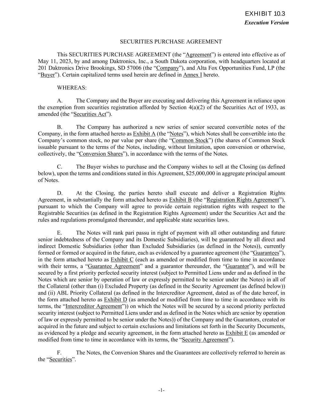 Execution Version SECURITIES PURCHASE AGREEMENT This SECURITIES PURCHASE AGREEMENT (the “Agreement”) is entered into effective as of May 11, 2023, by and among Daktronics, Inc., a South Dakota corporation, with headquarters located at 201 Daktronics Drive Brookings, SD 57006 (the “Company”), and Alta Fox Opportunities Fund, LP (the “Buyer”). Certain capitalized terms used herein are defined in Annex I hereto. WHEREAS: A. The Company and the Buyer are executing and delivering this Agreement in reliance upon the exemption from securities registration afforded by Section 4(a)(2) of the Securities Act of 1933, as amended (the “Securities Act”). B. The Company has authorized a new series of senior secured convertible notes of the Company, in the form attached hereto as Exhibit A (the “Notes”), which Notes shall be convertible into the Company’s common stock, no par value per share (the “Common Stock”) (the shares of Common Stock issuable pursuant to the terms of the Notes, including, without limitation, upon conversion or otherwise, collectively, the “Conversion Shares”), in accordance with the terms of the Notes. C. The Buyer wishes to purchase and the Company wishes to sell at the Closing (as defined below), upon the terms and conditions stated in this Agreement, $25,000,000 in aggregate principal amount of Notes. D. At the Closing, the parties hereto shall execute and deliver a Registration Rights Agreement, in substantially the form attached hereto as Exhibit B (the “Registration Rights Agreement”), pursuant to which the Company will agree to provide certain registration rights with respect to the Registrable Securities (as defined in the Registration Rights Agreement) under the Securities Act and the rules and regulations promulgated thereunder, and applicable state securities laws. E. The Notes will rank pari passu in right of payment with all other outstanding and future senior indebtedness of the Company and its Domestic Subsidiaries), will be guaranteed by all direct and indirect Domestic Subsidiaries (other than Excluded Subsidiaries (as defined in the Notes)), currently formed or formed or acquired in the future, each as evidenced by a guarantee agreement (the “Guarantees”), in the form attached hereto as Exhibit C (each as amended or modified from time to time in accordance with their terms, a “Guarantee Agreement” and a guarantor thereunder, the “Guarantor”), and will be secured by a first priority perfected security interest (subject to Permitted Liens under and as defined in the Notes which are senior by operation of law or expressly permitted to be senior under the Notes) in all of the Collateral (other than (i) Excluded Property (as defined in the Security Agreement (as defined below)) and (ii) ABL Priority Collateral (as defined in the Intercreditor Agreement, dated as of the date hereof, in the form attached hereto as Exhibit D (as amended or modified from time to time in accordance with its terms, the “Intercreditor Agreement”)) on which the Notes will be secured by a second priority perfected security interest (subject to Permitted Liens under and as defined in the Notes which are senior by operation of law or expressly permitted to be senior under the Notes)) of the Company and the Guarantors, created or acquired in the future and subject to certain exclusions and limitations set forth in the Security Documents, as evidenced by a pledge and security agreement, in the form attached hereto as Exhibit E (as amended or modified from time to time in accordance with its terms, the “Security Agreement”). F. The Notes, the Conversion Shares and the Guarantees are collectively referred to herein as the “Securities”. -1- EXHIBIT 10.3