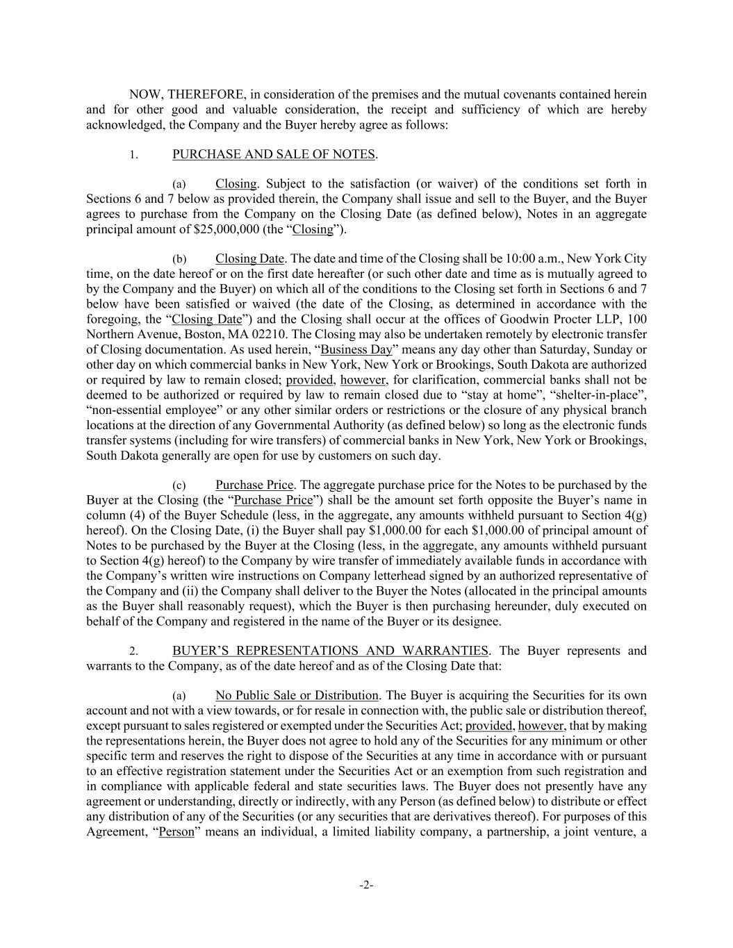-2- NOW, THEREFORE, in consideration of the premises and the mutual covenants contained herein and for other good and valuable consideration, the receipt and sufficiency of which are hereby acknowledged, the Company and the Buyer hereby agree as follows: 1. PURCHASE AND SALE OF NOTES. (a) Closing. Subject to the satisfaction (or waiver) of the conditions set forth in Sections 6 and 7 below as provided therein, the Company shall issue and sell to the Buyer, and the Buyer agrees to purchase from the Company on the Closing Date (as defined below), Notes in an aggregate principal amount of $25,000,000 (the “Closing”). (b) Closing Date. The date and time of the Closing shall be 10:00 a.m., New York City time, on the date hereof or on the first date hereafter (or such other date and time as is mutually agreed to by the Company and the Buyer) on which all of the conditions to the Closing set forth in Sections 6 and 7 below have been satisfied or waived (the date of the Closing, as determined in accordance with the foregoing, the “Closing Date”) and the Closing shall occur at the offices of Goodwin Procter LLP, 100 Northern Avenue, Boston, MA 02210. The Closing may also be undertaken remotely by electronic transfer of Closing documentation. As used herein, “Business Day” means any day other than Saturday, Sunday or other day on which commercial banks in New York, New York or Brookings, South Dakota are authorized or required by law to remain closed; provided, however, for clarification, commercial banks shall not be deemed to be authorized or required by law to remain closed due to “stay at home”, “shelter-in-place”, “non-essential employee” or any other similar orders or restrictions or the closure of any physical branch locations at the direction of any Governmental Authority (as defined below) so long as the electronic funds transfer systems (including for wire transfers) of commercial banks in New York, New York or Brookings, South Dakota generally are open for use by customers on such day. (c) Purchase Price. The aggregate purchase price for the Notes to be purchased by the Buyer at the Closing (the “Purchase Price”) shall be the amount set forth opposite the Buyer’s name in column (4) of the Buyer Schedule (less, in the aggregate, any amounts withheld pursuant to Section 4(g) hereof). On the Closing Date, (i) the Buyer shall pay $1,000.00 for each $1,000.00 of principal amount of Notes to be purchased by the Buyer at the Closing (less, in the aggregate, any amounts withheld pursuant to Section 4(g) hereof) to the Company by wire transfer of immediately available funds in accordance with the Company’s written wire instructions on Company letterhead signed by an authorized representative of the Company and (ii) the Company shall deliver to the Buyer the Notes (allocated in the principal amounts as the Buyer shall reasonably request), which the Buyer is then purchasing hereunder, duly executed on behalf of the Company and registered in the name of the Buyer or its designee. 2. BUYER’S REPRESENTATIONS AND WARRANTIES. The Buyer represents and warrants to the Company, as of the date hereof and as of the Closing Date that: (a) No Public Sale or Distribution. The Buyer is acquiring the Securities for its own account and not with a view towards, or for resale in connection with, the public sale or distribution thereof, except pursuant to sales registered or exempted under the Securities Act; provided, however, that by making the representations herein, the Buyer does not agree to hold any of the Securities for any minimum or other specific term and reserves the right to dispose of the Securities at any time in accordance with or pursuant to an effective registration statement under the Securities Act or an exemption from such registration and in compliance with applicable federal and state securities laws. The Buyer does not presently have any agreement or understanding, directly or indirectly, with any Person (as defined below) to distribute or effect any distribution of any of the Securities (or any securities that are derivatives thereof). For purposes of this Agreement, “Person” means an individual, a limited liability company, a partnership, a joint venture, a