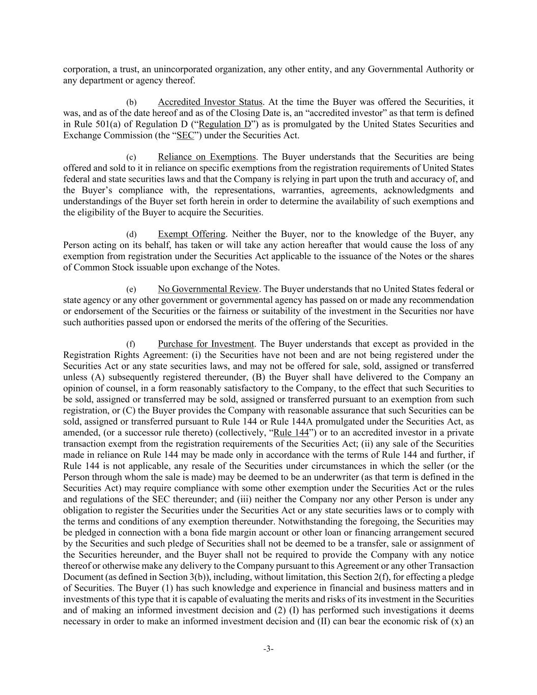 -3- corporation, a trust, an unincorporated organization, any other entity, and any Governmental Authority or any department or agency thereof. (b) Accredited Investor Status. At the time the Buyer was offered the Securities, it was, and as of the date hereof and as of the Closing Date is, an “accredited investor” as that term is defined in Rule 501(a) of Regulation D (“Regulation D”) as is promulgated by the United States Securities and Exchange Commission (the “SEC”) under the Securities Act. (c) Reliance on Exemptions. The Buyer understands that the Securities are being offered and sold to it in reliance on specific exemptions from the registration requirements of United States federal and state securities laws and that the Company is relying in part upon the truth and accuracy of, and the Buyer’s compliance with, the representations, warranties, agreements, acknowledgments and understandings of the Buyer set forth herein in order to determine the availability of such exemptions and the eligibility of the Buyer to acquire the Securities. (d) Exempt Offering. Neither the Buyer, nor to the knowledge of the Buyer, any Person acting on its behalf, has taken or will take any action hereafter that would cause the loss of any exemption from registration under the Securities Act applicable to the issuance of the Notes or the shares of Common Stock issuable upon exchange of the Notes. (e) No Governmental Review. The Buyer understands that no United States federal or state agency or any other government or governmental agency has passed on or made any recommendation or endorsement of the Securities or the fairness or suitability of the investment in the Securities nor have such authorities passed upon or endorsed the merits of the offering of the Securities. (f) Purchase for Investment. The Buyer understands that except as provided in the Registration Rights Agreement: (i) the Securities have not been and are not being registered under the Securities Act or any state securities laws, and may not be offered for sale, sold, assigned or transferred unless (A) subsequently registered thereunder, (B) the Buyer shall have delivered to the Company an opinion of counsel, in a form reasonably satisfactory to the Company, to the effect that such Securities to be sold, assigned or transferred may be sold, assigned or transferred pursuant to an exemption from such registration, or (C) the Buyer provides the Company with reasonable assurance that such Securities can be sold, assigned or transferred pursuant to Rule 144 or Rule 144A promulgated under the Securities Act, as amended, (or a successor rule thereto) (collectively, “Rule 144”) or to an accredited investor in a private transaction exempt from the registration requirements of the Securities Act; (ii) any sale of the Securities made in reliance on Rule 144 may be made only in accordance with the terms of Rule 144 and further, if Rule 144 is not applicable, any resale of the Securities under circumstances in which the seller (or the Person through whom the sale is made) may be deemed to be an underwriter (as that term is defined in the Securities Act) may require compliance with some other exemption under the Securities Act or the rules and regulations of the SEC thereunder; and (iii) neither the Company nor any other Person is under any obligation to register the Securities under the Securities Act or any state securities laws or to comply with the terms and conditions of any exemption thereunder. Notwithstanding the foregoing, the Securities may be pledged in connection with a bona fide margin account or other loan or financing arrangement secured by the Securities and such pledge of Securities shall not be deemed to be a transfer, sale or assignment of the Securities hereunder, and the Buyer shall not be required to provide the Company with any notice thereof or otherwise make any delivery to the Company pursuant to this Agreement or any other Transaction Document (as defined in Section 3(b)), including, without limitation, this Section 2(f), for effecting a pledge of Securities. The Buyer (1) has such knowledge and experience in financial and business matters and in investments of this type that it is capable of evaluating the merits and risks of its investment in the Securities and of making an informed investment decision and (2) (I) has performed such investigations it deems necessary in order to make an informed investment decision and (II) can bear the economic risk of (x) an