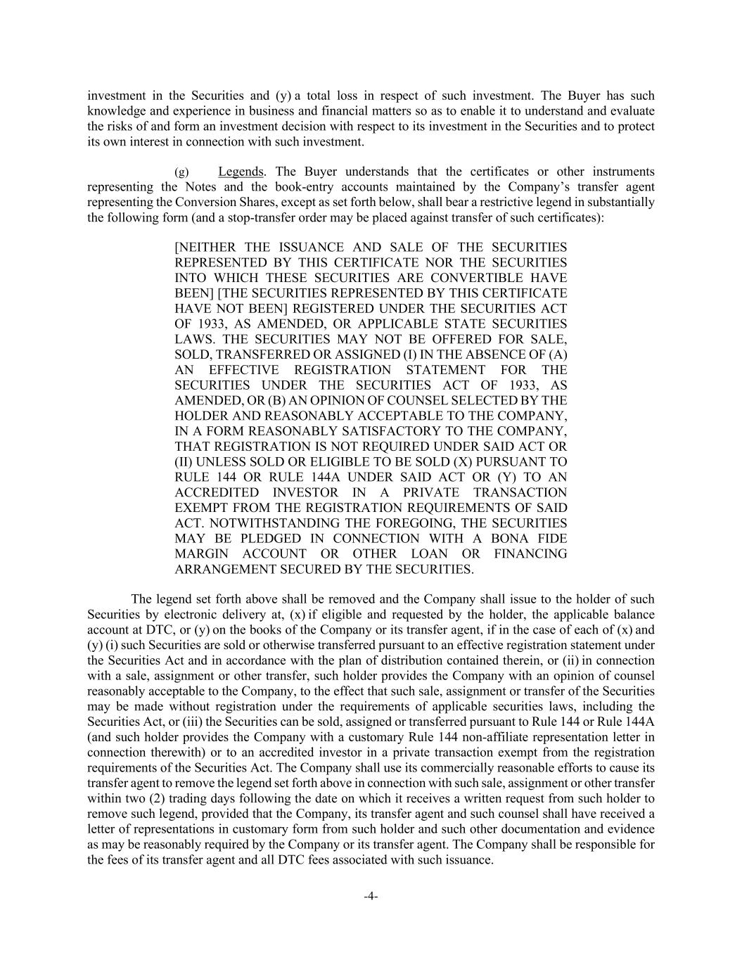 -4- investment in the Securities and (y) a total loss in respect of such investment. The Buyer has such knowledge and experience in business and financial matters so as to enable it to understand and evaluate the risks of and form an investment decision with respect to its investment in the Securities and to protect its own interest in connection with such investment. (g) Legends. The Buyer understands that the certificates or other instruments representing the Notes and the book-entry accounts maintained by the Company’s transfer agent representing the Conversion Shares, except as set forth below, shall bear a restrictive legend in substantially the following form (and a stop-transfer order may be placed against transfer of such certificates): [NEITHER THE ISSUANCE AND SALE OF THE SECURITIES REPRESENTED BY THIS CERTIFICATE NOR THE SECURITIES INTO WHICH THESE SECURITIES ARE CONVERTIBLE HAVE BEEN] [THE SECURITIES REPRESENTED BY THIS CERTIFICATE HAVE NOT BEEN] REGISTERED UNDER THE SECURITIES ACT OF 1933, AS AMENDED, OR APPLICABLE STATE SECURITIES LAWS. THE SECURITIES MAY NOT BE OFFERED FOR SALE, SOLD, TRANSFERRED OR ASSIGNED (I) IN THE ABSENCE OF (A) AN EFFECTIVE REGISTRATION STATEMENT FOR THE SECURITIES UNDER THE SECURITIES ACT OF 1933, AS AMENDED, OR (B) AN OPINION OF COUNSEL SELECTED BY THE HOLDER AND REASONABLY ACCEPTABLE TO THE COMPANY, IN A FORM REASONABLY SATISFACTORY TO THE COMPANY, THAT REGISTRATION IS NOT REQUIRED UNDER SAID ACT OR (II) UNLESS SOLD OR ELIGIBLE TO BE SOLD (X) PURSUANT TO RULE 144 OR RULE 144A UNDER SAID ACT OR (Y) TO AN ACCREDITED INVESTOR IN A PRIVATE TRANSACTION EXEMPT FROM THE REGISTRATION REQUIREMENTS OF SAID ACT. NOTWITHSTANDING THE FOREGOING, THE SECURITIES MAY BE PLEDGED IN CONNECTION WITH A BONA FIDE MARGIN ACCOUNT OR OTHER LOAN OR FINANCING ARRANGEMENT SECURED BY THE SECURITIES. The legend set forth above shall be removed and the Company shall issue to the holder of such Securities by electronic delivery at, (x) if eligible and requested by the holder, the applicable balance account at DTC, or (y) on the books of the Company or its transfer agent, if in the case of each of (x) and (y) (i) such Securities are sold or otherwise transferred pursuant to an effective registration statement under the Securities Act and in accordance with the plan of distribution contained therein, or (ii) in connection with a sale, assignment or other transfer, such holder provides the Company with an opinion of counsel reasonably acceptable to the Company, to the effect that such sale, assignment or transfer of the Securities may be made without registration under the requirements of applicable securities laws, including the Securities Act, or (iii) the Securities can be sold, assigned or transferred pursuant to Rule 144 or Rule 144A (and such holder provides the Company with a customary Rule 144 non-affiliate representation letter in connection therewith) or to an accredited investor in a private transaction exempt from the registration requirements of the Securities Act. The Company shall use its commercially reasonable efforts to cause its transfer agent to remove the legend set forth above in connection with such sale, assignment or other transfer within two (2) trading days following the date on which it receives a written request from such holder to remove such legend, provided that the Company, its transfer agent and such counsel shall have received a letter of representations in customary form from such holder and such other documentation and evidence as may be reasonably required by the Company or its transfer agent. The Company shall be responsible for the fees of its transfer agent and all DTC fees associated with such issuance.