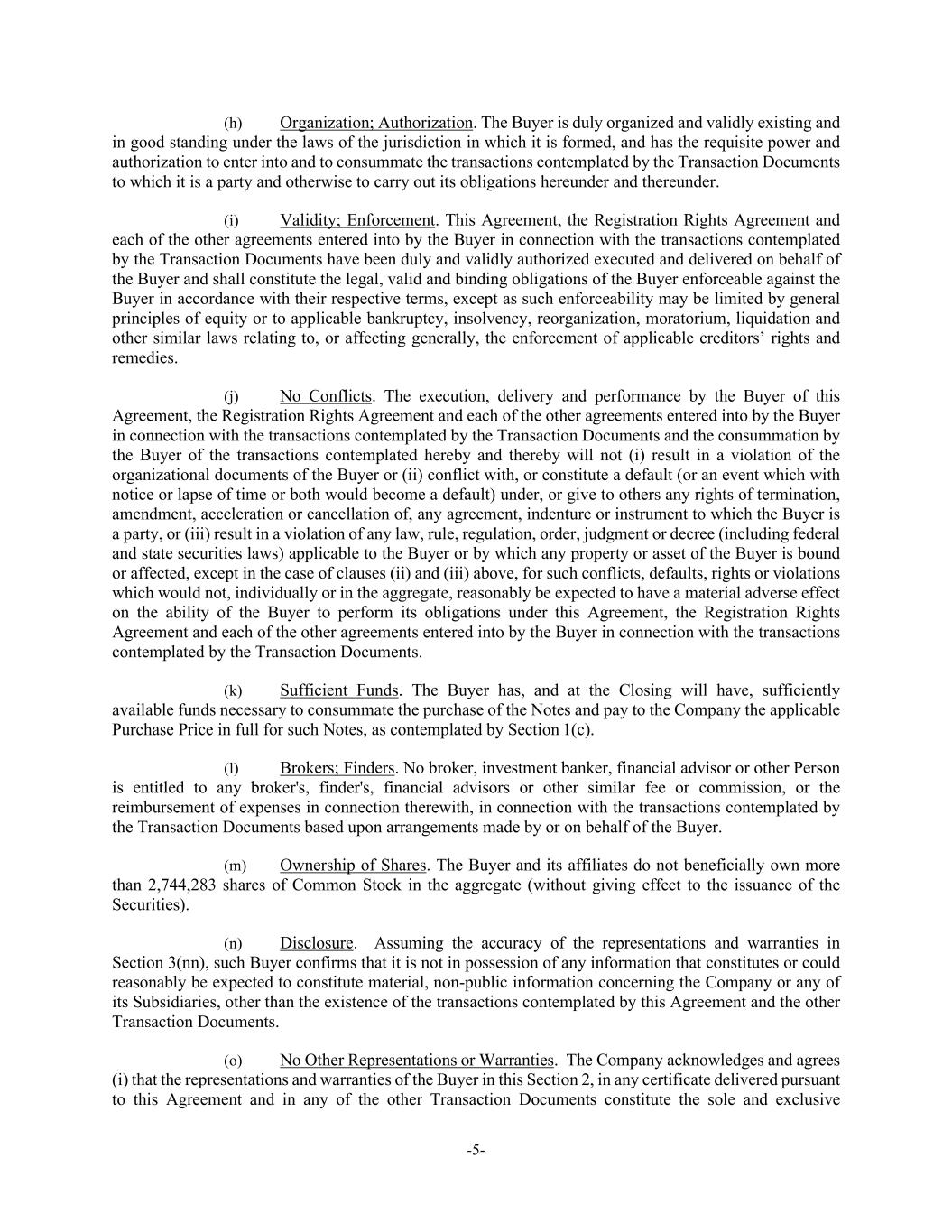 -5- (h) Organization; Authorization. The Buyer is duly organized and validly existing and in good standing under the laws of the jurisdiction in which it is formed, and has the requisite power and authorization to enter into and to consummate the transactions contemplated by the Transaction Documents to which it is a party and otherwise to carry out its obligations hereunder and thereunder. (i) Validity; Enforcement. This Agreement, the Registration Rights Agreement and each of the other agreements entered into by the Buyer in connection with the transactions contemplated by the Transaction Documents have been duly and validly authorized executed and delivered on behalf of the Buyer and shall constitute the legal, valid and binding obligations of the Buyer enforceable against the Buyer in accordance with their respective terms, except as such enforceability may be limited by general principles of equity or to applicable bankruptcy, insolvency, reorganization, moratorium, liquidation and other similar laws relating to, or affecting generally, the enforcement of applicable creditors’ rights and remedies. (j) No Conflicts. The execution, delivery and performance by the Buyer of this Agreement, the Registration Rights Agreement and each of the other agreements entered into by the Buyer in connection with the transactions contemplated by the Transaction Documents and the consummation by the Buyer of the transactions contemplated hereby and thereby will not (i) result in a violation of the organizational documents of the Buyer or (ii) conflict with, or constitute a default (or an event which with notice or lapse of time or both would become a default) under, or give to others any rights of termination, amendment, acceleration or cancellation of, any agreement, indenture or instrument to which the Buyer is a party, or (iii) result in a violation of any law, rule, regulation, order, judgment or decree (including federal and state securities laws) applicable to the Buyer or by which any property or asset of the Buyer is bound or affected, except in the case of clauses (ii) and (iii) above, for such conflicts, defaults, rights or violations which would not, individually or in the aggregate, reasonably be expected to have a material adverse effect on the ability of the Buyer to perform its obligations under this Agreement, the Registration Rights Agreement and each of the other agreements entered into by the Buyer in connection with the transactions contemplated by the Transaction Documents. (k) Sufficient Funds. The Buyer has, and at the Closing will have, sufficiently available funds necessary to consummate the purchase of the Notes and pay to the Company the applicable Purchase Price in full for such Notes, as contemplated by Section 1(c). (l) Brokers; Finders. No broker, investment banker, financial advisor or other Person is entitled to any broker's, finder's, financial advisors or other similar fee or commission, or the reimbursement of expenses in connection therewith, in connection with the transactions contemplated by the Transaction Documents based upon arrangements made by or on behalf of the Buyer. (m) Ownership of Shares. The Buyer and its affiliates do not beneficially own more than 2,744,283 shares of Common Stock in the aggregate (without giving effect to the issuance of the Securities). (n) Disclosure. Assuming the accuracy of the representations and warranties in Section 3(nn), such Buyer confirms that it is not in possession of any information that constitutes or could reasonably be expected to constitute material, non-public information concerning the Company or any of its Subsidiaries, other than the existence of the transactions contemplated by this Agreement and the other Transaction Documents. (o) No Other Representations or Warranties. The Company acknowledges and agrees (i) that the representations and warranties of the Buyer in this Section 2, in any certificate delivered pursuant to this Agreement and in any of the other Transaction Documents constitute the sole and exclusive
