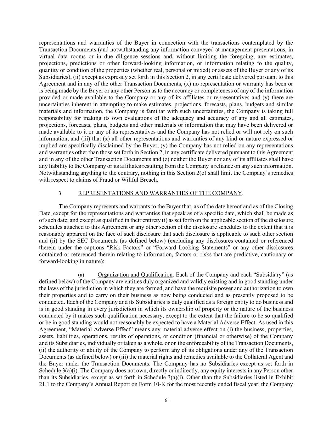 -6- representations and warranties of the Buyer in connection with the transactions contemplated by the Transaction Documents (and notwithstanding any information conveyed at management presentations, in virtual data rooms or in due diligence sessions and, without limiting the foregoing, any estimates, projections, predictions or other forward-looking information, or information relating to the quality, quantity or condition of the properties (whether real, personal or mixed) or assets of the Buyer or any of its Subsidiaries), (ii) except as expressly set forth in this Section 2, in any certificate delivered pursuant to this Agreement and in any of the other Transaction Documents, (x) no representation or warranty has been or is being made by the Buyer or any other Person as to the accuracy or completeness of any of the information provided or made available to the Company or any of its affiliates or representatives and (y) there are uncertainties inherent in attempting to make estimates, projections, forecasts, plans, budgets and similar materials and information, the Company is familiar with such uncertainties, the Company is taking full responsibility for making its own evaluations of the adequacy and accuracy of any and all estimates, projections, forecasts, plans, budgets and other materials or information that may have been delivered or made available to it or any of its representatives and the Company has not relied or will not rely on such information, and (iii) that (x) all other representations and warranties of any kind or nature expressed or implied are specifically disclaimed by the Buyer, (y) the Company has not relied on any representations and warranties other than those set forth in Section 2, in any certificate delivered pursuant to this Agreement and in any of the other Transaction Documents and (z) neither the Buyer nor any of its affiliates shall have any liability to the Company or its affiliates resulting from the Company’s reliance on any such information. Notwithstanding anything to the contrary, nothing in this Section 2(o) shall limit the Company’s remedies with respect to claims of Fraud or Willful Breach. 3. REPRESENTATIONS AND WARRANTIES OF THE COMPANY. The Company represents and warrants to the Buyer that, as of the date hereof and as of the Closing Date, except for the representations and warranties that speak as of a specific date, which shall be made as of such date, and except as qualified in their entirety (i) as set forth on the applicable section of the disclosure schedules attached to this Agreement or any other section of the disclosure schedules to the extent that it is reasonably apparent on the face of such disclosure that such disclosure is applicable to such other section and (ii) by the SEC Documents (as defined below) (excluding any disclosures contained or referenced therein under the captions “Risk Factors” or “Forward Looking Statements” or any other disclosures contained or referenced therein relating to information, factors or risks that are predictive, cautionary or forward-looking in nature): (a) Organization and Qualification. Each of the Company and each “Subsidiary” (as defined below) of the Company are entities duly organized and validly existing and in good standing under the laws of the jurisdiction in which they are formed, and have the requisite power and authorization to own their properties and to carry on their business as now being conducted and as presently proposed to be conducted. Each of the Company and its Subsidiaries is duly qualified as a foreign entity to do business and is in good standing in every jurisdiction in which its ownership of property or the nature of the business conducted by it makes such qualification necessary, except to the extent that the failure to be so qualified or be in good standing would not reasonably be expected to have a Material Adverse Effect. As used in this Agreement, “Material Adverse Effect” means any material adverse effect on (i) the business, properties, assets, liabilities, operations, results of operations, or condition (financial or otherwise) of the Company and its Subsidiaries, individually or taken as a whole, or on the enforceability of the Transaction Documents, (ii) the authority or ability of the Company to perform any of its obligations under any of the Transaction Documents (as defined below) or (iii) the material rights and remedies available to the Collateral Agent and the Buyer under the Transaction Documents. The Company has no Subsidiaries except as set forth in Schedule 3(a)(i). The Company does not own, directly or indirectly, any equity interests in any Person other than its Subsidiaries, except as set forth in Schedule 3(a)(i). Other than the Subsidiaries listed in Exhibit 21.1 to the Company’s Annual Report on Form 10-K for the most recently ended fiscal year, the Company