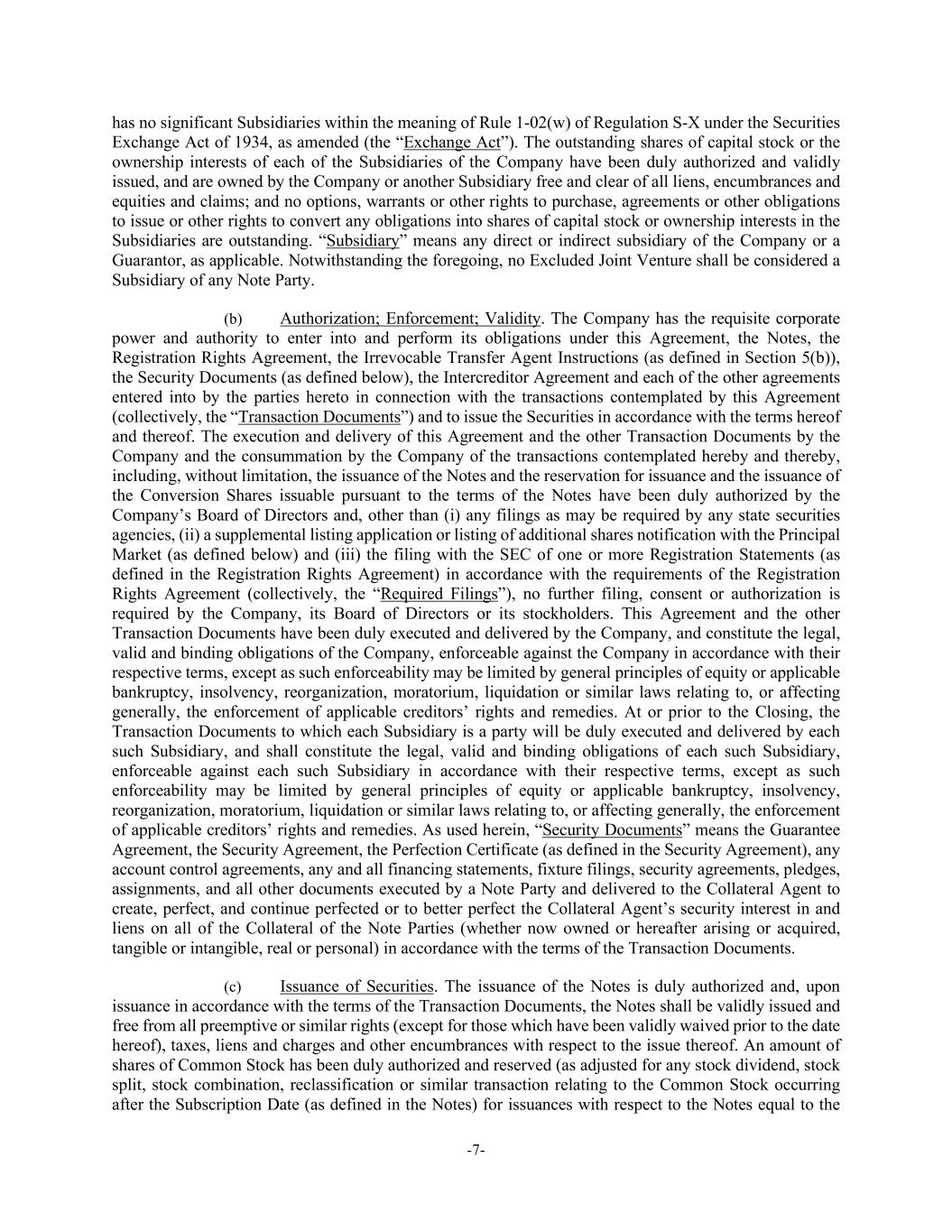 -7- has no significant Subsidiaries within the meaning of Rule 1-02(w) of Regulation S-X under the Securities Exchange Act of 1934, as amended (the “Exchange Act”). The outstanding shares of capital stock or the ownership interests of each of the Subsidiaries of the Company have been duly authorized and validly issued, and are owned by the Company or another Subsidiary free and clear of all liens, encumbrances and equities and claims; and no options, warrants or other rights to purchase, agreements or other obligations to issue or other rights to convert any obligations into shares of capital stock or ownership interests in the Subsidiaries are outstanding. “Subsidiary” means any direct or indirect subsidiary of the Company or a Guarantor, as applicable. Notwithstanding the foregoing, no Excluded Joint Venture shall be considered a Subsidiary of any Note Party. (b) Authorization; Enforcement; Validity. The Company has the requisite corporate power and authority to enter into and perform its obligations under this Agreement, the Notes, the Registration Rights Agreement, the Irrevocable Transfer Agent Instructions (as defined in Section 5(b)), the Security Documents (as defined below), the Intercreditor Agreement and each of the other agreements entered into by the parties hereto in connection with the transactions contemplated by this Agreement (collectively, the “Transaction Documents”) and to issue the Securities in accordance with the terms hereof and thereof. The execution and delivery of this Agreement and the other Transaction Documents by the Company and the consummation by the Company of the transactions contemplated hereby and thereby, including, without limitation, the issuance of the Notes and the reservation for issuance and the issuance of the Conversion Shares issuable pursuant to the terms of the Notes have been duly authorized by the Company’s Board of Directors and, other than (i) any filings as may be required by any state securities agencies, (ii) a supplemental listing application or listing of additional shares notification with the Principal Market (as defined below) and (iii) the filing with the SEC of one or more Registration Statements (as defined in the Registration Rights Agreement) in accordance with the requirements of the Registration Rights Agreement (collectively, the “Required Filings”), no further filing, consent or authorization is required by the Company, its Board of Directors or its stockholders. This Agreement and the other Transaction Documents have been duly executed and delivered by the Company, and constitute the legal, valid and binding obligations of the Company, enforceable against the Company in accordance with their respective terms, except as such enforceability may be limited by general principles of equity or applicable bankruptcy, insolvency, reorganization, moratorium, liquidation or similar laws relating to, or affecting generally, the enforcement of applicable creditors’ rights and remedies. At or prior to the Closing, the Transaction Documents to which each Subsidiary is a party will be duly executed and delivered by each such Subsidiary, and shall constitute the legal, valid and binding obligations of each such Subsidiary, enforceable against each such Subsidiary in accordance with their respective terms, except as such enforceability may be limited by general principles of equity or applicable bankruptcy, insolvency, reorganization, moratorium, liquidation or similar laws relating to, or affecting generally, the enforcement of applicable creditors’ rights and remedies. As used herein, “Security Documents” means the Guarantee Agreement, the Security Agreement, the Perfection Certificate (as defined in the Security Agreement), any account control agreements, any and all financing statements, fixture filings, security agreements, pledges, assignments, and all other documents executed by a Note Party and delivered to the Collateral Agent to create, perfect, and continue perfected or to better perfect the Collateral Agent’s security interest in and liens on all of the Collateral of the Note Parties (whether now owned or hereafter arising or acquired, tangible or intangible, real or personal) in accordance with the terms of the Transaction Documents. (c) Issuance of Securities. The issuance of the Notes is duly authorized and, upon issuance in accordance with the terms of the Transaction Documents, the Notes shall be validly issued and free from all preemptive or similar rights (except for those which have been validly waived prior to the date hereof), taxes, liens and charges and other encumbrances with respect to the issue thereof. An amount of shares of Common Stock has been duly authorized and reserved (as adjusted for any stock dividend, stock split, stock combination, reclassification or similar transaction relating to the Common Stock occurring after the Subscription Date (as defined in the Notes) for issuances with respect to the Notes equal to the