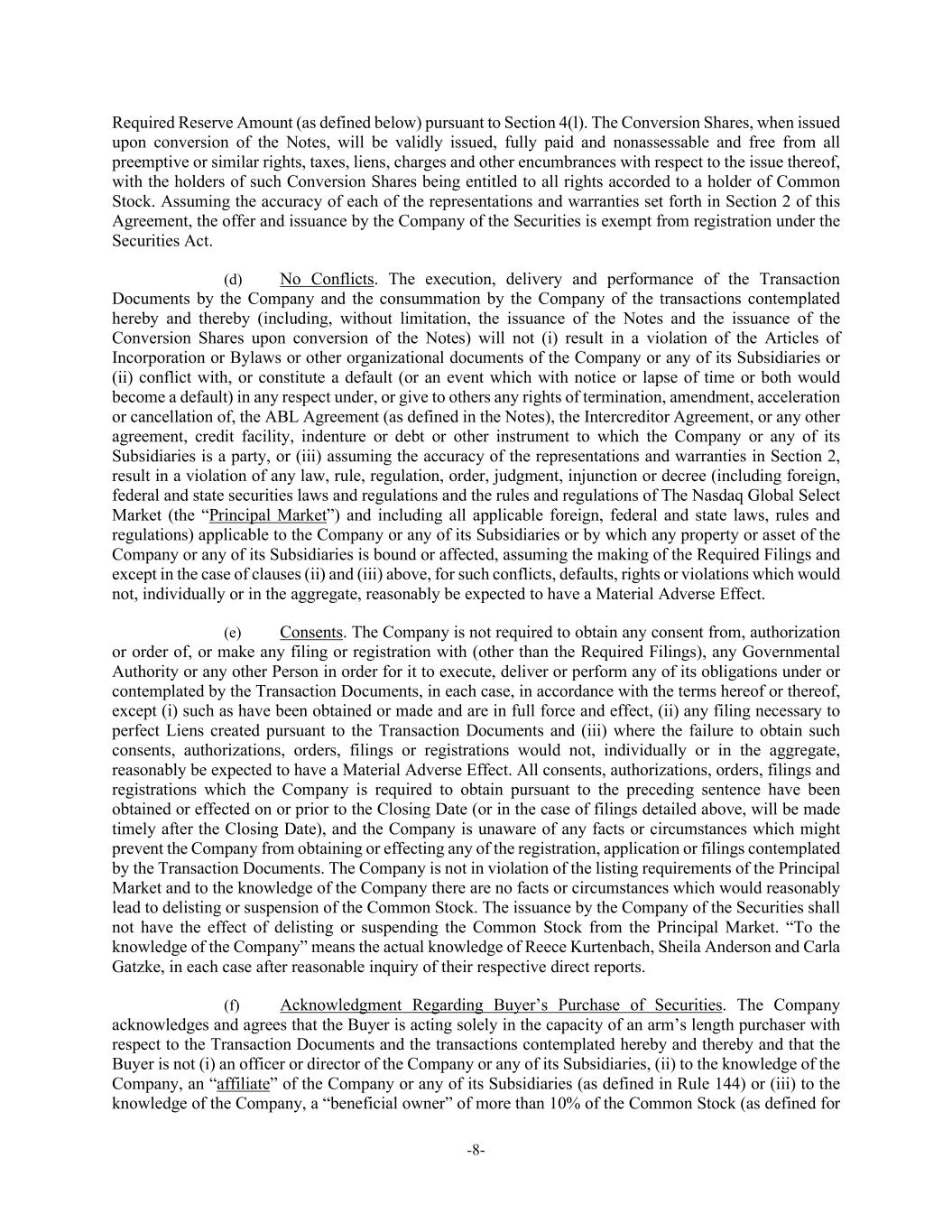 -8- Required Reserve Amount (as defined below) pursuant to Section 4(l). The Conversion Shares, when issued upon conversion of the Notes, will be validly issued, fully paid and nonassessable and free from all preemptive or similar rights, taxes, liens, charges and other encumbrances with respect to the issue thereof, with the holders of such Conversion Shares being entitled to all rights accorded to a holder of Common Stock. Assuming the accuracy of each of the representations and warranties set forth in Section 2 of this Agreement, the offer and issuance by the Company of the Securities is exempt from registration under the Securities Act. (d) No Conflicts. The execution, delivery and performance of the Transaction Documents by the Company and the consummation by the Company of the transactions contemplated hereby and thereby (including, without limitation, the issuance of the Notes and the issuance of the Conversion Shares upon conversion of the Notes) will not (i) result in a violation of the Articles of Incorporation or Bylaws or other organizational documents of the Company or any of its Subsidiaries or (ii) conflict with, or constitute a default (or an event which with notice or lapse of time or both would become a default) in any respect under, or give to others any rights of termination, amendment, acceleration or cancellation of, the ABL Agreement (as defined in the Notes), the Intercreditor Agreement, or any other agreement, credit facility, indenture or debt or other instrument to which the Company or any of its Subsidiaries is a party, or (iii) assuming the accuracy of the representations and warranties in Section 2, result in a violation of any law, rule, regulation, order, judgment, injunction or decree (including foreign, federal and state securities laws and regulations and the rules and regulations of The Nasdaq Global Select Market (the “Principal Market”) and including all applicable foreign, federal and state laws, rules and regulations) applicable to the Company or any of its Subsidiaries or by which any property or asset of the Company or any of its Subsidiaries is bound or affected, assuming the making of the Required Filings and except in the case of clauses (ii) and (iii) above, for such conflicts, defaults, rights or violations which would not, individually or in the aggregate, reasonably be expected to have a Material Adverse Effect. (e) Consents. The Company is not required to obtain any consent from, authorization or order of, or make any filing or registration with (other than the Required Filings), any Governmental Authority or any other Person in order for it to execute, deliver or perform any of its obligations under or contemplated by the Transaction Documents, in each case, in accordance with the terms hereof or thereof, except (i) such as have been obtained or made and are in full force and effect, (ii) any filing necessary to perfect Liens created pursuant to the Transaction Documents and (iii) where the failure to obtain such consents, authorizations, orders, filings or registrations would not, individually or in the aggregate, reasonably be expected to have a Material Adverse Effect. All consents, authorizations, orders, filings and registrations which the Company is required to obtain pursuant to the preceding sentence have been obtained or effected on or prior to the Closing Date (or in the case of filings detailed above, will be made timely after the Closing Date), and the Company is unaware of any facts or circumstances which might prevent the Company from obtaining or effecting any of the registration, application or filings contemplated by the Transaction Documents. The Company is not in violation of the listing requirements of the Principal Market and to the knowledge of the Company there are no facts or circumstances which would reasonably lead to delisting or suspension of the Common Stock. The issuance by the Company of the Securities shall not have the effect of delisting or suspending the Common Stock from the Principal Market. “To the knowledge of the Company” means the actual knowledge of Reece Kurtenbach, Sheila Anderson and Carla Gatzke, in each case after reasonable inquiry of their respective direct reports. (f) Acknowledgment Regarding Buyer’s Purchase of Securities. The Company acknowledges and agrees that the Buyer is acting solely in the capacity of an arm’s length purchaser with respect to the Transaction Documents and the transactions contemplated hereby and thereby and that the Buyer is not (i) an officer or director of the Company or any of its Subsidiaries, (ii) to the knowledge of the Company, an “affiliate” of the Company or any of its Subsidiaries (as defined in Rule 144) or (iii) to the knowledge of the Company, a “beneficial owner” of more than 10% of the Common Stock (as defined for