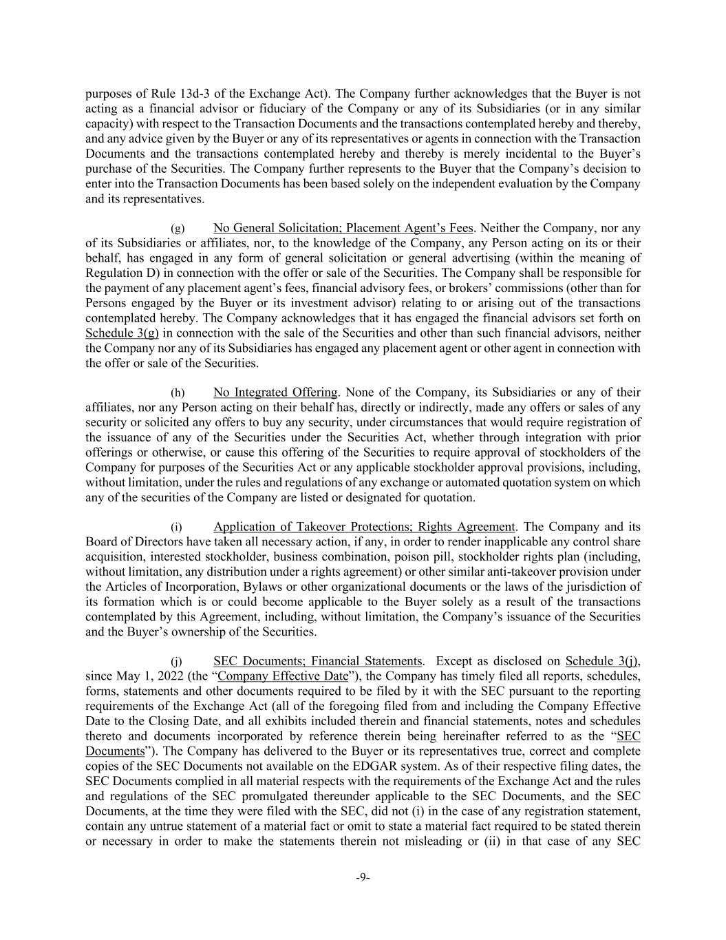 -9- purposes of Rule 13d-3 of the Exchange Act). The Company further acknowledges that the Buyer is not acting as a financial advisor or fiduciary of the Company or any of its Subsidiaries (or in any similar capacity) with respect to the Transaction Documents and the transactions contemplated hereby and thereby, and any advice given by the Buyer or any of its representatives or agents in connection with the Transaction Documents and the transactions contemplated hereby and thereby is merely incidental to the Buyer’s purchase of the Securities. The Company further represents to the Buyer that the Company’s decision to enter into the Transaction Documents has been based solely on the independent evaluation by the Company and its representatives. (g) No General Solicitation; Placement Agent’s Fees. Neither the Company, nor any of its Subsidiaries or affiliates, nor, to the knowledge of the Company, any Person acting on its or their behalf, has engaged in any form of general solicitation or general advertising (within the meaning of Regulation D) in connection with the offer or sale of the Securities. The Company shall be responsible for the payment of any placement agent’s fees, financial advisory fees, or brokers’ commissions (other than for Persons engaged by the Buyer or its investment advisor) relating to or arising out of the transactions contemplated hereby. The Company acknowledges that it has engaged the financial advisors set forth on Schedule 3(g) in connection with the sale of the Securities and other than such financial advisors, neither the Company nor any of its Subsidiaries has engaged any placement agent or other agent in connection with the offer or sale of the Securities. (h) No Integrated Offering. None of the Company, its Subsidiaries or any of their affiliates, nor any Person acting on their behalf has, directly or indirectly, made any offers or sales of any security or solicited any offers to buy any security, under circumstances that would require registration of the issuance of any of the Securities under the Securities Act, whether through integration with prior offerings or otherwise, or cause this offering of the Securities to require approval of stockholders of the Company for purposes of the Securities Act or any applicable stockholder approval provisions, including, without limitation, under the rules and regulations of any exchange or automated quotation system on which any of the securities of the Company are listed or designated for quotation. (i) Application of Takeover Protections; Rights Agreement. The Company and its Board of Directors have taken all necessary action, if any, in order to render inapplicable any control share acquisition, interested stockholder, business combination, poison pill, stockholder rights plan (including, without limitation, any distribution under a rights agreement) or other similar anti-takeover provision under the Articles of Incorporation, Bylaws or other organizational documents or the laws of the jurisdiction of its formation which is or could become applicable to the Buyer solely as a result of the transactions contemplated by this Agreement, including, without limitation, the Company’s issuance of the Securities and the Buyer’s ownership of the Securities. (j) SEC Documents; Financial Statements. Except as disclosed on Schedule 3(j), since May 1, 2022 (the “Company Effective Date”), the Company has timely filed all reports, schedules, forms, statements and other documents required to be filed by it with the SEC pursuant to the reporting requirements of the Exchange Act (all of the foregoing filed from and including the Company Effective Date to the Closing Date, and all exhibits included therein and financial statements, notes and schedules thereto and documents incorporated by reference therein being hereinafter referred to as the “SEC Documents”). The Company has delivered to the Buyer or its representatives true, correct and complete copies of the SEC Documents not available on the EDGAR system. As of their respective filing dates, the SEC Documents complied in all material respects with the requirements of the Exchange Act and the rules and regulations of the SEC promulgated thereunder applicable to the SEC Documents, and the SEC Documents, at the time they were filed with the SEC, did not (i) in the case of any registration statement, contain any untrue statement of a material fact or omit to state a material fact required to be stated therein or necessary in order to make the statements therein not misleading or (ii) in that case of any SEC