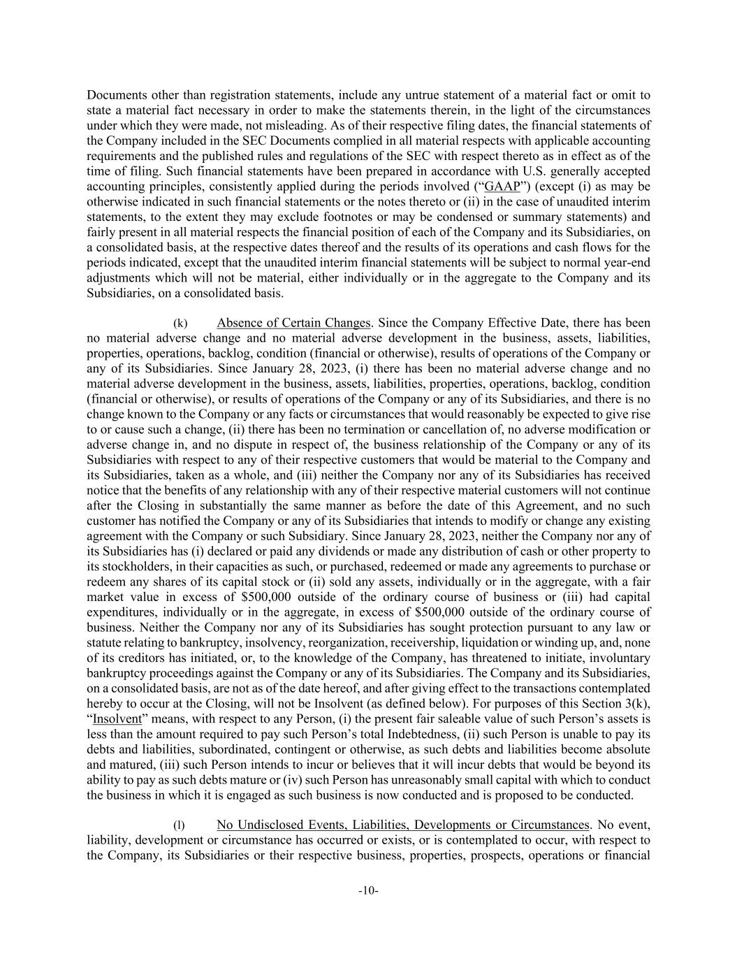 -10- Documents other than registration statements, include any untrue statement of a material fact or omit to state a material fact necessary in order to make the statements therein, in the light of the circumstances under which they were made, not misleading. As of their respective filing dates, the financial statements of the Company included in the SEC Documents complied in all material respects with applicable accounting requirements and the published rules and regulations of the SEC with respect thereto as in effect as of the time of filing. Such financial statements have been prepared in accordance with U.S. generally accepted accounting principles, consistently applied during the periods involved (“GAAP”) (except (i) as may be otherwise indicated in such financial statements or the notes thereto or (ii) in the case of unaudited interim statements, to the extent they may exclude footnotes or may be condensed or summary statements) and fairly present in all material respects the financial position of each of the Company and its Subsidiaries, on a consolidated basis, at the respective dates thereof and the results of its operations and cash flows for the periods indicated, except that the unaudited interim financial statements will be subject to normal year-end adjustments which will not be material, either individually or in the aggregate to the Company and its Subsidiaries, on a consolidated basis. (k) Absence of Certain Changes. Since the Company Effective Date, there has been no material adverse change and no material adverse development in the business, assets, liabilities, properties, operations, backlog, condition (financial or otherwise), results of operations of the Company or any of its Subsidiaries. Since January 28, 2023, (i) there has been no material adverse change and no material adverse development in the business, assets, liabilities, properties, operations, backlog, condition (financial or otherwise), or results of operations of the Company or any of its Subsidiaries, and there is no change known to the Company or any facts or circumstances that would reasonably be expected to give rise to or cause such a change, (ii) there has been no termination or cancellation of, no adverse modification or adverse change in, and no dispute in respect of, the business relationship of the Company or any of its Subsidiaries with respect to any of their respective customers that would be material to the Company and its Subsidiaries, taken as a whole, and (iii) neither the Company nor any of its Subsidiaries has received notice that the benefits of any relationship with any of their respective material customers will not continue after the Closing in substantially the same manner as before the date of this Agreement, and no such customer has notified the Company or any of its Subsidiaries that intends to modify or change any existing agreement with the Company or such Subsidiary. Since January 28, 2023, neither the Company nor any of its Subsidiaries has (i) declared or paid any dividends or made any distribution of cash or other property to its stockholders, in their capacities as such, or purchased, redeemed or made any agreements to purchase or redeem any shares of its capital stock or (ii) sold any assets, individually or in the aggregate, with a fair market value in excess of $500,000 outside of the ordinary course of business or (iii) had capital expenditures, individually or in the aggregate, in excess of $500,000 outside of the ordinary course of business. Neither the Company nor any of its Subsidiaries has sought protection pursuant to any law or statute relating to bankruptcy, insolvency, reorganization, receivership, liquidation or winding up, and, none of its creditors has initiated, or, to the knowledge of the Company, has threatened to initiate, involuntary bankruptcy proceedings against the Company or any of its Subsidiaries. The Company and its Subsidiaries, on a consolidated basis, are not as of the date hereof, and after giving effect to the transactions contemplated hereby to occur at the Closing, will not be Insolvent (as defined below). For purposes of this Section 3(k), “Insolvent” means, with respect to any Person, (i) the present fair saleable value of such Person’s assets is less than the amount required to pay such Person’s total Indebtedness, (ii) such Person is unable to pay its debts and liabilities, subordinated, contingent or otherwise, as such debts and liabilities become absolute and matured, (iii) such Person intends to incur or believes that it will incur debts that would be beyond its ability to pay as such debts mature or (iv) such Person has unreasonably small capital with which to conduct the business in which it is engaged as such business is now conducted and is proposed to be conducted. (l) No Undisclosed Events, Liabilities, Developments or Circumstances. No event, liability, development or circumstance has occurred or exists, or is contemplated to occur, with respect to the Company, its Subsidiaries or their respective business, properties, prospects, operations or financial