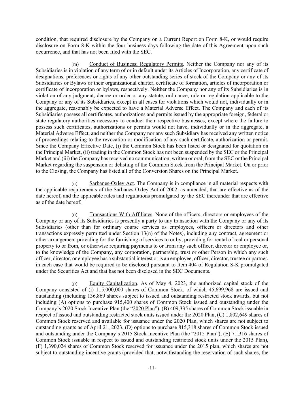 -11- condition, that required disclosure by the Company on a Current Report on Form 8-K, or would require disclosure on Form 8-K within the four business days following the date of this Agreement upon such occurrence, and that has not been filed with the SEC. (m) Conduct of Business; Regulatory Permits. Neither the Company nor any of its Subsidiaries is in violation of any term of or in default under its Articles of Incorporation, any certificate of designations, preferences or rights of any other outstanding series of stock of the Company or any of its Subsidiaries or Bylaws or their organizational charter, certificate of formation, articles of incorporation or certificate of incorporation or bylaws, respectively. Neither the Company nor any of its Subsidiaries is in violation of any judgment, decree or order or any statute, ordinance, rule or regulation applicable to the Company or any of its Subsidiaries, except in all cases for violations which would not, individually or in the aggregate, reasonably be expected to have a Material Adverse Effect. The Company and each of its Subsidiaries possess all certificates, authorizations and permits issued by the appropriate foreign, federal or state regulatory authorities necessary to conduct their respective businesses, except where the failure to possess such certificates, authorizations or permits would not have, individually or in the aggregate, a Material Adverse Effect, and neither the Company nor any such Subsidiary has received any written notice of proceedings relating to the revocation or modification of any such certificate, authorization or permit. Since the Company Effective Date, (i) the Common Stock has been listed or designated for quotation on the Principal Market, (ii) trading in the Common Stock has not been suspended by the SEC or the Principal Market and (iii) the Company has received no communication, written or oral, from the SEC or the Principal Market regarding the suspension or delisting of the Common Stock from the Principal Market. On or prior to the Closing, the Company has listed all of the Conversion Shares on the Principal Market. (n) Sarbanes-Oxley Act. The Company is in compliance in all material respects with the applicable requirements of the Sarbanes-Oxley Act of 2002, as amended, that are effective as of the date hereof, and the applicable rules and regulations promulgated by the SEC thereunder that are effective as of the date hereof. (o) Transactions With Affiliates. None of the officers, directors or employees of the Company or any of its Subsidiaries is presently a party to any transaction with the Company or any of its Subsidiaries (other than for ordinary course services as employees, officers or directors and other transactions expressly permitted under Section 13(n) of the Notes), including any contract, agreement or other arrangement providing for the furnishing of services to or by, providing for rental of real or personal property to or from, or otherwise requiring payments to or from any such officer, director or employee or, to the knowledge of the Company, any corporation, partnership, trust or other Person in which any such officer, director, or employee has a substantial interest or is an employee, officer, director, trustee or partner, in each case that would be required to be disclosed pursuant to Item 404 of Regulation S-K promulgated under the Securities Act and that has not been disclosed in the SEC Documents. (p) Equity Capitalization. As of May 4, 2023, the authorized capital stock of the Company consisted of (i) 115,000,000 shares of Common Stock, of which 45,699,968 are issued and outstanding (including 136,869 shares subject to issued and outstanding restricted stock awards, but not including (A) options to purchase 915,400 shares of Common Stock issued and outstanding under the Company’s 2020 Stock Incentive Plan (the “2020 Plan”), (B) 409,335 shares of Common Stock issuable in respect of issued and outstanding restricted stock units issued under the 2020 Plan, (C) 1,802,649 shares of Common Stock reserved and available for issuance under the 2020 Plan, which shares are not subject to outstanding grants as of April 21, 2023, (D) options to purchase 815,318 shares of Common Stock issued and outstanding under the Company’s 2015 Stock Incentive Plan (the “2015 Plan”), (E) 71,316 shares of Common Stock issuable in respect to issued and outstanding restricted stock units under the 2015 Plan), (F) 1,390,024 shares of Common Stock reserved for issuance under the 2015 plan, which shares are not subject to outstanding incentive grants (provided that, notwithstanding the reservation of such shares, the