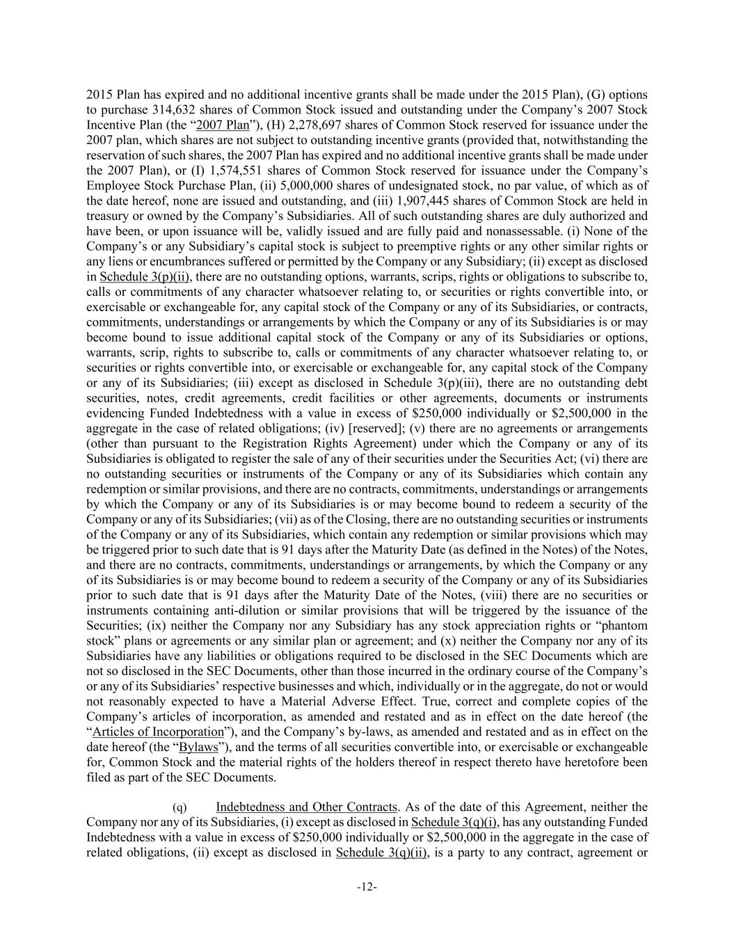 -12- 2015 Plan has expired and no additional incentive grants shall be made under the 2015 Plan), (G) options to purchase 314,632 shares of Common Stock issued and outstanding under the Company’s 2007 Stock Incentive Plan (the “2007 Plan”), (H) 2,278,697 shares of Common Stock reserved for issuance under the 2007 plan, which shares are not subject to outstanding incentive grants (provided that, notwithstanding the reservation of such shares, the 2007 Plan has expired and no additional incentive grants shall be made under the 2007 Plan), or (I) 1,574,551 shares of Common Stock reserved for issuance under the Company’s Employee Stock Purchase Plan, (ii) 5,000,000 shares of undesignated stock, no par value, of which as of the date hereof, none are issued and outstanding, and (iii) 1,907,445 shares of Common Stock are held in treasury or owned by the Company’s Subsidiaries. All of such outstanding shares are duly authorized and have been, or upon issuance will be, validly issued and are fully paid and nonassessable. (i) None of the Company’s or any Subsidiary’s capital stock is subject to preemptive rights or any other similar rights or any liens or encumbrances suffered or permitted by the Company or any Subsidiary; (ii) except as disclosed in Schedule 3(p)(ii), there are no outstanding options, warrants, scrips, rights or obligations to subscribe to, calls or commitments of any character whatsoever relating to, or securities or rights convertible into, or exercisable or exchangeable for, any capital stock of the Company or any of its Subsidiaries, or contracts, commitments, understandings or arrangements by which the Company or any of its Subsidiaries is or may become bound to issue additional capital stock of the Company or any of its Subsidiaries or options, warrants, scrip, rights to subscribe to, calls or commitments of any character whatsoever relating to, or securities or rights convertible into, or exercisable or exchangeable for, any capital stock of the Company or any of its Subsidiaries; (iii) except as disclosed in Schedule 3(p)(iii), there are no outstanding debt securities, notes, credit agreements, credit facilities or other agreements, documents or instruments evidencing Funded Indebtedness with a value in excess of $250,000 individually or $2,500,000 in the aggregate in the case of related obligations; (iv) [reserved]; (v) there are no agreements or arrangements (other than pursuant to the Registration Rights Agreement) under which the Company or any of its Subsidiaries is obligated to register the sale of any of their securities under the Securities Act; (vi) there are no outstanding securities or instruments of the Company or any of its Subsidiaries which contain any redemption or similar provisions, and there are no contracts, commitments, understandings or arrangements by which the Company or any of its Subsidiaries is or may become bound to redeem a security of the Company or any of its Subsidiaries; (vii) as of the Closing, there are no outstanding securities or instruments of the Company or any of its Subsidiaries, which contain any redemption or similar provisions which may be triggered prior to such date that is 91 days after the Maturity Date (as defined in the Notes) of the Notes, and there are no contracts, commitments, understandings or arrangements, by which the Company or any of its Subsidiaries is or may become bound to redeem a security of the Company or any of its Subsidiaries prior to such date that is 91 days after the Maturity Date of the Notes, (viii) there are no securities or instruments containing anti-dilution or similar provisions that will be triggered by the issuance of the Securities; (ix) neither the Company nor any Subsidiary has any stock appreciation rights or “phantom stock” plans or agreements or any similar plan or agreement; and (x) neither the Company nor any of its Subsidiaries have any liabilities or obligations required to be disclosed in the SEC Documents which are not so disclosed in the SEC Documents, other than those incurred in the ordinary course of the Company’s or any of its Subsidiaries’ respective businesses and which, individually or in the aggregate, do not or would not reasonably expected to have a Material Adverse Effect. True, correct and complete copies of the Company’s articles of incorporation, as amended and restated and as in effect on the date hereof (the “Articles of Incorporation”), and the Company’s by-laws, as amended and restated and as in effect on the date hereof (the “Bylaws”), and the terms of all securities convertible into, or exercisable or exchangeable for, Common Stock and the material rights of the holders thereof in respect thereto have heretofore been filed as part of the SEC Documents. (q) Indebtedness and Other Contracts. As of the date of this Agreement, neither the Company nor any of its Subsidiaries, (i) except as disclosed in Schedule 3(q)(i), has any outstanding Funded Indebtedness with a value in excess of $250,000 individually or $2,500,000 in the aggregate in the case of related obligations, (ii) except as disclosed in Schedule 3(q)(ii), is a party to any contract, agreement or
