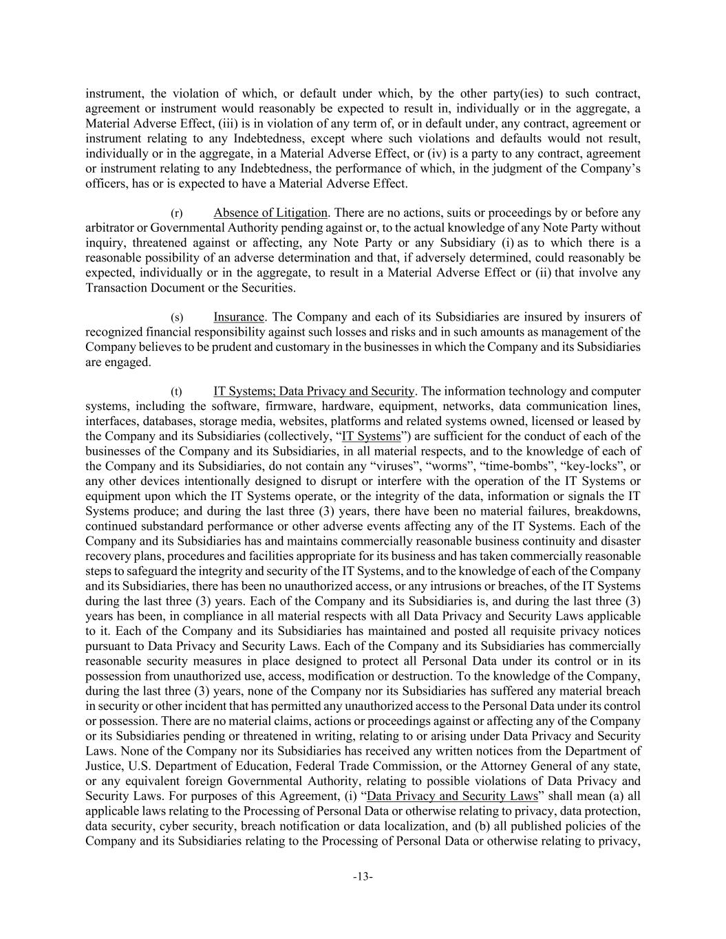 -13- instrument, the violation of which, or default under which, by the other party(ies) to such contract, agreement or instrument would reasonably be expected to result in, individually or in the aggregate, a Material Adverse Effect, (iii) is in violation of any term of, or in default under, any contract, agreement or instrument relating to any Indebtedness, except where such violations and defaults would not result, individually or in the aggregate, in a Material Adverse Effect, or (iv) is a party to any contract, agreement or instrument relating to any Indebtedness, the performance of which, in the judgment of the Company’s officers, has or is expected to have a Material Adverse Effect. (r) Absence of Litigation. There are no actions, suits or proceedings by or before any arbitrator or Governmental Authority pending against or, to the actual knowledge of any Note Party without inquiry, threatened against or affecting, any Note Party or any Subsidiary (i) as to which there is a reasonable possibility of an adverse determination and that, if adversely determined, could reasonably be expected, individually or in the aggregate, to result in a Material Adverse Effect or (ii) that involve any Transaction Document or the Securities. (s) Insurance. The Company and each of its Subsidiaries are insured by insurers of recognized financial responsibility against such losses and risks and in such amounts as management of the Company believes to be prudent and customary in the businesses in which the Company and its Subsidiaries are engaged. (t) IT Systems; Data Privacy and Security. The information technology and computer systems, including the software, firmware, hardware, equipment, networks, data communication lines, interfaces, databases, storage media, websites, platforms and related systems owned, licensed or leased by the Company and its Subsidiaries (collectively, “IT Systems”) are sufficient for the conduct of each of the businesses of the Company and its Subsidiaries, in all material respects, and to the knowledge of each of the Company and its Subsidiaries, do not contain any “viruses”, “worms”, “time-bombs”, “key-locks”, or any other devices intentionally designed to disrupt or interfere with the operation of the IT Systems or equipment upon which the IT Systems operate, or the integrity of the data, information or signals the IT Systems produce; and during the last three (3) years, there have been no material failures, breakdowns, continued substandard performance or other adverse events affecting any of the IT Systems. Each of the Company and its Subsidiaries has and maintains commercially reasonable business continuity and disaster recovery plans, procedures and facilities appropriate for its business and has taken commercially reasonable steps to safeguard the integrity and security of the IT Systems, and to the knowledge of each of the Company and its Subsidiaries, there has been no unauthorized access, or any intrusions or breaches, of the IT Systems during the last three (3) years. Each of the Company and its Subsidiaries is, and during the last three (3) years has been, in compliance in all material respects with all Data Privacy and Security Laws applicable to it. Each of the Company and its Subsidiaries has maintained and posted all requisite privacy notices pursuant to Data Privacy and Security Laws. Each of the Company and its Subsidiaries has commercially reasonable security measures in place designed to protect all Personal Data under its control or in its possession from unauthorized use, access, modification or destruction. To the knowledge of the Company, during the last three (3) years, none of the Company nor its Subsidiaries has suffered any material breach in security or other incident that has permitted any unauthorized access to the Personal Data under its control or possession. There are no material claims, actions or proceedings against or affecting any of the Company or its Subsidiaries pending or threatened in writing, relating to or arising under Data Privacy and Security Laws. None of the Company nor its Subsidiaries has received any written notices from the Department of Justice, U.S. Department of Education, Federal Trade Commission, or the Attorney General of any state, or any equivalent foreign Governmental Authority, relating to possible violations of Data Privacy and Security Laws. For purposes of this Agreement, (i) “Data Privacy and Security Laws” shall mean (a) all applicable laws relating to the Processing of Personal Data or otherwise relating to privacy, data protection, data security, cyber security, breach notification or data localization, and (b) all published policies of the Company and its Subsidiaries relating to the Processing of Personal Data or otherwise relating to privacy,