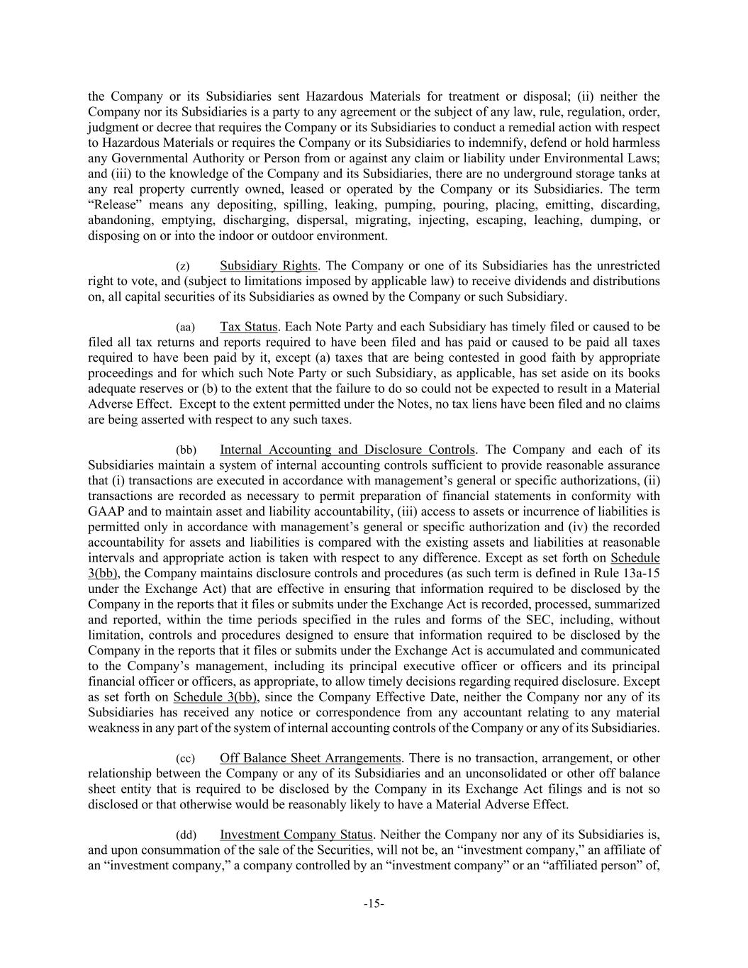 -15- the Company or its Subsidiaries sent Hazardous Materials for treatment or disposal; (ii) neither the Company nor its Subsidiaries is a party to any agreement or the subject of any law, rule, regulation, order, judgment or decree that requires the Company or its Subsidiaries to conduct a remedial action with respect to Hazardous Materials or requires the Company or its Subsidiaries to indemnify, defend or hold harmless any Governmental Authority or Person from or against any claim or liability under Environmental Laws; and (iii) to the knowledge of the Company and its Subsidiaries, there are no underground storage tanks at any real property currently owned, leased or operated by the Company or its Subsidiaries. The term “Release” means any depositing, spilling, leaking, pumping, pouring, placing, emitting, discarding, abandoning, emptying, discharging, dispersal, migrating, injecting, escaping, leaching, dumping, or disposing on or into the indoor or outdoor environment. (z) Subsidiary Rights. The Company or one of its Subsidiaries has the unrestricted right to vote, and (subject to limitations imposed by applicable law) to receive dividends and distributions on, all capital securities of its Subsidiaries as owned by the Company or such Subsidiary. (aa) Tax Status. Each Note Party and each Subsidiary has timely filed or caused to be filed all tax returns and reports required to have been filed and has paid or caused to be paid all taxes required to have been paid by it, except (a) taxes that are being contested in good faith by appropriate proceedings and for which such Note Party or such Subsidiary, as applicable, has set aside on its books adequate reserves or (b) to the extent that the failure to do so could not be expected to result in a Material Adverse Effect. Except to the extent permitted under the Notes, no tax liens have been filed and no claims are being asserted with respect to any such taxes. (bb) Internal Accounting and Disclosure Controls. The Company and each of its Subsidiaries maintain a system of internal accounting controls sufficient to provide reasonable assurance that (i) transactions are executed in accordance with management’s general or specific authorizations, (ii) transactions are recorded as necessary to permit preparation of financial statements in conformity with GAAP and to maintain asset and liability accountability, (iii) access to assets or incurrence of liabilities is permitted only in accordance with management’s general or specific authorization and (iv) the recorded accountability for assets and liabilities is compared with the existing assets and liabilities at reasonable intervals and appropriate action is taken with respect to any difference. Except as set forth on Schedule 3(bb), the Company maintains disclosure controls and procedures (as such term is defined in Rule 13a-15 under the Exchange Act) that are effective in ensuring that information required to be disclosed by the Company in the reports that it files or submits under the Exchange Act is recorded, processed, summarized and reported, within the time periods specified in the rules and forms of the SEC, including, without limitation, controls and procedures designed to ensure that information required to be disclosed by the Company in the reports that it files or submits under the Exchange Act is accumulated and communicated to the Company’s management, including its principal executive officer or officers and its principal financial officer or officers, as appropriate, to allow timely decisions regarding required disclosure. Except as set forth on Schedule 3(bb), since the Company Effective Date, neither the Company nor any of its Subsidiaries has received any notice or correspondence from any accountant relating to any material weakness in any part of the system of internal accounting controls of the Company or any of its Subsidiaries. (cc) Off Balance Sheet Arrangements. There is no transaction, arrangement, or other relationship between the Company or any of its Subsidiaries and an unconsolidated or other off balance sheet entity that is required to be disclosed by the Company in its Exchange Act filings and is not so disclosed or that otherwise would be reasonably likely to have a Material Adverse Effect. (dd) Investment Company Status. Neither the Company nor any of its Subsidiaries is, and upon consummation of the sale of the Securities, will not be, an “investment company,” an affiliate of an “investment company,” a company controlled by an “investment company” or an “affiliated person” of,