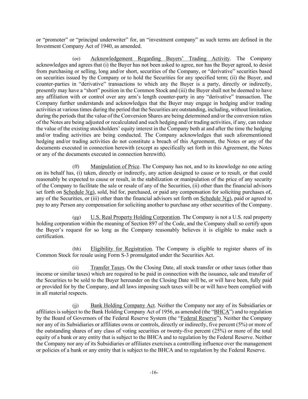 -16- or “promoter” or “principal underwriter” for, an “investment company” as such terms are defined in the Investment Company Act of 1940, as amended. (ee) Acknowledgement Regarding Buyers’ Trading Activity. The Company acknowledges and agrees that (i) the Buyer has not been asked to agree, nor has the Buyer agreed, to desist from purchasing or selling, long and/or short, securities of the Company, or “derivative” securities based on securities issued by the Company or to hold the Securities for any specified term; (ii) the Buyer, and counter-parties in “derivative” transactions to which any the Buyer is a party, directly or indirectly, presently may have a “short” position in the Common Stock and (iii) the Buyer shall not be deemed to have any affiliation with or control over any arm’s length counter-party in any “derivative” transaction. The Company further understands and acknowledges that the Buyer may engage in hedging and/or trading activities at various times during the period that the Securities are outstanding, including, without limitation, during the periods that the value of the Conversion Shares are being determined and/or the conversion ratios of the Notes are being adjusted or recalculated and such hedging and/or trading activities, if any, can reduce the value of the existing stockholders’ equity interest in the Company both at and after the time the hedging and/or trading activities are being conducted. The Company acknowledges that such aforementioned hedging and/or trading activities do not constitute a breach of this Agreement, the Notes or any of the documents executed in connection herewith (except as specifically set forth in this Agreement, the Notes or any of the documents executed in connection herewith). (ff) Manipulation of Price. The Company has not, and to its knowledge no one acting on its behalf has, (i) taken, directly or indirectly, any action designed to cause or to result, or that could reasonably be expected to cause or result, in the stabilization or manipulation of the price of any security of the Company to facilitate the sale or resale of any of the Securities, (ii) other than the financial advisors set forth on Schedule 3(g), sold, bid for, purchased, or paid any compensation for soliciting purchases of, any of the Securities, or (iii) other than the financial advisors set forth on Schedule 3(g), paid or agreed to pay to any Person any compensation for soliciting another to purchase any other securities of the Company. (gg) U.S. Real Property Holding Corporation. The Company is not a U.S. real property holding corporation within the meaning of Section 897 of the Code, and the Company shall so certify upon the Buyer’s request for so long as the Company reasonably believes it is eligible to make such a certification. (hh) Eligibility for Registration. The Company is eligible to register shares of its Common Stock for resale using Form S-3 promulgated under the Securities Act. (ii) Transfer Taxes. On the Closing Date, all stock transfer or other taxes (other than income or similar taxes) which are required to be paid in connection with the issuance, sale and transfer of the Securities to be sold to the Buyer hereunder on the Closing Date will be, or will have been, fully paid or provided for by the Company, and all laws imposing such taxes will be or will have been complied with in all material respects. (jj) Bank Holding Company Act. Neither the Company nor any of its Subsidiaries or affiliates is subject to the Bank Holding Company Act of 1956, as amended (the “BHCA”) and to regulation by the Board of Governors of the Federal Reserve System (the “Federal Reserve”). Neither the Company nor any of its Subsidiaries or affiliates owns or controls, directly or indirectly, five percent (5%) or more of the outstanding shares of any class of voting securities or twenty-five percent (25%) or more of the total equity of a bank or any entity that is subject to the BHCA and to regulation by the Federal Reserve. Neither the Company nor any of its Subsidiaries or affiliates exercises a controlling influence over the management or policies of a bank or any entity that is subject to the BHCA and to regulation by the Federal Reserve.