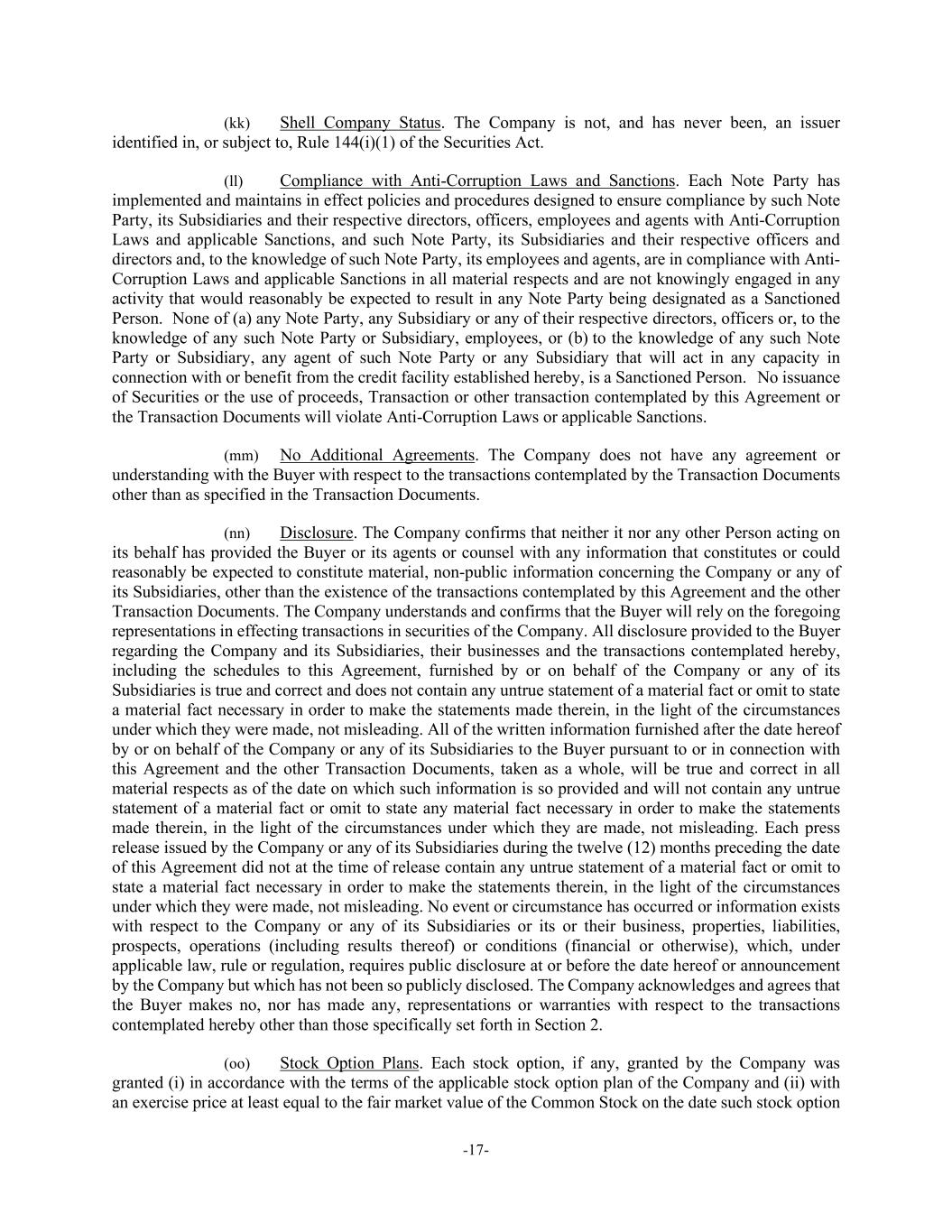 -17- (kk) Shell Company Status. The Company is not, and has never been, an issuer identified in, or subject to, Rule 144(i)(1) of the Securities Act. (ll) Compliance with Anti-Corruption Laws and Sanctions. Each Note Party has implemented and maintains in effect policies and procedures designed to ensure compliance by such Note Party, its Subsidiaries and their respective directors, officers, employees and agents with Anti-Corruption Laws and applicable Sanctions, and such Note Party, its Subsidiaries and their respective officers and directors and, to the knowledge of such Note Party, its employees and agents, are in compliance with Anti- Corruption Laws and applicable Sanctions in all material respects and are not knowingly engaged in any activity that would reasonably be expected to result in any Note Party being designated as a Sanctioned Person. None of (a) any Note Party, any Subsidiary or any of their respective directors, officers or, to the knowledge of any such Note Party or Subsidiary, employees, or (b) to the knowledge of any such Note Party or Subsidiary, any agent of such Note Party or any Subsidiary that will act in any capacity in connection with or benefit from the credit facility established hereby, is a Sanctioned Person. No issuance of Securities or the use of proceeds, Transaction or other transaction contemplated by this Agreement or the Transaction Documents will violate Anti-Corruption Laws or applicable Sanctions. (mm) No Additional Agreements. The Company does not have any agreement or understanding with the Buyer with respect to the transactions contemplated by the Transaction Documents other than as specified in the Transaction Documents. (nn) Disclosure. The Company confirms that neither it nor any other Person acting on its behalf has provided the Buyer or its agents or counsel with any information that constitutes or could reasonably be expected to constitute material, non-public information concerning the Company or any of its Subsidiaries, other than the existence of the transactions contemplated by this Agreement and the other Transaction Documents. The Company understands and confirms that the Buyer will rely on the foregoing representations in effecting transactions in securities of the Company. All disclosure provided to the Buyer regarding the Company and its Subsidiaries, their businesses and the transactions contemplated hereby, including the schedules to this Agreement, furnished by or on behalf of the Company or any of its Subsidiaries is true and correct and does not contain any untrue statement of a material fact or omit to state a material fact necessary in order to make the statements made therein, in the light of the circumstances under which they were made, not misleading. All of the written information furnished after the date hereof by or on behalf of the Company or any of its Subsidiaries to the Buyer pursuant to or in connection with this Agreement and the other Transaction Documents, taken as a whole, will be true and correct in all material respects as of the date on which such information is so provided and will not contain any untrue statement of a material fact or omit to state any material fact necessary in order to make the statements made therein, in the light of the circumstances under which they are made, not misleading. Each press release issued by the Company or any of its Subsidiaries during the twelve (12) months preceding the date of this Agreement did not at the time of release contain any untrue statement of a material fact or omit to state a material fact necessary in order to make the statements therein, in the light of the circumstances under which they were made, not misleading. No event or circumstance has occurred or information exists with respect to the Company or any of its Subsidiaries or its or their business, properties, liabilities, prospects, operations (including results thereof) or conditions (financial or otherwise), which, under applicable law, rule or regulation, requires public disclosure at or before the date hereof or announcement by the Company but which has not been so publicly disclosed. The Company acknowledges and agrees that the Buyer makes no, nor has made any, representations or warranties with respect to the transactions contemplated hereby other than those specifically set forth in Section 2. (oo) Stock Option Plans. Each stock option, if any, granted by the Company was granted (i) in accordance with the terms of the applicable stock option plan of the Company and (ii) with an exercise price at least equal to the fair market value of the Common Stock on the date such stock option