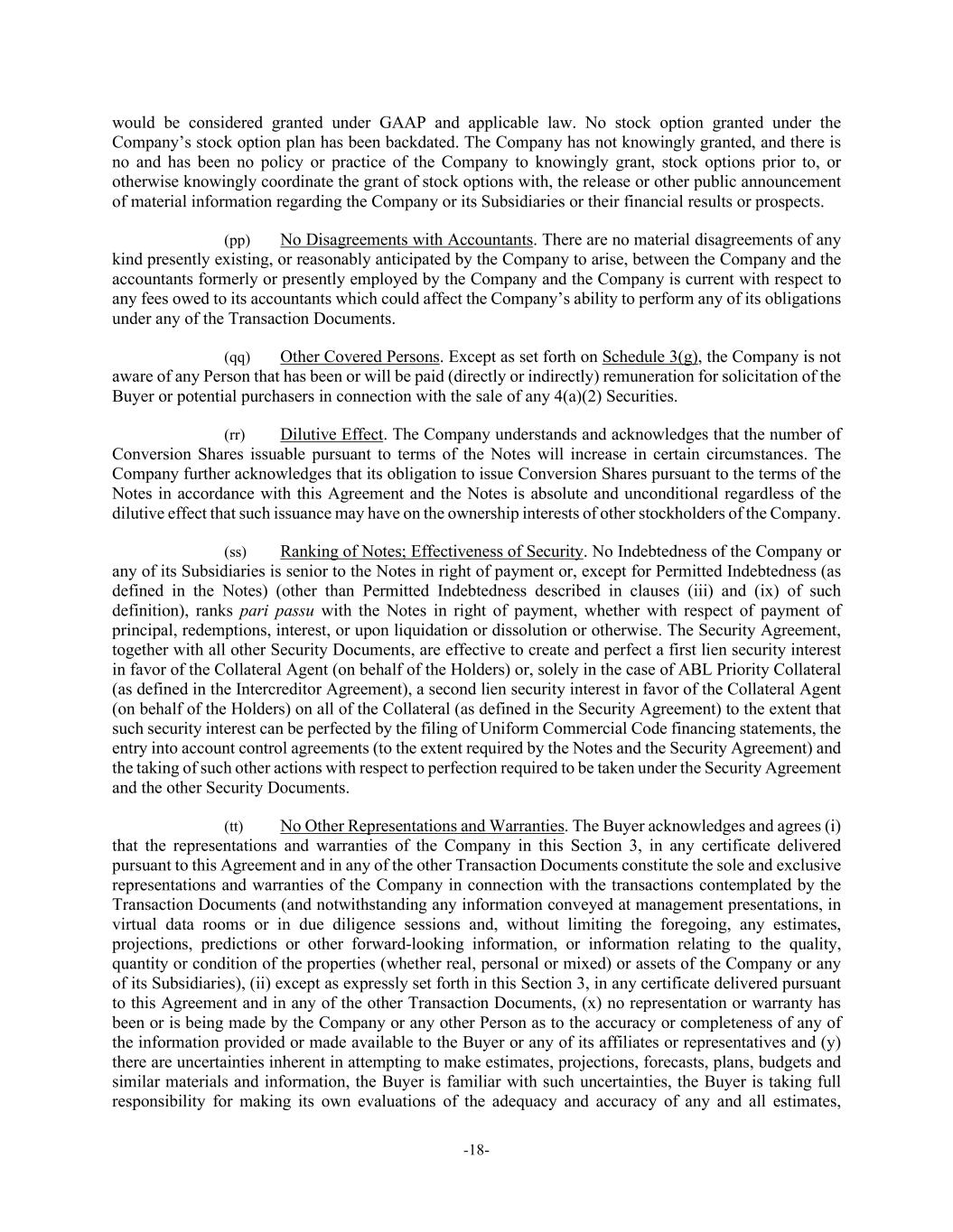 -18- would be considered granted under GAAP and applicable law. No stock option granted under the Company’s stock option plan has been backdated. The Company has not knowingly granted, and there is no and has been no policy or practice of the Company to knowingly grant, stock options prior to, or otherwise knowingly coordinate the grant of stock options with, the release or other public announcement of material information regarding the Company or its Subsidiaries or their financial results or prospects. (pp) No Disagreements with Accountants. There are no material disagreements of any kind presently existing, or reasonably anticipated by the Company to arise, between the Company and the accountants formerly or presently employed by the Company and the Company is current with respect to any fees owed to its accountants which could affect the Company’s ability to perform any of its obligations under any of the Transaction Documents. (qq) Other Covered Persons. Except as set forth on Schedule 3(g), the Company is not aware of any Person that has been or will be paid (directly or indirectly) remuneration for solicitation of the Buyer or potential purchasers in connection with the sale of any 4(a)(2) Securities. (rr) Dilutive Effect. The Company understands and acknowledges that the number of Conversion Shares issuable pursuant to terms of the Notes will increase in certain circumstances. The Company further acknowledges that its obligation to issue Conversion Shares pursuant to the terms of the Notes in accordance with this Agreement and the Notes is absolute and unconditional regardless of the dilutive effect that such issuance may have on the ownership interests of other stockholders of the Company. (ss) Ranking of Notes; Effectiveness of Security. No Indebtedness of the Company or any of its Subsidiaries is senior to the Notes in right of payment or, except for Permitted Indebtedness (as defined in the Notes) (other than Permitted Indebtedness described in clauses (iii) and (ix) of such definition), ranks pari passu with the Notes in right of payment, whether with respect of payment of principal, redemptions, interest, or upon liquidation or dissolution or otherwise. The Security Agreement, together with all other Security Documents, are effective to create and perfect a first lien security interest in favor of the Collateral Agent (on behalf of the Holders) or, solely in the case of ABL Priority Collateral (as defined in the Intercreditor Agreement), a second lien security interest in favor of the Collateral Agent (on behalf of the Holders) on all of the Collateral (as defined in the Security Agreement) to the extent that such security interest can be perfected by the filing of Uniform Commercial Code financing statements, the entry into account control agreements (to the extent required by the Notes and the Security Agreement) and the taking of such other actions with respect to perfection required to be taken under the Security Agreement and the other Security Documents. (tt) No Other Representations and Warranties. The Buyer acknowledges and agrees (i) that the representations and warranties of the Company in this Section 3, in any certificate delivered pursuant to this Agreement and in any of the other Transaction Documents constitute the sole and exclusive representations and warranties of the Company in connection with the transactions contemplated by the Transaction Documents (and notwithstanding any information conveyed at management presentations, in virtual data rooms or in due diligence sessions and, without limiting the foregoing, any estimates, projections, predictions or other forward-looking information, or information relating to the quality, quantity or condition of the properties (whether real, personal or mixed) or assets of the Company or any of its Subsidiaries), (ii) except as expressly set forth in this Section 3, in any certificate delivered pursuant to this Agreement and in any of the other Transaction Documents, (x) no representation or warranty has been or is being made by the Company or any other Person as to the accuracy or completeness of any of the information provided or made available to the Buyer or any of its affiliates or representatives and (y) there are uncertainties inherent in attempting to make estimates, projections, forecasts, plans, budgets and similar materials and information, the Buyer is familiar with such uncertainties, the Buyer is taking full responsibility for making its own evaluations of the adequacy and accuracy of any and all estimates,