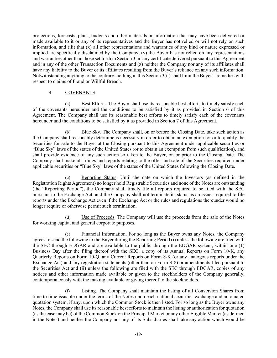 -19- projections, forecasts, plans, budgets and other materials or information that may have been delivered or made available to it or any of its representatives and the Buyer has not relied or will not rely on such information, and (iii) that (x) all other representations and warranties of any kind or nature expressed or implied are specifically disclaimed by the Company, (y) the Buyer has not relied on any representations and warranties other than those set forth in Section 3, in any certificate delivered pursuant to this Agreement and in any of the other Transaction Documents and (z) neither the Company nor any of its affiliates shall have any liability to the Buyer or its affiliates resulting from the Buyer’s reliance on any such information. Notwithstanding anything to the contrary, nothing in this Section 3(tt) shall limit the Buyer’s remedies with respect to claims of Fraud or Willful Breach. 4. COVENANTS. (a) Best Efforts. The Buyer shall use its reasonable best efforts to timely satisfy each of the covenants hereunder and the conditions to be satisfied by it as provided in Section 6 of this Agreement. The Company shall use its reasonable best efforts to timely satisfy each of the covenants hereunder and the conditions to be satisfied by it as provided in Section 7 of this Agreement. (b) Blue Sky. The Company shall, on or before the Closing Date, take such action as the Company shall reasonably determine is necessary in order to obtain an exemption for or to qualify the Securities for sale to the Buyer at the Closing pursuant to this Agreement under applicable securities or “Blue Sky” laws of the states of the United States (or to obtain an exemption from such qualification), and shall provide evidence of any such action so taken to the Buyer, on or prior to the Closing Date. The Company shall make all filings and reports relating to the offer and sale of the Securities required under applicable securities or “Blue Sky” laws of the states of the United States following the Closing Date. (c) Reporting Status. Until the date on which the Investors (as defined in the Registration Rights Agreement) no longer hold Registrable Securities and none of the Notes are outstanding (the “Reporting Period”), the Company shall timely file all reports required to be filed with the SEC pursuant to the Exchange Act, and the Company shall not terminate its status as an issuer required to file reports under the Exchange Act even if the Exchange Act or the rules and regulations thereunder would no longer require or otherwise permit such termination. (d) Use of Proceeds. The Company will use the proceeds from the sale of the Notes for working capital and general corporate purposes. (e) Financial Information. For so long as the Buyer owns any Notes, the Company agrees to send the following to the Buyer during the Reporting Period (i) unless the following are filed with the SEC through EDGAR and are available to the public through the EDGAR system, within one (1) Business Day after the filing thereof with the SEC, a copy of its Annual Reports on Form 10-K, any Quarterly Reports on Form 10-Q, any Current Reports on Form 8-K (or any analogous reports under the Exchange Act) and any registration statements (other than on Form S-8) or amendments filed pursuant to the Securities Act and (ii) unless the following are filed with the SEC through EDGAR, copies of any notices and other information made available or given to the stockholders of the Company generally, contemporaneously with the making available or giving thereof to the stockholders. (f) Listing. The Company shall maintain the listing of all Conversion Shares from time to time issuable under the terms of the Notes upon each national securities exchange and automated quotation system, if any, upon which the Common Stock is then listed. For so long as the Buyer owns any Notes, the Company shall use its reasonable best efforts to maintain the listing or authorization for quotation (as the case may be) of the Common Stock on the Principal Market or any other Eligible Market (as defined in the Notes) and neither the Company nor any of its Subsidiaries shall take any action which would be
