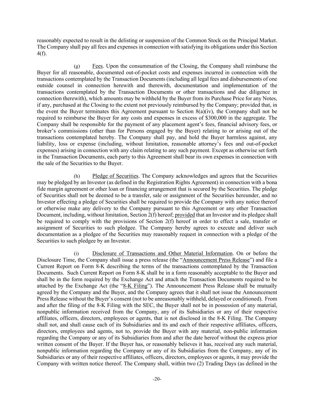 -20- reasonably expected to result in the delisting or suspension of the Common Stock on the Principal Market. The Company shall pay all fees and expenses in connection with satisfying its obligations under this Section 4(f). (g) Fees. Upon the consummation of the Closing, the Company shall reimburse the Buyer for all reasonable, documented out-of-pocket costs and expenses incurred in connection with the transactions contemplated by the Transaction Documents (including all legal fees and disbursements of one outside counsel in connection herewith and therewith, documentation and implementation of the transactions contemplated by the Transaction Documents or other transactions and due diligence in connection therewith), which amounts may be withheld by the Buyer from its Purchase Price for any Notes, if any, purchased at the Closing to the extent not previously reimbursed by the Company; provided that, in the event the Buyer terminates this Agreement pursuant to Section 8(a)(iv), the Company shall not be required to reimburse the Buyer for any costs and expenses in excess of $300,000 in the aggregate. The Company shall be responsible for the payment of any placement agent’s fees, financial advisory fees, or broker’s commissions (other than for Persons engaged by the Buyer) relating to or arising out of the transactions contemplated hereby. The Company shall pay, and hold the Buyer harmless against, any liability, loss or expense (including, without limitation, reasonable attorney’s fees and out-of-pocket expenses) arising in connection with any claim relating to any such payment. Except as otherwise set forth in the Transaction Documents, each party to this Agreement shall bear its own expenses in connection with the sale of the Securities to the Buyer. (h) Pledge of Securities. The Company acknowledges and agrees that the Securities may be pledged by an Investor (as defined in the Registration Rights Agreement) in connection with a bona fide margin agreement or other loan or financing arrangement that is secured by the Securities. The pledge of Securities shall not be deemed to be a transfer, sale or assignment of the Securities hereunder, and no Investor effecting a pledge of Securities shall be required to provide the Company with any notice thereof or otherwise make any delivery to the Company pursuant to this Agreement or any other Transaction Document, including, without limitation, Section 2(f) hereof; provided that an Investor and its pledgee shall be required to comply with the provisions of Section 2(f) hereof in order to effect a sale, transfer or assignment of Securities to such pledgee. The Company hereby agrees to execute and deliver such documentation as a pledgee of the Securities may reasonably request in connection with a pledge of the Securities to such pledgee by an Investor. (i) Disclosure of Transactions and Other Material Information. On or before the Disclosure Time, the Company shall issue a press release (the “Announcement Press Release”) and file a Current Report on Form 8-K describing the terms of the transactions contemplated by the Transaction Documents. Such Current Report on Form 8-K shall be in a form reasonably acceptable to the Buyer and shall be in the form required by the Exchange Act and attach the Transaction Documents required to be attached by the Exchange Act (the “8-K Filing”). The Announcement Press Release shall be mutually agreed by the Company and the Buyer, and the Company agrees that it shall not issue the Announcement Press Release without the Buyer’s consent (not to be unreasonably withheld, delayed or conditioned). From and after the filing of the 8-K Filing with the SEC, the Buyer shall not be in possession of any material, nonpublic information received from the Company, any of its Subsidiaries or any of their respective affiliates, officers, directors, employees or agents, that is not disclosed in the 8-K Filing. The Company shall not, and shall cause each of its Subsidiaries and its and each of their respective affiliates, officers, directors, employees and agents, not to, provide the Buyer with any material, non-public information regarding the Company or any of its Subsidiaries from and after the date hereof without the express prior written consent of the Buyer. If the Buyer has, or reasonably believes it has, received any such material, nonpublic information regarding the Company or any of its Subsidiaries from the Company, any of its Subsidiaries or any of their respective affiliates, officers, directors, employees or agents, it may provide the Company with written notice thereof. The Company shall, within two (2) Trading Days (as defined in the