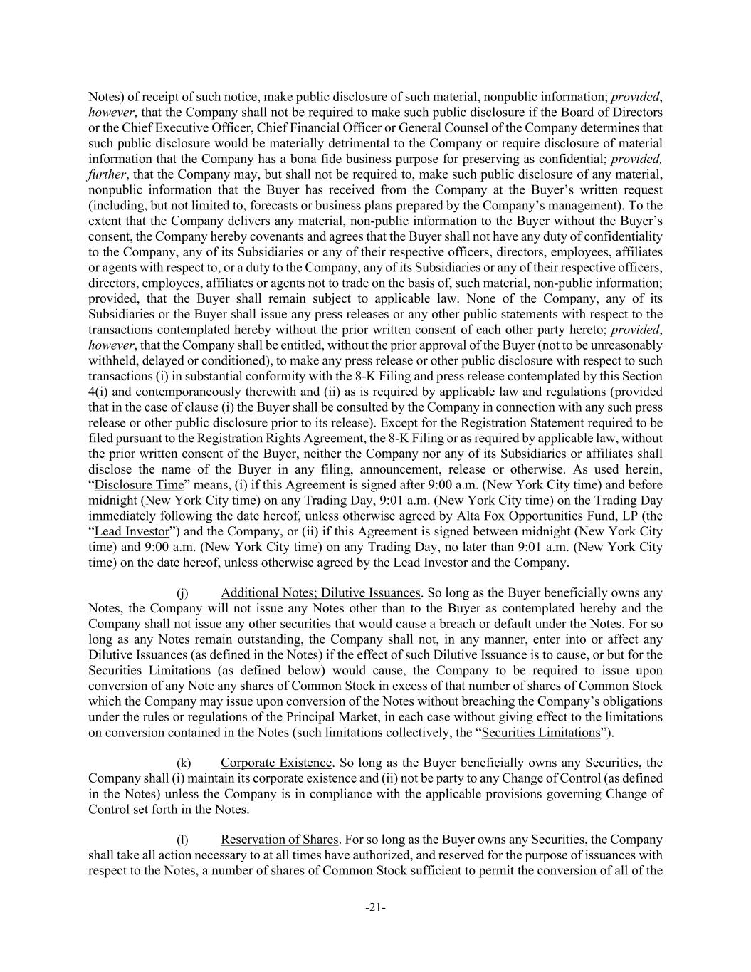 -21- Notes) of receipt of such notice, make public disclosure of such material, nonpublic information; provided, however, that the Company shall not be required to make such public disclosure if the Board of Directors or the Chief Executive Officer, Chief Financial Officer or General Counsel of the Company determines that such public disclosure would be materially detrimental to the Company or require disclosure of material information that the Company has a bona fide business purpose for preserving as confidential; provided, further, that the Company may, but shall not be required to, make such public disclosure of any material, nonpublic information that the Buyer has received from the Company at the Buyer’s written request (including, but not limited to, forecasts or business plans prepared by the Company’s management). To the extent that the Company delivers any material, non-public information to the Buyer without the Buyer’s consent, the Company hereby covenants and agrees that the Buyer shall not have any duty of confidentiality to the Company, any of its Subsidiaries or any of their respective officers, directors, employees, affiliates or agents with respect to, or a duty to the Company, any of its Subsidiaries or any of their respective officers, directors, employees, affiliates or agents not to trade on the basis of, such material, non-public information; provided, that the Buyer shall remain subject to applicable law. None of the Company, any of its Subsidiaries or the Buyer shall issue any press releases or any other public statements with respect to the transactions contemplated hereby without the prior written consent of each other party hereto; provided, however, that the Company shall be entitled, without the prior approval of the Buyer (not to be unreasonably withheld, delayed or conditioned), to make any press release or other public disclosure with respect to such transactions (i) in substantial conformity with the 8-K Filing and press release contemplated by this Section 4(i) and contemporaneously therewith and (ii) as is required by applicable law and regulations (provided that in the case of clause (i) the Buyer shall be consulted by the Company in connection with any such press release or other public disclosure prior to its release). Except for the Registration Statement required to be filed pursuant to the Registration Rights Agreement, the 8-K Filing or as required by applicable law, without the prior written consent of the Buyer, neither the Company nor any of its Subsidiaries or affiliates shall disclose the name of the Buyer in any filing, announcement, release or otherwise. As used herein, “Disclosure Time” means, (i) if this Agreement is signed after 9:00 a.m. (New York City time) and before midnight (New York City time) on any Trading Day, 9:01 a.m. (New York City time) on the Trading Day immediately following the date hereof, unless otherwise agreed by Alta Fox Opportunities Fund, LP (the “Lead Investor”) and the Company, or (ii) if this Agreement is signed between midnight (New York City time) and 9:00 a.m. (New York City time) on any Trading Day, no later than 9:01 a.m. (New York City time) on the date hereof, unless otherwise agreed by the Lead Investor and the Company. (j) Additional Notes; Dilutive Issuances. So long as the Buyer beneficially owns any Notes, the Company will not issue any Notes other than to the Buyer as contemplated hereby and the Company shall not issue any other securities that would cause a breach or default under the Notes. For so long as any Notes remain outstanding, the Company shall not, in any manner, enter into or affect any Dilutive Issuances (as defined in the Notes) if the effect of such Dilutive Issuance is to cause, or but for the Securities Limitations (as defined below) would cause, the Company to be required to issue upon conversion of any Note any shares of Common Stock in excess of that number of shares of Common Stock which the Company may issue upon conversion of the Notes without breaching the Company’s obligations under the rules or regulations of the Principal Market, in each case without giving effect to the limitations on conversion contained in the Notes (such limitations collectively, the “Securities Limitations”). (k) Corporate Existence. So long as the Buyer beneficially owns any Securities, the Company shall (i) maintain its corporate existence and (ii) not be party to any Change of Control (as defined in the Notes) unless the Company is in compliance with the applicable provisions governing Change of Control set forth in the Notes. (l) Reservation of Shares. For so long as the Buyer owns any Securities, the Company shall take all action necessary to at all times have authorized, and reserved for the purpose of issuances with respect to the Notes, a number of shares of Common Stock sufficient to permit the conversion of all of the