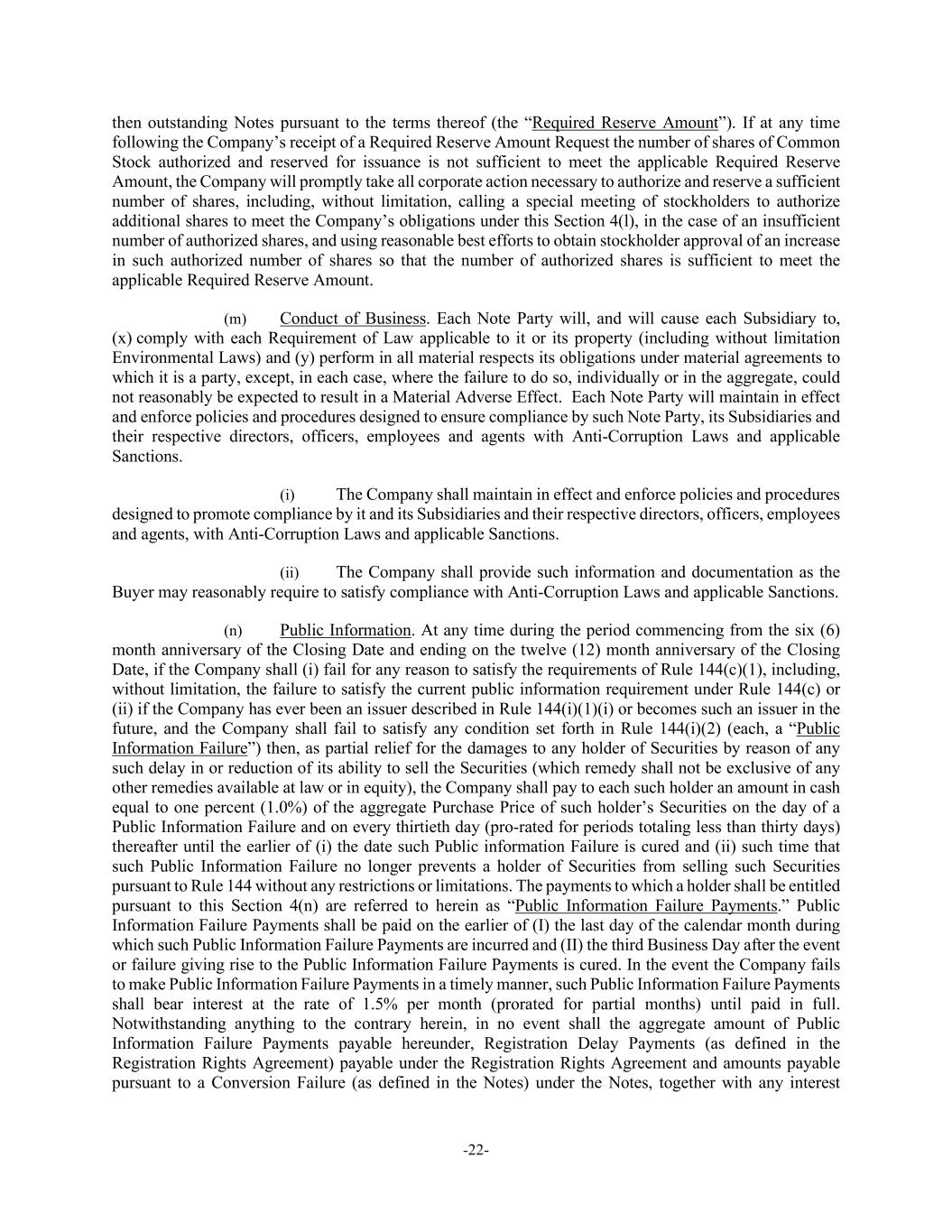 -22- then outstanding Notes pursuant to the terms thereof (the “Required Reserve Amount”). If at any time following the Company’s receipt of a Required Reserve Amount Request the number of shares of Common Stock authorized and reserved for issuance is not sufficient to meet the applicable Required Reserve Amount, the Company will promptly take all corporate action necessary to authorize and reserve a sufficient number of shares, including, without limitation, calling a special meeting of stockholders to authorize additional shares to meet the Company’s obligations under this Section 4(l), in the case of an insufficient number of authorized shares, and using reasonable best efforts to obtain stockholder approval of an increase in such authorized number of shares so that the number of authorized shares is sufficient to meet the applicable Required Reserve Amount. (m) Conduct of Business. Each Note Party will, and will cause each Subsidiary to, (x) comply with each Requirement of Law applicable to it or its property (including without limitation Environmental Laws) and (y) perform in all material respects its obligations under material agreements to which it is a party, except, in each case, where the failure to do so, individually or in the aggregate, could not reasonably be expected to result in a Material Adverse Effect. Each Note Party will maintain in effect and enforce policies and procedures designed to ensure compliance by such Note Party, its Subsidiaries and their respective directors, officers, employees and agents with Anti-Corruption Laws and applicable Sanctions. (i) The Company shall maintain in effect and enforce policies and procedures designed to promote compliance by it and its Subsidiaries and their respective directors, officers, employees and agents, with Anti-Corruption Laws and applicable Sanctions. (ii) The Company shall provide such information and documentation as the Buyer may reasonably require to satisfy compliance with Anti-Corruption Laws and applicable Sanctions. (n) Public Information. At any time during the period commencing from the six (6) month anniversary of the Closing Date and ending on the twelve (12) month anniversary of the Closing Date, if the Company shall (i) fail for any reason to satisfy the requirements of Rule 144(c)(1), including, without limitation, the failure to satisfy the current public information requirement under Rule 144(c) or (ii) if the Company has ever been an issuer described in Rule 144(i)(1)(i) or becomes such an issuer in the future, and the Company shall fail to satisfy any condition set forth in Rule 144(i)(2) (each, a “Public Information Failure”) then, as partial relief for the damages to any holder of Securities by reason of any such delay in or reduction of its ability to sell the Securities (which remedy shall not be exclusive of any other remedies available at law or in equity), the Company shall pay to each such holder an amount in cash equal to one percent (1.0%) of the aggregate Purchase Price of such holder’s Securities on the day of a Public Information Failure and on every thirtieth day (pro-rated for periods totaling less than thirty days) thereafter until the earlier of (i) the date such Public information Failure is cured and (ii) such time that such Public Information Failure no longer prevents a holder of Securities from selling such Securities pursuant to Rule 144 without any restrictions or limitations. The payments to which a holder shall be entitled pursuant to this Section 4(n) are referred to herein as “Public Information Failure Payments.” Public Information Failure Payments shall be paid on the earlier of (I) the last day of the calendar month during which such Public Information Failure Payments are incurred and (II) the third Business Day after the event or failure giving rise to the Public Information Failure Payments is cured. In the event the Company fails to make Public Information Failure Payments in a timely manner, such Public Information Failure Payments shall bear interest at the rate of 1.5% per month (prorated for partial months) until paid in full. Notwithstanding anything to the contrary herein, in no event shall the aggregate amount of Public Information Failure Payments payable hereunder, Registration Delay Payments (as defined in the Registration Rights Agreement) payable under the Registration Rights Agreement and amounts payable pursuant to a Conversion Failure (as defined in the Notes) under the Notes, together with any interest