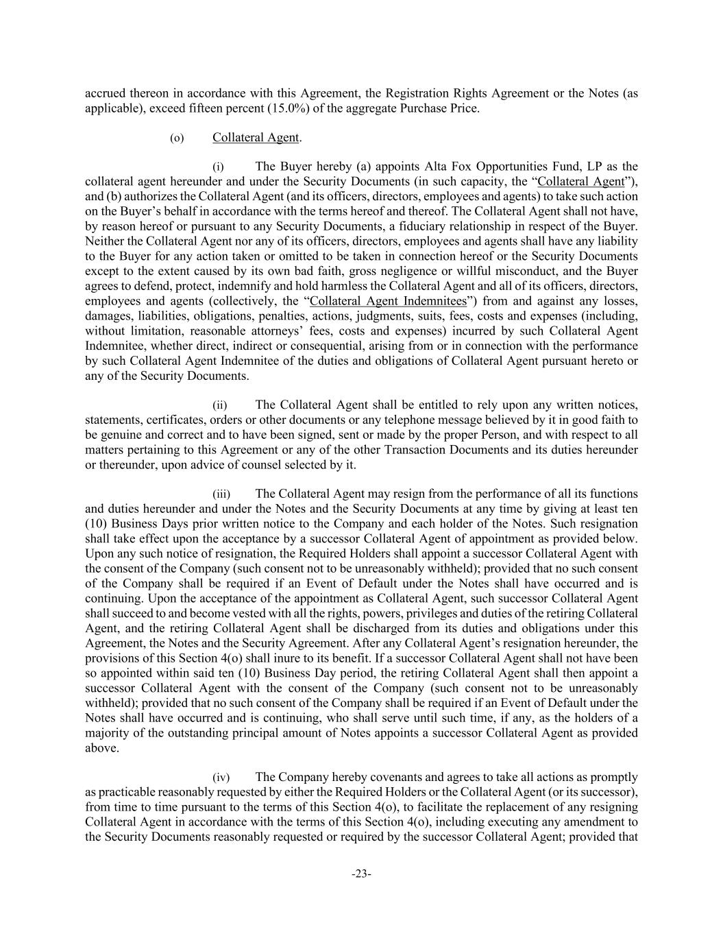 -23- accrued thereon in accordance with this Agreement, the Registration Rights Agreement or the Notes (as applicable), exceed fifteen percent (15.0%) of the aggregate Purchase Price. (o) Collateral Agent. (i) The Buyer hereby (a) appoints Alta Fox Opportunities Fund, LP as the collateral agent hereunder and under the Security Documents (in such capacity, the “Collateral Agent”), and (b) authorizes the Collateral Agent (and its officers, directors, employees and agents) to take such action on the Buyer’s behalf in accordance with the terms hereof and thereof. The Collateral Agent shall not have, by reason hereof or pursuant to any Security Documents, a fiduciary relationship in respect of the Buyer. Neither the Collateral Agent nor any of its officers, directors, employees and agents shall have any liability to the Buyer for any action taken or omitted to be taken in connection hereof or the Security Documents except to the extent caused by its own bad faith, gross negligence or willful misconduct, and the Buyer agrees to defend, protect, indemnify and hold harmless the Collateral Agent and all of its officers, directors, employees and agents (collectively, the “Collateral Agent Indemnitees”) from and against any losses, damages, liabilities, obligations, penalties, actions, judgments, suits, fees, costs and expenses (including, without limitation, reasonable attorneys’ fees, costs and expenses) incurred by such Collateral Agent Indemnitee, whether direct, indirect or consequential, arising from or in connection with the performance by such Collateral Agent Indemnitee of the duties and obligations of Collateral Agent pursuant hereto or any of the Security Documents. (ii) The Collateral Agent shall be entitled to rely upon any written notices, statements, certificates, orders or other documents or any telephone message believed by it in good faith to be genuine and correct and to have been signed, sent or made by the proper Person, and with respect to all matters pertaining to this Agreement or any of the other Transaction Documents and its duties hereunder or thereunder, upon advice of counsel selected by it. (iii) The Collateral Agent may resign from the performance of all its functions and duties hereunder and under the Notes and the Security Documents at any time by giving at least ten (10) Business Days prior written notice to the Company and each holder of the Notes. Such resignation shall take effect upon the acceptance by a successor Collateral Agent of appointment as provided below. Upon any such notice of resignation, the Required Holders shall appoint a successor Collateral Agent with the consent of the Company (such consent not to be unreasonably withheld); provided that no such consent of the Company shall be required if an Event of Default under the Notes shall have occurred and is continuing. Upon the acceptance of the appointment as Collateral Agent, such successor Collateral Agent shall succeed to and become vested with all the rights, powers, privileges and duties of the retiring Collateral Agent, and the retiring Collateral Agent shall be discharged from its duties and obligations under this Agreement, the Notes and the Security Agreement. After any Collateral Agent’s resignation hereunder, the provisions of this Section 4(o) shall inure to its benefit. If a successor Collateral Agent shall not have been so appointed within said ten (10) Business Day period, the retiring Collateral Agent shall then appoint a successor Collateral Agent with the consent of the Company (such consent not to be unreasonably withheld); provided that no such consent of the Company shall be required if an Event of Default under the Notes shall have occurred and is continuing, who shall serve until such time, if any, as the holders of a majority of the outstanding principal amount of Notes appoints a successor Collateral Agent as provided above. (iv) The Company hereby covenants and agrees to take all actions as promptly as practicable reasonably requested by either the Required Holders or the Collateral Agent (or its successor), from time to time pursuant to the terms of this Section 4(o), to facilitate the replacement of any resigning Collateral Agent in accordance with the terms of this Section 4(o), including executing any amendment to the Security Documents reasonably requested or required by the successor Collateral Agent; provided that