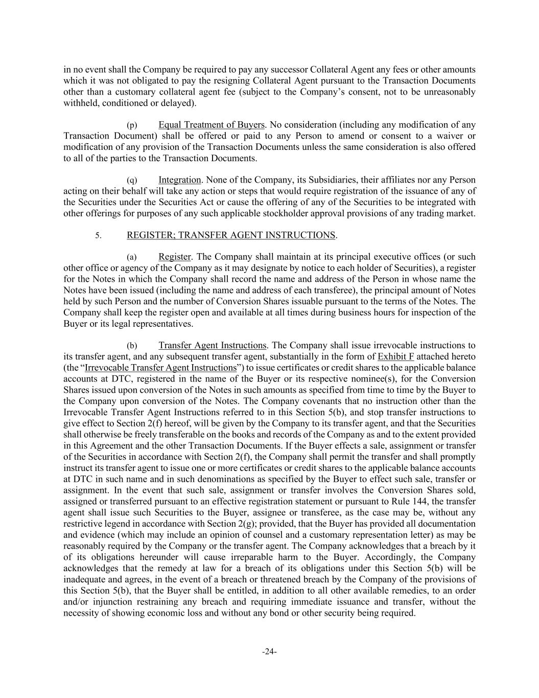 -24- in no event shall the Company be required to pay any successor Collateral Agent any fees or other amounts which it was not obligated to pay the resigning Collateral Agent pursuant to the Transaction Documents other than a customary collateral agent fee (subject to the Company’s consent, not to be unreasonably withheld, conditioned or delayed). (p) Equal Treatment of Buyers. No consideration (including any modification of any Transaction Document) shall be offered or paid to any Person to amend or consent to a waiver or modification of any provision of the Transaction Documents unless the same consideration is also offered to all of the parties to the Transaction Documents. (q) Integration. None of the Company, its Subsidiaries, their affiliates nor any Person acting on their behalf will take any action or steps that would require registration of the issuance of any of the Securities under the Securities Act or cause the offering of any of the Securities to be integrated with other offerings for purposes of any such applicable stockholder approval provisions of any trading market. 5. REGISTER; TRANSFER AGENT INSTRUCTIONS. (a) Register. The Company shall maintain at its principal executive offices (or such other office or agency of the Company as it may designate by notice to each holder of Securities), a register for the Notes in which the Company shall record the name and address of the Person in whose name the Notes have been issued (including the name and address of each transferee), the principal amount of Notes held by such Person and the number of Conversion Shares issuable pursuant to the terms of the Notes. The Company shall keep the register open and available at all times during business hours for inspection of the Buyer or its legal representatives. (b) Transfer Agent Instructions. The Company shall issue irrevocable instructions to its transfer agent, and any subsequent transfer agent, substantially in the form of Exhibit F attached hereto (the “Irrevocable Transfer Agent Instructions”) to issue certificates or credit shares to the applicable balance accounts at DTC, registered in the name of the Buyer or its respective nominee(s), for the Conversion Shares issued upon conversion of the Notes in such amounts as specified from time to time by the Buyer to the Company upon conversion of the Notes. The Company covenants that no instruction other than the Irrevocable Transfer Agent Instructions referred to in this Section 5(b), and stop transfer instructions to give effect to Section 2(f) hereof, will be given by the Company to its transfer agent, and that the Securities shall otherwise be freely transferable on the books and records of the Company as and to the extent provided in this Agreement and the other Transaction Documents. If the Buyer effects a sale, assignment or transfer of the Securities in accordance with Section 2(f), the Company shall permit the transfer and shall promptly instruct its transfer agent to issue one or more certificates or credit shares to the applicable balance accounts at DTC in such name and in such denominations as specified by the Buyer to effect such sale, transfer or assignment. In the event that such sale, assignment or transfer involves the Conversion Shares sold, assigned or transferred pursuant to an effective registration statement or pursuant to Rule 144, the transfer agent shall issue such Securities to the Buyer, assignee or transferee, as the case may be, without any restrictive legend in accordance with Section 2(g); provided, that the Buyer has provided all documentation and evidence (which may include an opinion of counsel and a customary representation letter) as may be reasonably required by the Company or the transfer agent. The Company acknowledges that a breach by it of its obligations hereunder will cause irreparable harm to the Buyer. Accordingly, the Company acknowledges that the remedy at law for a breach of its obligations under this Section 5(b) will be inadequate and agrees, in the event of a breach or threatened breach by the Company of the provisions of this Section 5(b), that the Buyer shall be entitled, in addition to all other available remedies, to an order and/or injunction restraining any breach and requiring immediate issuance and transfer, without the necessity of showing economic loss and without any bond or other security being required.