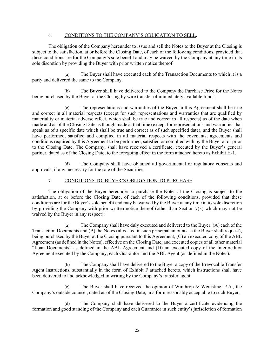 -25- 6. CONDITIONS TO THE COMPANY’S OBLIGATION TO SELL. The obligation of the Company hereunder to issue and sell the Notes to the Buyer at the Closing is subject to the satisfaction, at or before the Closing Date, of each of the following conditions, provided that these conditions are for the Company’s sole benefit and may be waived by the Company at any time in its sole discretion by providing the Buyer with prior written notice thereof: (a) The Buyer shall have executed each of the Transaction Documents to which it is a party and delivered the same to the Company. (b) The Buyer shall have delivered to the Company the Purchase Price for the Notes being purchased by the Buyer at the Closing by wire transfer of immediately available funds. (c) The representations and warranties of the Buyer in this Agreement shall be true and correct in all material respects (except for such representations and warranties that are qualified by materiality or material adverse effect, which shall be true and correct in all respects) as of the date when made and as of the Closing Date as though made at that time (except for representations and warranties that speak as of a specific date which shall be true and correct as of such specified date), and the Buyer shall have performed, satisfied and complied in all material respects with the covenants, agreements and conditions required by this Agreement to be performed, satisfied or complied with by the Buyer at or prior to the Closing Date. The Company, shall have received a certificate, executed by the Buyer’s general partner, dated as of the Closing Date, to the foregoing effect in the form attached hereto as Exhibit H-1. (d) The Company shall have obtained all governmental or regulatory consents and approvals, if any, necessary for the sale of the Securities. 7. CONDITIONS TO BUYER’S OBLIGATION TO PURCHASE. The obligation of the Buyer hereunder to purchase the Notes at the Closing is subject to the satisfaction, at or before the Closing Date, of each of the following conditions, provided that these conditions are for the Buyer’s sole benefit and may be waived by the Buyer at any time in its sole discretion by providing the Company with prior written notice thereof (other than Section 7(k) which may not be waived by the Buyer in any respect): (a) The Company shall have duly executed and delivered to the Buyer: (A) each of the Transaction Documents and (B) the Notes (allocated in such principal amounts as the Buyer shall request), being purchased by the Buyer at the Closing pursuant to this Agreement, (C) an executed copy of the ABL Agreement (as defined in the Notes), effective on the Closing Date, and executed copies of all other material “Loan Documents” as defined in the ABL Agreement and (D) an executed copy of the Intercreditor Agreement executed by the Company, each Guarantor and the ABL Agent (as defined in the Notes). (b) The Company shall have delivered to the Buyer a copy of the Irrevocable Transfer Agent Instructions, substantially in the form of Exhibit F attached hereto, which instructions shall have been delivered to and acknowledged in writing by the Company’s transfer agent. (c) The Buyer shall have received the opinion of Winthrop & Weinstine, P.A., the Company’s outside counsel, dated as of the Closing Date, in a form reasonably acceptable to such Buyer. (d) The Company shall have delivered to the Buyer a certificate evidencing the formation and good standing of the Company and each Guarantor in such entity’s jurisdiction of formation