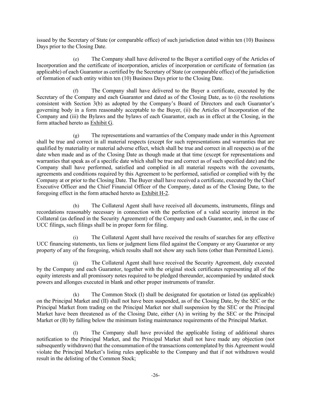 -26- issued by the Secretary of State (or comparable office) of such jurisdiction dated within ten (10) Business Days prior to the Closing Date. (e) The Company shall have delivered to the Buyer a certified copy of the Articles of Incorporation and the certificate of incorporation, articles of incorporation or certificate of formation (as applicable) of each Guarantor as certified by the Secretary of State (or comparable office) of the jurisdiction of formation of such entity within ten (10) Business Days prior to the Closing Date. (f) The Company shall have delivered to the Buyer a certificate, executed by the Secretary of the Company and each Guarantor and dated as of the Closing Date, as to (i) the resolutions consistent with Section 3(b) as adopted by the Company’s Board of Directors and each Guarantor’s governing body in a form reasonably acceptable to the Buyer, (ii) the Articles of Incorporation of the Company and (iii) the Bylaws and the bylaws of each Guarantor, each as in effect at the Closing, in the form attached hereto as Exhibit G. (g) The representations and warranties of the Company made under in this Agreement shall be true and correct in all material respects (except for such representations and warranties that are qualified by materiality or material adverse effect, which shall be true and correct in all respects) as of the date when made and as of the Closing Date as though made at that time (except for representations and warranties that speak as of a specific date which shall be true and correct as of such specified date) and the Company shall have performed, satisfied and complied in all material respects with the covenants, agreements and conditions required by this Agreement to be performed, satisfied or complied with by the Company at or prior to the Closing Date. The Buyer shall have received a certificate, executed by the Chief Executive Officer and the Chief Financial Officer of the Company, dated as of the Closing Date, to the foregoing effect in the form attached hereto as Exhibit H-2. (h) The Collateral Agent shall have received all documents, instruments, filings and recordations reasonably necessary in connection with the perfection of a valid security interest in the Collateral (as defined in the Security Agreement) of the Company and each Guarantor, and, in the case of UCC filings, such filings shall be in proper form for filing. (i) The Collateral Agent shall have received the results of searches for any effective UCC financing statements, tax liens or judgment liens filed against the Company or any Guarantor or any property of any of the foregoing, which results shall not show any such liens (other than Permitted Liens). (j) The Collateral Agent shall have received the Security Agreement, duly executed by the Company and each Guarantor, together with the original stock certificates representing all of the equity interests and all promissory notes required to be pledged thereunder, accompanied by undated stock powers and allonges executed in blank and other proper instruments of transfer. (k) The Common Stock (I) shall be designated for quotation or listed (as applicable) on the Principal Market and (II) shall not have been suspended, as of the Closing Date, by the SEC or the Principal Market from trading on the Principal Market nor shall suspension by the SEC or the Principal Market have been threatened as of the Closing Date, either (A) in writing by the SEC or the Principal Market or (B) by falling below the minimum listing maintenance requirements of the Principal Market. (l) The Company shall have provided the applicable listing of additional shares notification to the Principal Market, and the Principal Market shall not have made any objection (not subsequently withdrawn) that the consummation of the transactions contemplated by this Agreement would violate the Principal Market’s listing rules applicable to the Company and that if not withdrawn would result in the delisting of the Common Stock;