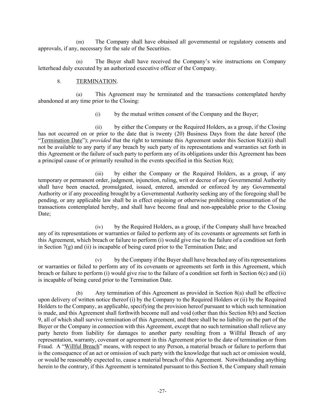 -27- (m) The Company shall have obtained all governmental or regulatory consents and approvals, if any, necessary for the sale of the Securities. (n) The Buyer shall have received the Company’s wire instructions on Company letterhead duly executed by an authorized executive officer of the Company. 8. TERMINATION. (a) This Agreement may be terminated and the transactions contemplated hereby abandoned at any time prior to the Closing: (i) by the mutual written consent of the Company and the Buyer; (ii) by either the Company or the Required Holders, as a group, if the Closing has not occurred on or prior to the date that is twenty (20) Business Days from the date hereof (the “Termination Date”); provided that the right to terminate this Agreement under this Section 8(a)(ii) shall not be available to any party if any breach by such party of its representations and warranties set forth in this Agreement or the failure of such party to perform any of its obligations under this Agreement has been a principal cause of or primarily resulted in the events specified in this Section 8(a); (iii) by either the Company or the Required Holders, as a group, if any temporary or permanent order, judgment, injunction, ruling, writ or decree of any Governmental Authority shall have been enacted, promulgated, issued, entered, amended or enforced by any Governmental Authority or if any proceeding brought by a Governmental Authority seeking any of the foregoing shall be pending, or any applicable law shall be in effect enjoining or otherwise prohibiting consummation of the transactions contemplated hereby, and shall have become final and non-appealable prior to the Closing Date; (iv) by the Required Holders, as a group, if the Company shall have breached any of its representations or warranties or failed to perform any of its covenants or agreements set forth in this Agreement, which breach or failure to perform (i) would give rise to the failure of a condition set forth in Section 7(g) and (ii) is incapable of being cured prior to the Termination Date; and (v) by the Company if the Buyer shall have breached any of its representations or warranties or failed to perform any of its covenants or agreements set forth in this Agreement, which breach or failure to perform (i) would give rise to the failure of a condition set forth in Section 6(c) and (ii) is incapable of being cured prior to the Termination Date. (b) Any termination of this Agreement as provided in Section 8(a) shall be effective upon delivery of written notice thereof (i) by the Company to the Required Holders or (ii) by the Required Holders to the Company, as applicable, specifying the provision hereof pursuant to which such termination is made, and this Agreement shall forthwith become null and void (other than this Section 8(b) and Section 9, all of which shall survive termination of this Agreement, and there shall be no liability on the part of the Buyer or the Company in connection with this Agreement, except that no such termination shall relieve any party hereto from liability for damages to another party resulting from a Willful Breach of any representation, warranty, covenant or agreement in this Agreement prior to the date of termination or from Fraud. A “Willful Breach” means, with respect to any Person, a material breach or failure to perform that is the consequence of an act or omission of such party with the knowledge that such act or omission would, or would be reasonably expected to, cause a material breach of this Agreement. Notwithstanding anything herein to the contrary, if this Agreement is terminated pursuant to this Section 8, the Company shall remain