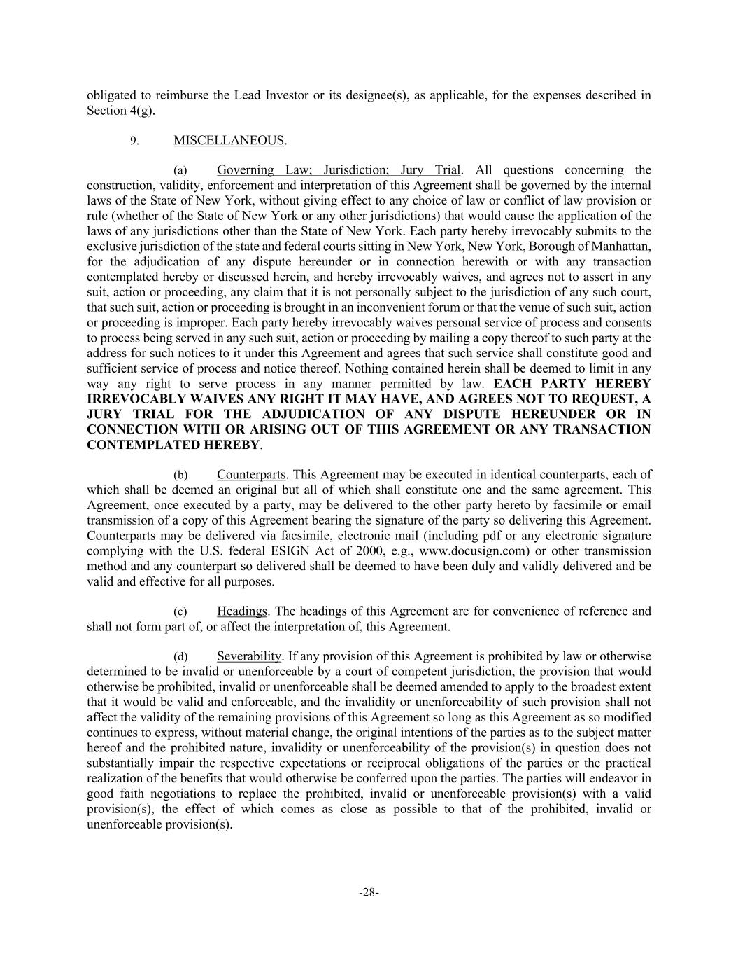 -28- obligated to reimburse the Lead Investor or its designee(s), as applicable, for the expenses described in Section 4(g). 9. MISCELLANEOUS. (a) Governing Law; Jurisdiction; Jury Trial. All questions concerning the construction, validity, enforcement and interpretation of this Agreement shall be governed by the internal laws of the State of New York, without giving effect to any choice of law or conflict of law provision or rule (whether of the State of New York or any other jurisdictions) that would cause the application of the laws of any jurisdictions other than the State of New York. Each party hereby irrevocably submits to the exclusive jurisdiction of the state and federal courts sitting in New York, New York, Borough of Manhattan, for the adjudication of any dispute hereunder or in connection herewith or with any transaction contemplated hereby or discussed herein, and hereby irrevocably waives, and agrees not to assert in any suit, action or proceeding, any claim that it is not personally subject to the jurisdiction of any such court, that such suit, action or proceeding is brought in an inconvenient forum or that the venue of such suit, action or proceeding is improper. Each party hereby irrevocably waives personal service of process and consents to process being served in any such suit, action or proceeding by mailing a copy thereof to such party at the address for such notices to it under this Agreement and agrees that such service shall constitute good and sufficient service of process and notice thereof. Nothing contained herein shall be deemed to limit in any way any right to serve process in any manner permitted by law. EACH PARTY HEREBY IRREVOCABLY WAIVES ANY RIGHT IT MAY HAVE, AND AGREES NOT TO REQUEST, A JURY TRIAL FOR THE ADJUDICATION OF ANY DISPUTE HEREUNDER OR IN CONNECTION WITH OR ARISING OUT OF THIS AGREEMENT OR ANY TRANSACTION CONTEMPLATED HEREBY. (b) Counterparts. This Agreement may be executed in identical counterparts, each of which shall be deemed an original but all of which shall constitute one and the same agreement. This Agreement, once executed by a party, may be delivered to the other party hereto by facsimile or email transmission of a copy of this Agreement bearing the signature of the party so delivering this Agreement. Counterparts may be delivered via facsimile, electronic mail (including pdf or any electronic signature complying with the U.S. federal ESIGN Act of 2000, e.g., www.docusign.com) or other transmission method and any counterpart so delivered shall be deemed to have been duly and validly delivered and be valid and effective for all purposes. (c) Headings. The headings of this Agreement are for convenience of reference and shall not form part of, or affect the interpretation of, this Agreement. (d) Severability. If any provision of this Agreement is prohibited by law or otherwise determined to be invalid or unenforceable by a court of competent jurisdiction, the provision that would otherwise be prohibited, invalid or unenforceable shall be deemed amended to apply to the broadest extent that it would be valid and enforceable, and the invalidity or unenforceability of such provision shall not affect the validity of the remaining provisions of this Agreement so long as this Agreement as so modified continues to express, without material change, the original intentions of the parties as to the subject matter hereof and the prohibited nature, invalidity or unenforceability of the provision(s) in question does not substantially impair the respective expectations or reciprocal obligations of the parties or the practical realization of the benefits that would otherwise be conferred upon the parties. The parties will endeavor in good faith negotiations to replace the prohibited, invalid or unenforceable provision(s) with a valid provision(s), the effect of which comes as close as possible to that of the prohibited, invalid or unenforceable provision(s).