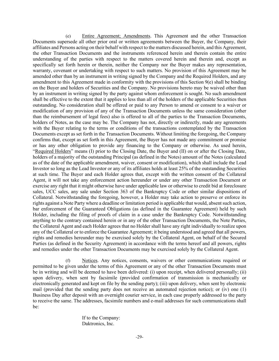 -29- (e) Entire Agreement; Amendments. This Agreement and the other Transaction Documents supersede all other prior oral or written agreements between the Buyer, the Company, their affiliates and Persons acting on their behalf with respect to the matters discussed herein, and this Agreement, the other Transaction Documents and the instruments referenced herein and therein contain the entire understanding of the parties with respect to the matters covered herein and therein and, except as specifically set forth herein or therein, neither the Company nor the Buyer makes any representation, warranty, covenant or undertaking with respect to such matters. No provision of this Agreement may be amended other than by an instrument in writing signed by the Company and the Required Holders, and any amendment to this Agreement made in conformity with the provisions of this Section 9(e) shall be binding on the Buyer and holders of Securities and the Company. No provisions hereto may be waived other than by an instrument in writing signed by the party against whom enforcement is sought. No such amendment shall be effective to the extent that it applies to less than all of the holders of the applicable Securities then outstanding. No consideration shall be offered or paid to any Person to amend or consent to a waiver or modification of any provision of any of the Transaction Documents unless the same consideration (other than the reimbursement of legal fees) also is offered to all of the parties to the Transaction Documents, holders of Notes, as the case may be. The Company has not, directly or indirectly, made any agreements with the Buyer relating to the terms or conditions of the transactions contemplated by the Transaction Documents except as set forth in the Transaction Documents. Without limiting the foregoing, the Company confirms that, except as set forth in this Agreement, the Buyer has not made any commitment or promise or has any other obligation to provide any financing to the Company or otherwise. As used herein, “Required Holders” means (I) prior to the Closing Date, the Buyer and (II) on or after the Closing Date, holders of a majority of the outstanding Principal (as defined in the Notes) amount of the Notes (calculated as of the date of the applicable amendment, waiver, consent or modification), which shall include the Lead Investor so long as the Lead Investor or any of its affiliates holds at least 25% of the outstanding Securities at such time. The Buyer and each Holder agrees that, except with the written consent of the Collateral Agent, it will not take any enforcement action hereunder or under any other Transaction Document or exercise any right that it might otherwise have under applicable law or otherwise to credit bid at foreclosure sales, UCC sales, any sale under Section 363 of the Bankruptcy Code or other similar dispositions of Collateral. Notwithstanding the foregoing, however, a Holder may take action to preserve or enforce its rights against a Note Party where a deadline or limitation period is applicable that would, absent such action, bar enforcement of the Guaranteed Obligations (as defined in the Guarantee Agreement) held by such Holder, including the filing of proofs of claim in a case under the Bankruptcy Code. Notwithstanding anything to the contrary contained herein or in any of the other Transaction Documents, the Note Parties, the Collateral Agent and each Holder agrees that no Holder shall have any right individually to realize upon any of the Collateral or to enforce the Guarantee Agreement; it being understood and agreed that all powers, rights and remedies hereunder may be exercised solely by the Collateral Agent, on behalf of the Secured Parties (as defined in the Security Agreement) in accordance with the terms hereof and all powers, rights and remedies under the other Transaction Documents may be exercised solely by the Collateral Agent. (f) Notices. Any notices, consents, waivers or other communications required or permitted to be given under the terms of this Agreement or any of the other Transaction Documents must be in writing and will be deemed to have been delivered: (i) upon receipt, when delivered personally; (ii) upon delivery, when sent by facsimile (provided confirmation of transmission is mechanically or electronically generated and kept on file by the sending party); (iii) upon delivery, when sent by electronic mail (provided that the sending party does not receive an automated rejection notice); or (iv) one (1) Business Day after deposit with an overnight courier service, in each case properly addressed to the party to receive the same. The addresses, facsimile numbers and e-mail addresses for such communications shall be: If to the Company: Daktronics, Inc.