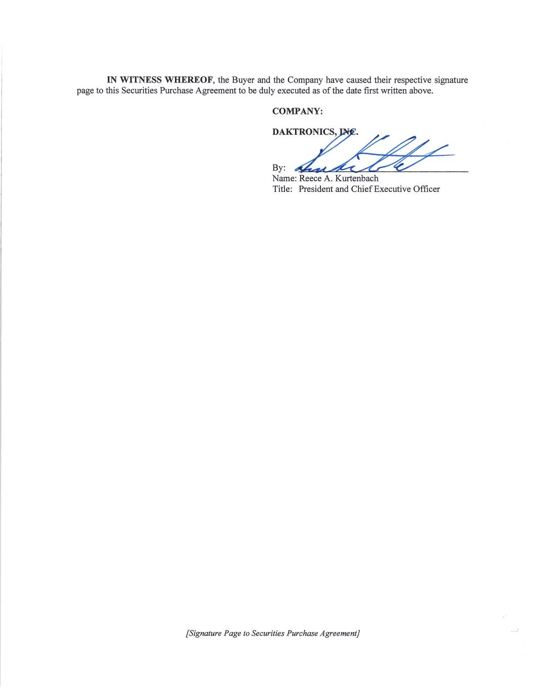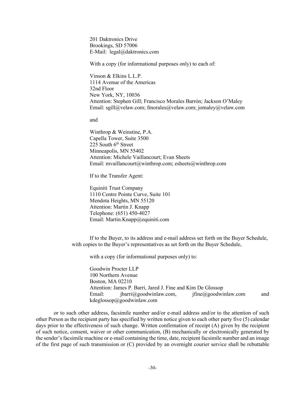 -30- 201 Daktronics Drive Brookings, SD 57006 E-Mail: legal@daktronics.com With a copy (for informational purposes only) to each of: Vinson & Elkins L.L.P. 1114 Avenue of the Americas 32nd Floor New York, NY, 10036 Attention: Stephen Gill; Francisco Morales Barrón; Jackson O’Maley Email: sgill@velaw.com; fmorales@velaw.com; jomaley@velaw.com and Winthrop & Weinstine, P.A. Capella Tower, Suite 3500 225 South 6th Street Minneapolis, MN 55402 Attention: Michele Vaillancourt; Evan Sheets Email: mvaillancourt@winthrop.com; esheets@winthrop.com If to the Transfer Agent: Equiniti Trust Company 1110 Centre Pointe Curve, Suite 101 Mendota Heights, MN 55120 Attention: Martin J. Knapp Telephone: (651) 450-4027 Email: Martin.Knapp@equiniti.com If to the Buyer, to its address and e-mail address set forth on the Buyer Schedule, with copies to the Buyer’s representatives as set forth on the Buyer Schedule, with a copy (for informational purposes only) to: Goodwin Procter LLP 100 Northern Avenue Boston, MA 02210 Attention: James P. Barri, Jared J. Fine and Kim De Glossop Email: jbarri@goodwinlaw.com, jfine@goodwinlaw.com and kdeglossop@goodwinlaw.com or to such other address, facsimile number and/or e-mail address and/or to the attention of such other Person as the recipient party has specified by written notice given to each other party five (5) calendar days prior to the effectiveness of such change. Written confirmation of receipt (A) given by the recipient of such notice, consent, waiver or other communication, (B) mechanically or electronically generated by the sender’s facsimile machine or e-mail containing the time, date, recipient facsimile number and an image of the first page of such transmission or (C) provided by an overnight courier service shall be rebuttable