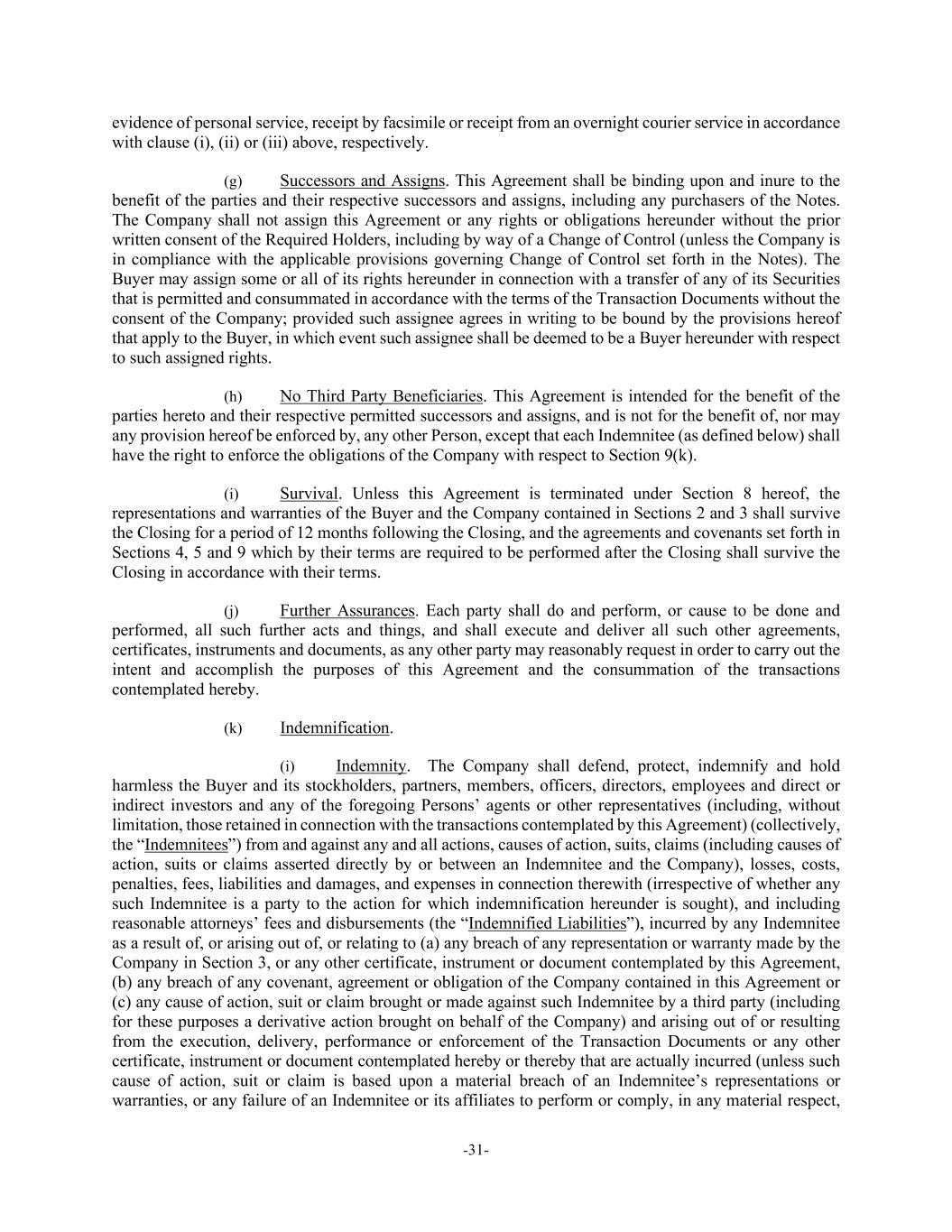 -31- evidence of personal service, receipt by facsimile or receipt from an overnight courier service in accordance with clause (i), (ii) or (iii) above, respectively. (g) Successors and Assigns. This Agreement shall be binding upon and inure to the benefit of the parties and their respective successors and assigns, including any purchasers of the Notes. The Company shall not assign this Agreement or any rights or obligations hereunder without the prior written consent of the Required Holders, including by way of a Change of Control (unless the Company is in compliance with the applicable provisions governing Change of Control set forth in the Notes). The Buyer may assign some or all of its rights hereunder in connection with a transfer of any of its Securities that is permitted and consummated in accordance with the terms of the Transaction Documents without the consent of the Company; provided such assignee agrees in writing to be bound by the provisions hereof that apply to the Buyer, in which event such assignee shall be deemed to be a Buyer hereunder with respect to such assigned rights. (h) No Third Party Beneficiaries. This Agreement is intended for the benefit of the parties hereto and their respective permitted successors and assigns, and is not for the benefit of, nor may any provision hereof be enforced by, any other Person, except that each Indemnitee (as defined below) shall have the right to enforce the obligations of the Company with respect to Section 9(k). (i) Survival. Unless this Agreement is terminated under Section 8 hereof, the representations and warranties of the Buyer and the Company contained in Sections 2 and 3 shall survive the Closing for a period of 12 months following the Closing, and the agreements and covenants set forth in Sections 4, 5 and 9 which by their terms are required to be performed after the Closing shall survive the Closing in accordance with their terms. (j) Further Assurances. Each party shall do and perform, or cause to be done and performed, all such further acts and things, and shall execute and deliver all such other agreements, certificates, instruments and documents, as any other party may reasonably request in order to carry out the intent and accomplish the purposes of this Agreement and the consummation of the transactions contemplated hereby. (k) Indemnification. (i) Indemnity. The Company shall defend, protect, indemnify and hold harmless the Buyer and its stockholders, partners, members, officers, directors, employees and direct or indirect investors and any of the foregoing Persons’ agents or other representatives (including, without limitation, those retained in connection with the transactions contemplated by this Agreement) (collectively, the “Indemnitees”) from and against any and all actions, causes of action, suits, claims (including causes of action, suits or claims asserted directly by or between an Indemnitee and the Company), losses, costs, penalties, fees, liabilities and damages, and expenses in connection therewith (irrespective of whether any such Indemnitee is a party to the action for which indemnification hereunder is sought), and including reasonable attorneys’ fees and disbursements (the “Indemnified Liabilities”), incurred by any Indemnitee as a result of, or arising out of, or relating to (a) any breach of any representation or warranty made by the Company in Section 3, or any other certificate, instrument or document contemplated by this Agreement, (b) any breach of any covenant, agreement or obligation of the Company contained in this Agreement or (c) any cause of action, suit or claim brought or made against such Indemnitee by a third party (including for these purposes a derivative action brought on behalf of the Company) and arising out of or resulting from the execution, delivery, performance or enforcement of the Transaction Documents or any other certificate, instrument or document contemplated hereby or thereby that are actually incurred (unless such cause of action, suit or claim is based upon a material breach of an Indemnitee’s representations or warranties, or any failure of an Indemnitee or its affiliates to perform or comply, in any material respect,